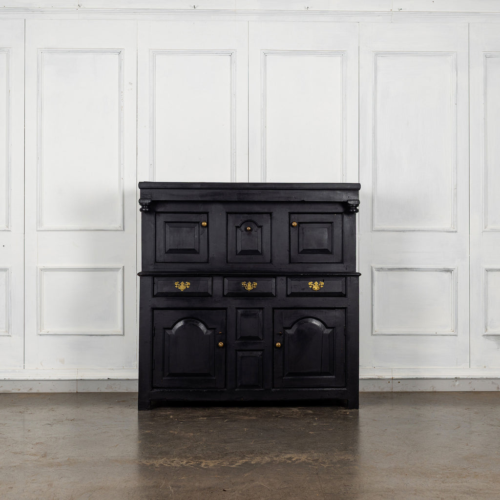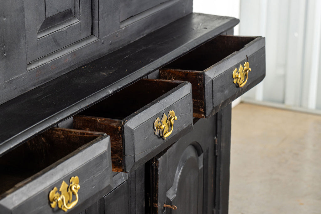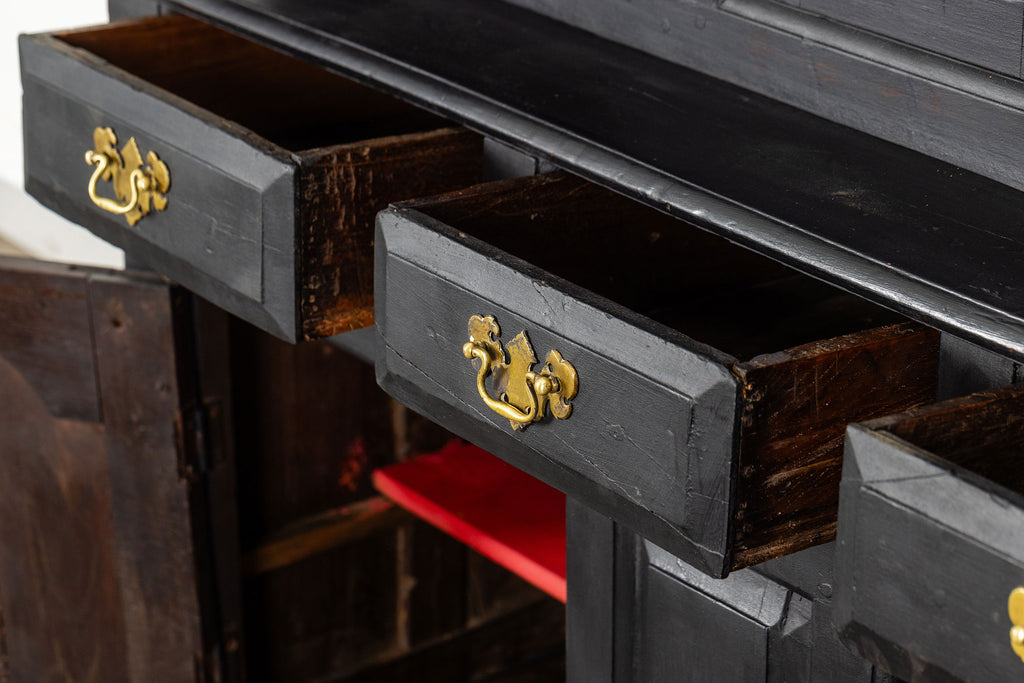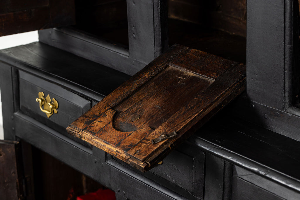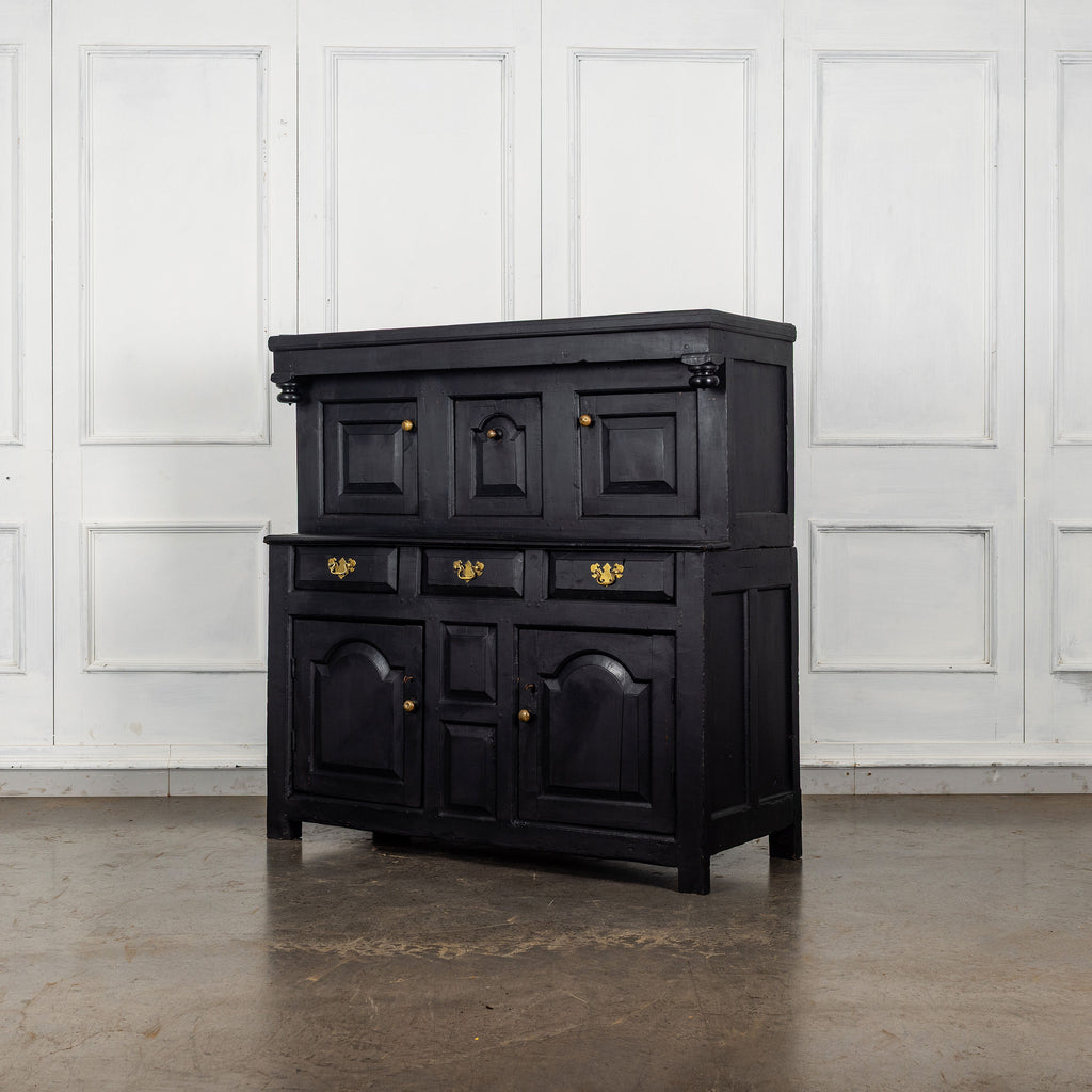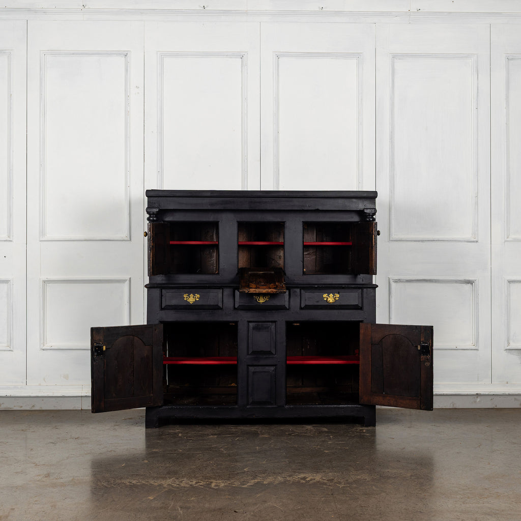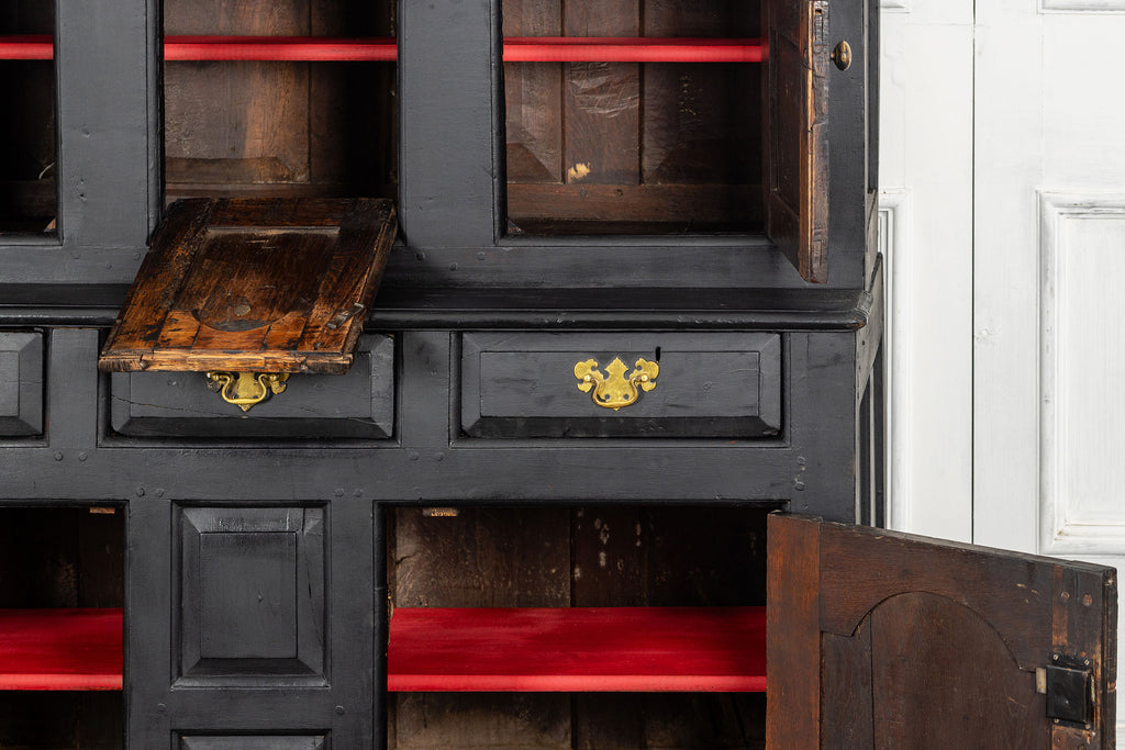 Early 18th Century Welsh Oak Cwpwrdd Dauddarn, two part cupboard, ebsonised to a most beautiful finish for this absolutely delighful piece of furniture, brass knobs and handles with locks and latches of good quality, condition and in working order with original key. The red shelves also add a rebellious surprise and are in keeping with the characater of this very special 'cwpwrdd bach' little cupboard.