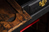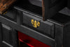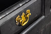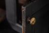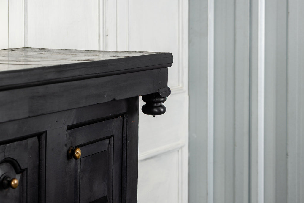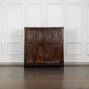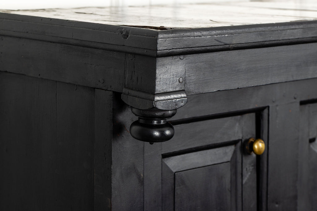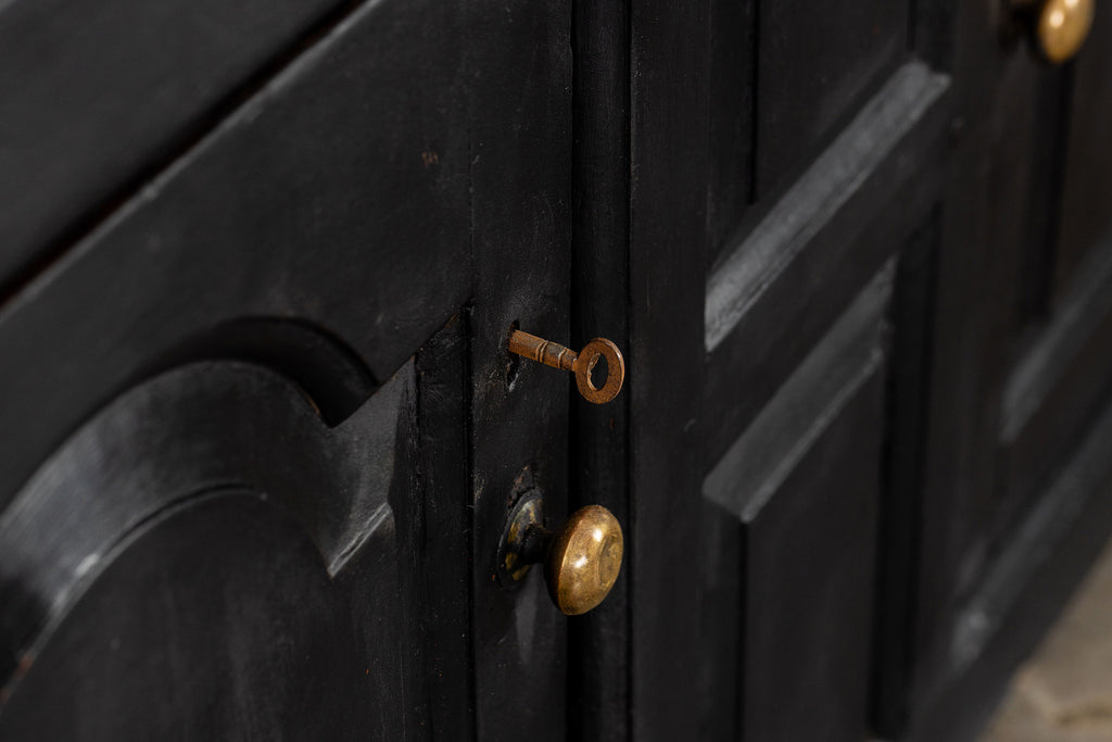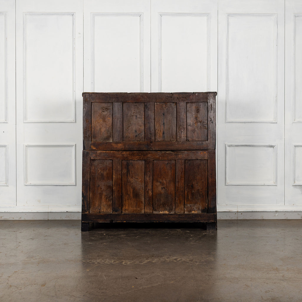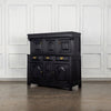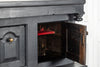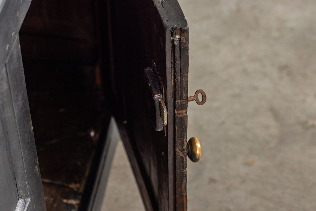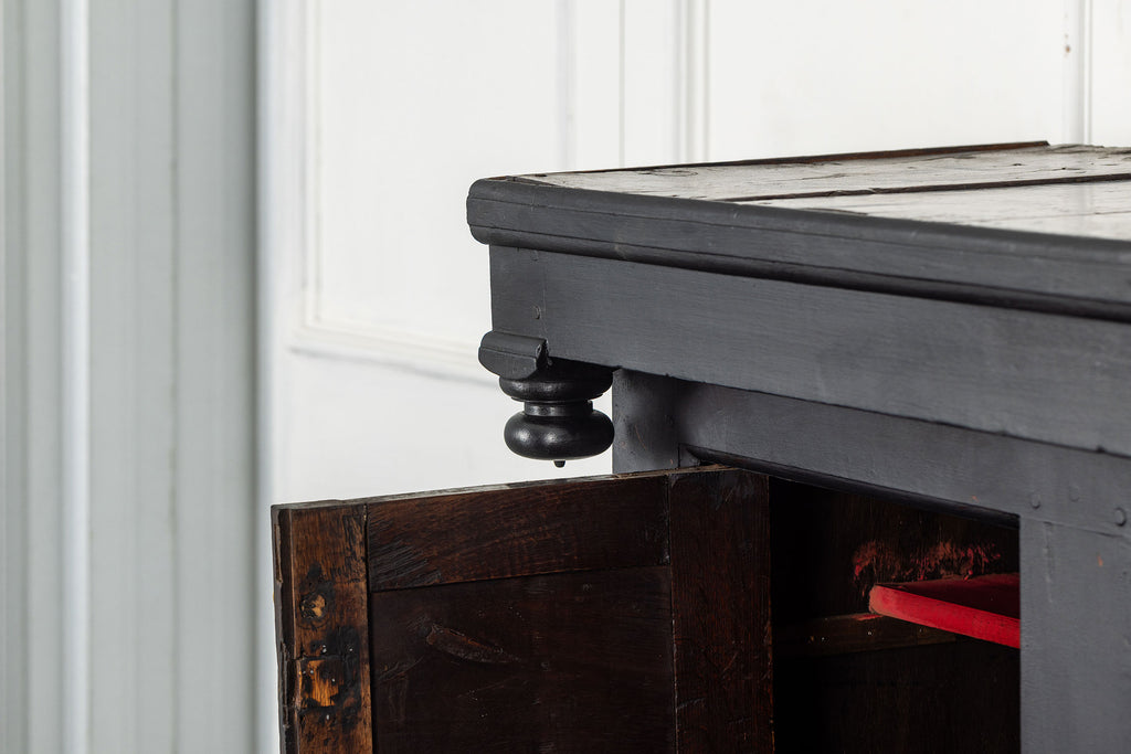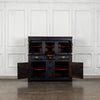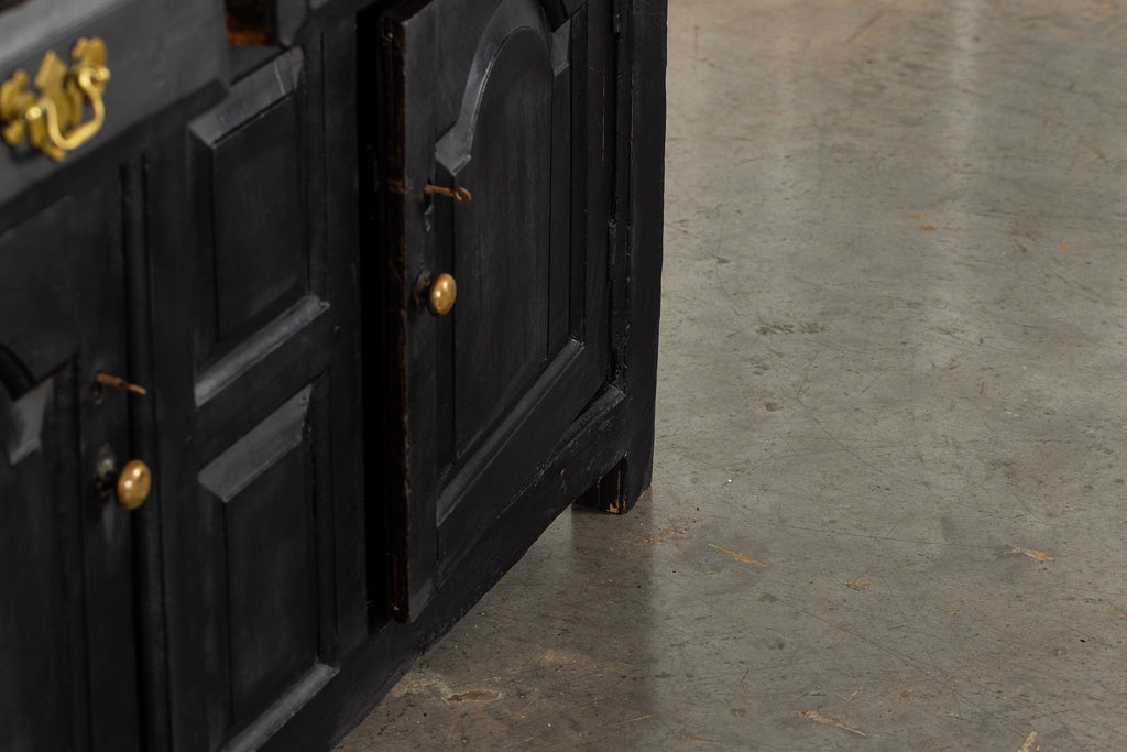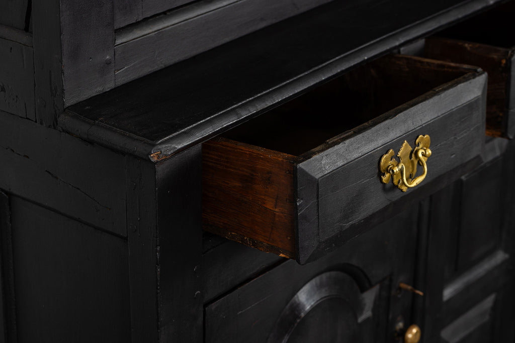 Early 18th Century Welsh Oak Cwpwrdd Dauddarn, two part cupboard, ebsonised to a most beautiful finish for this absolutely delighful piece of furniture, brass knobs and handles with locks and latches of good quality, condition and in working order with original key. The red shelves also add a rebellious surprise and are in keeping with the characater of this very special 'cwpwrdd bach' little cupboard.