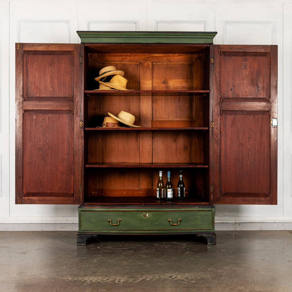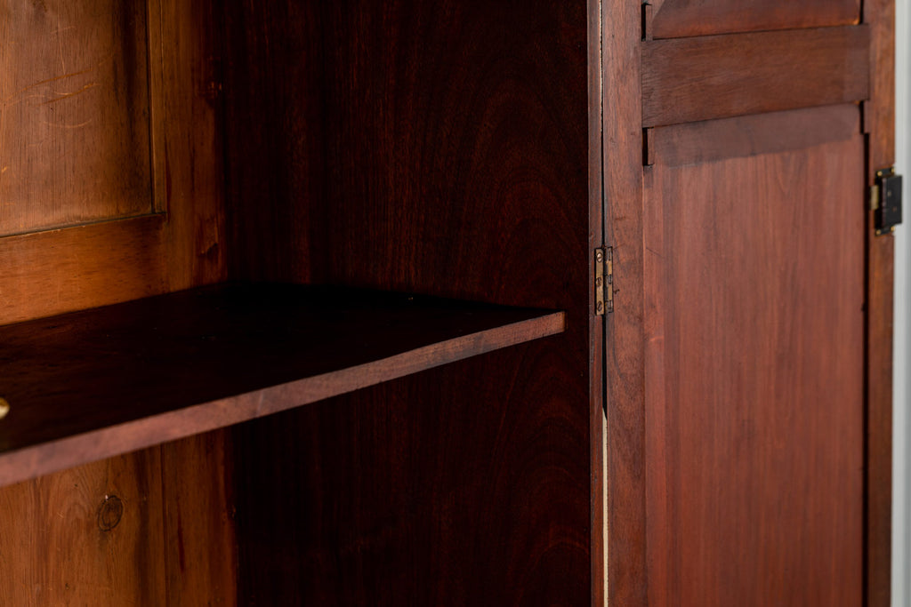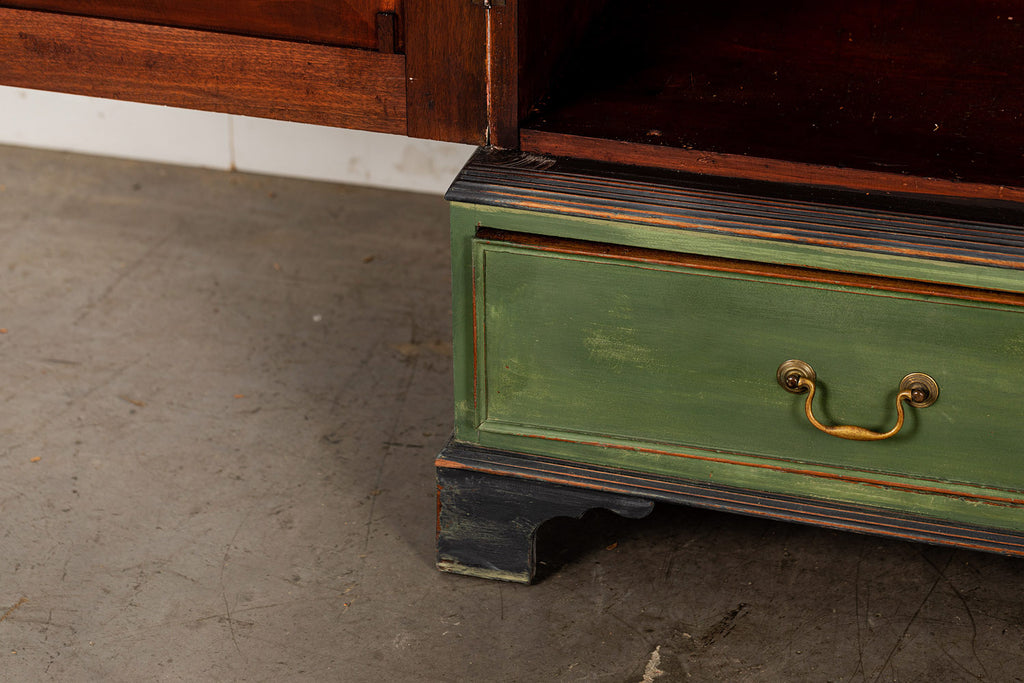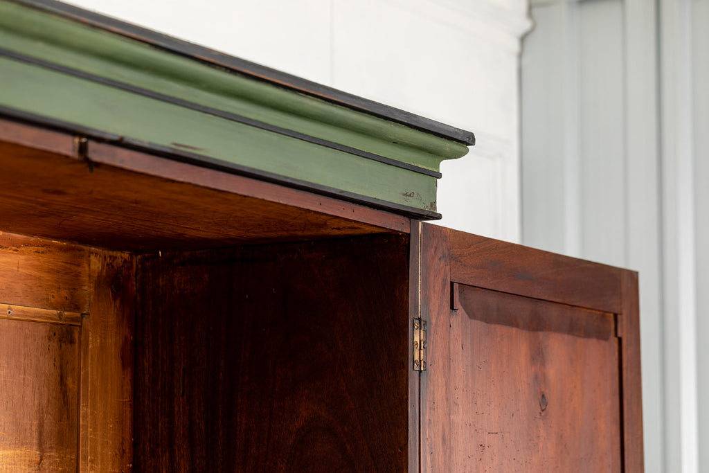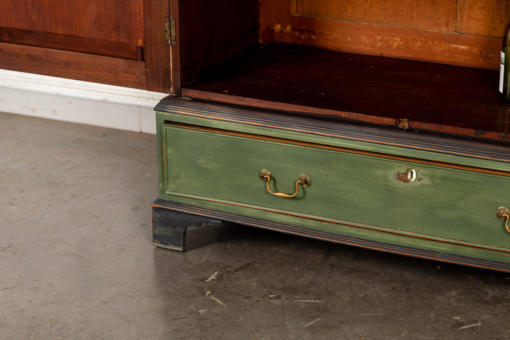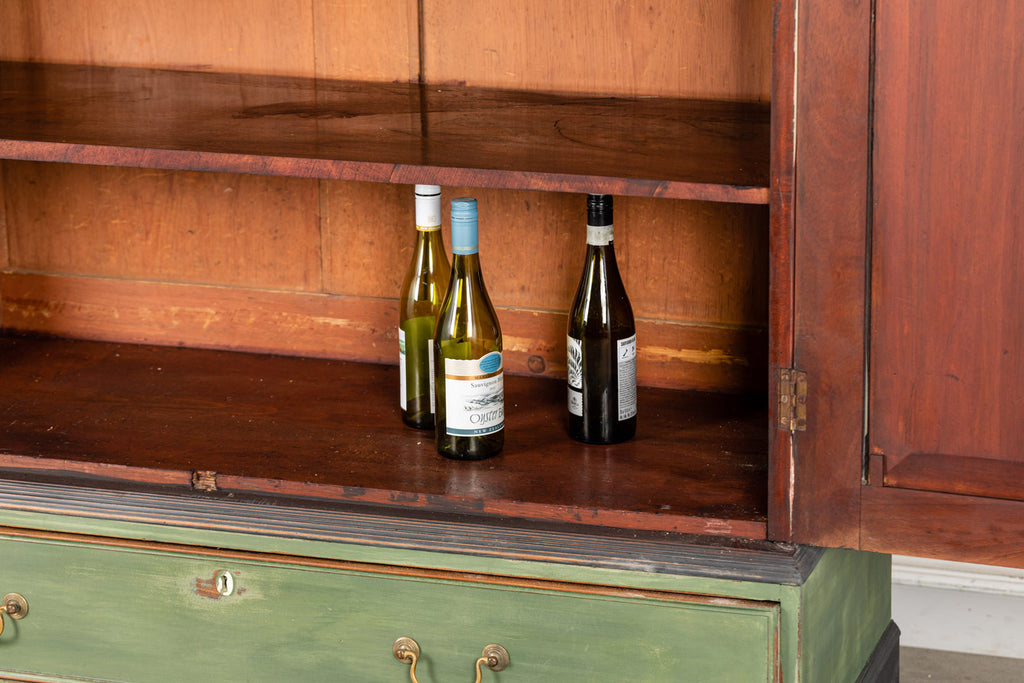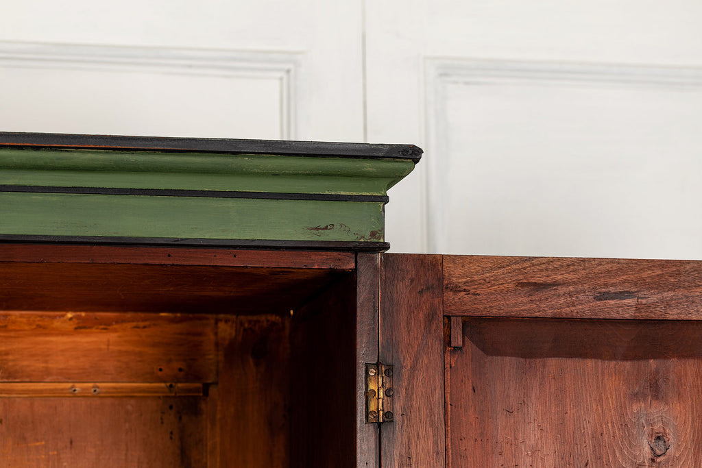 George 111 mahogany cupboard - later decorated and with solid mahogany shelves. Comes in two parts for ease of transport.