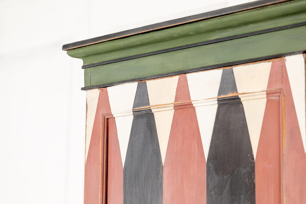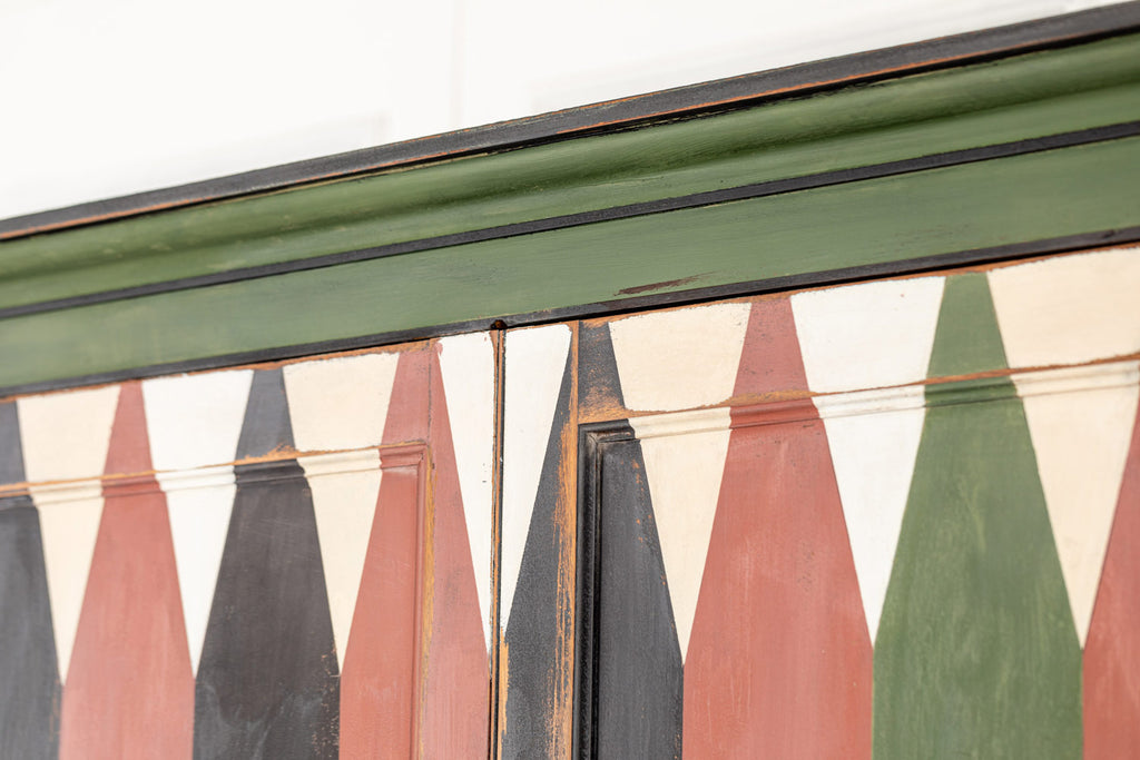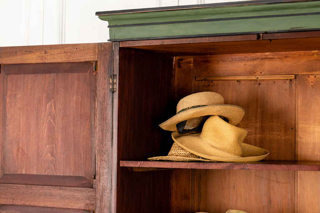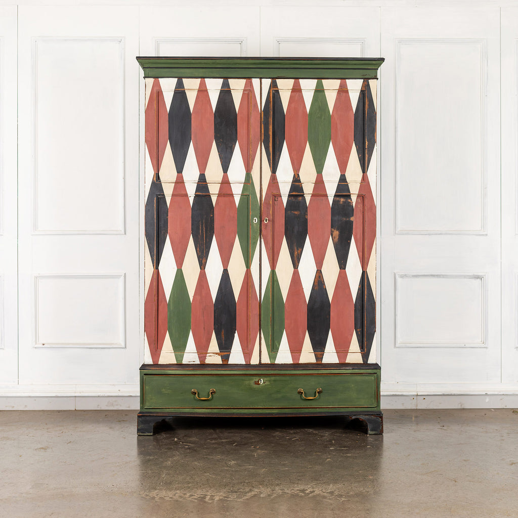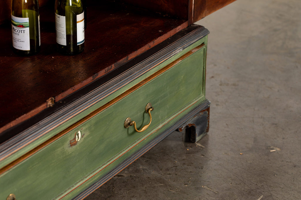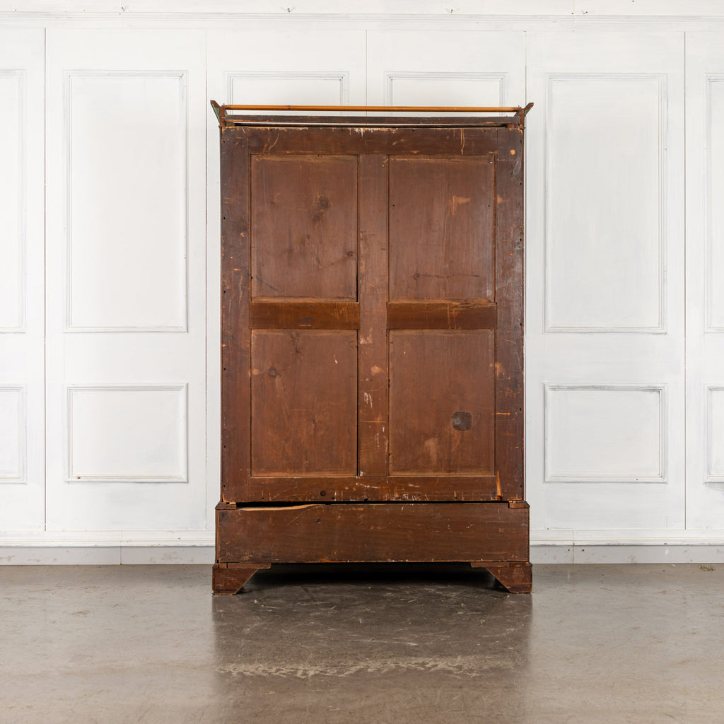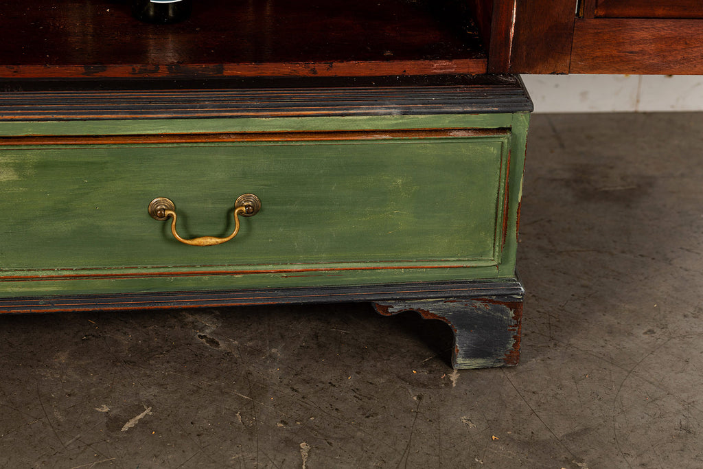 George 111 mahogany cupboard - later decorated and with solid mahogany shelves. Comes in two parts for ease of transport.