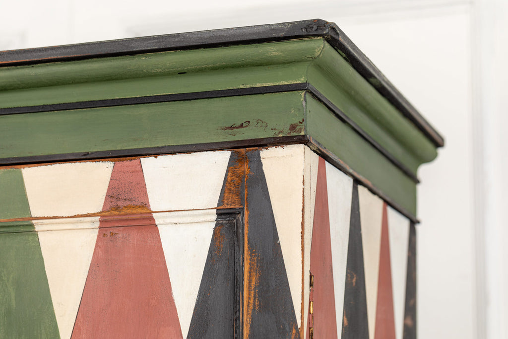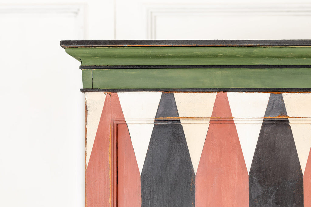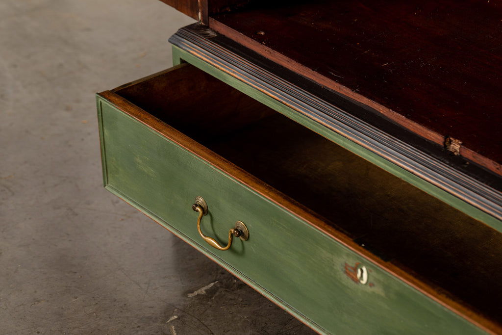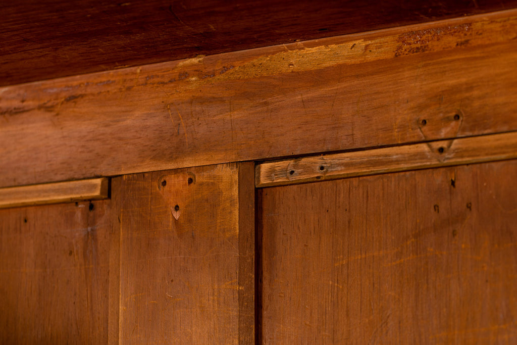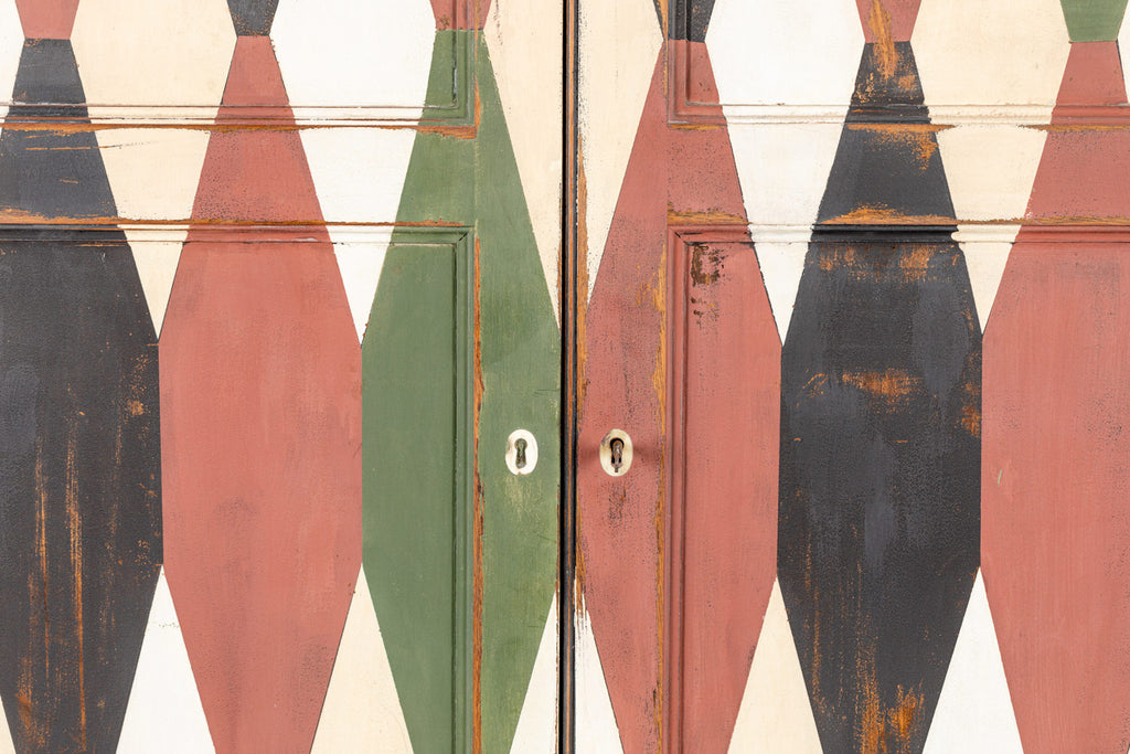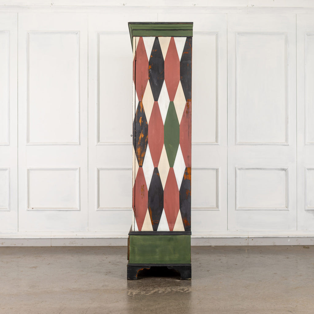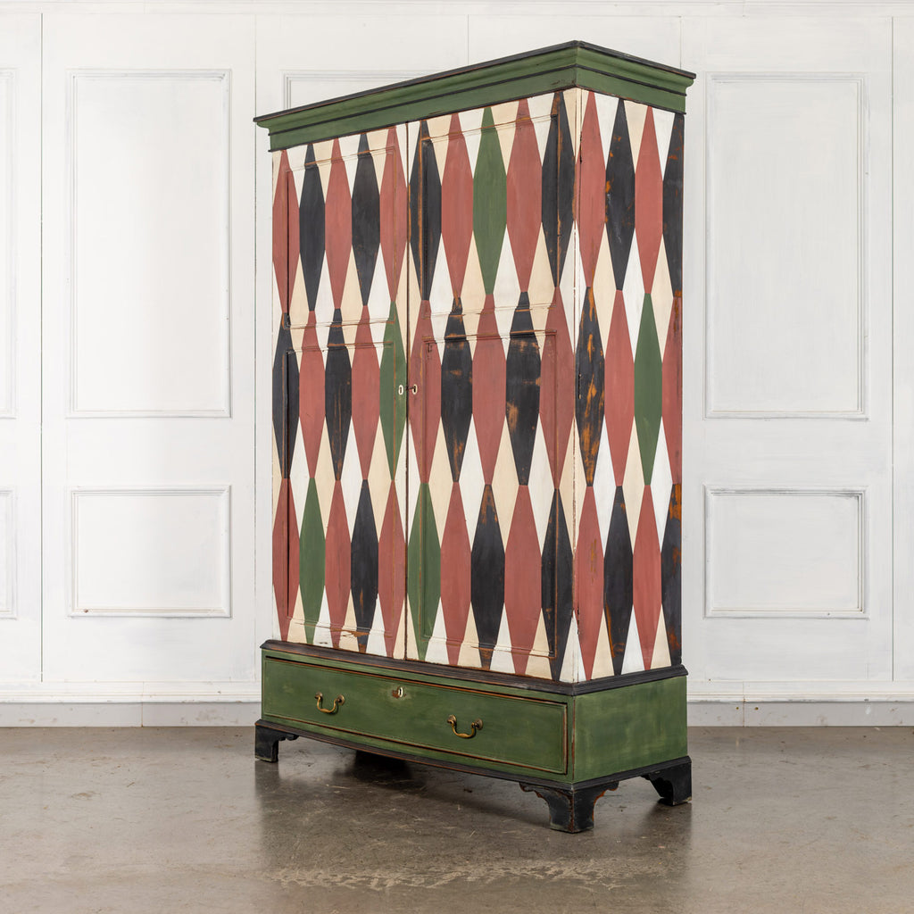 George 111 mahogany cupboard - later decorated and with solid mahogany shelves. Comes in two parts for ease of transport.