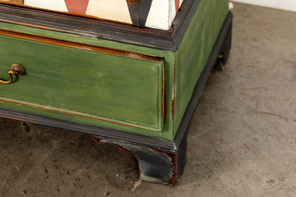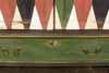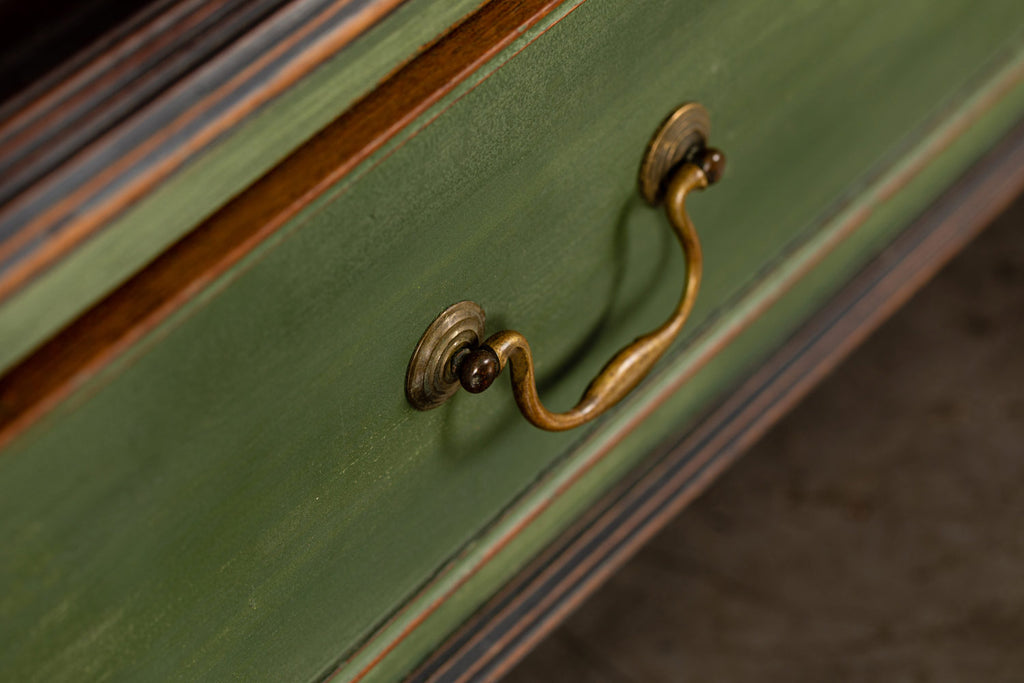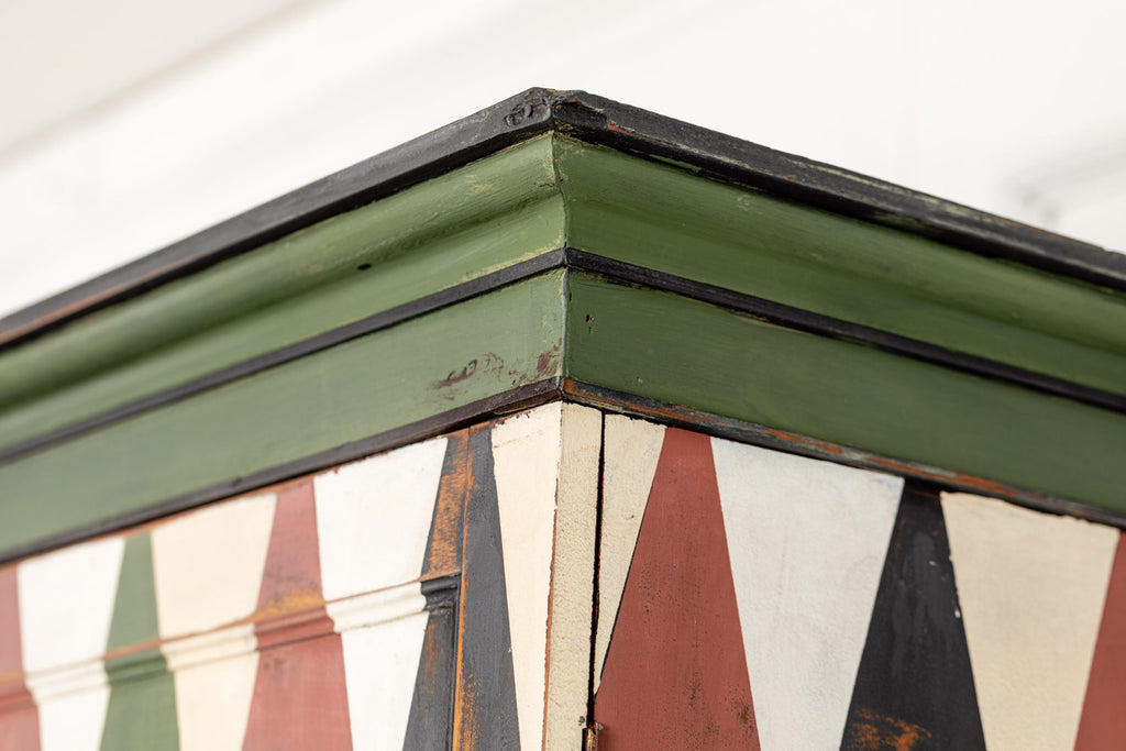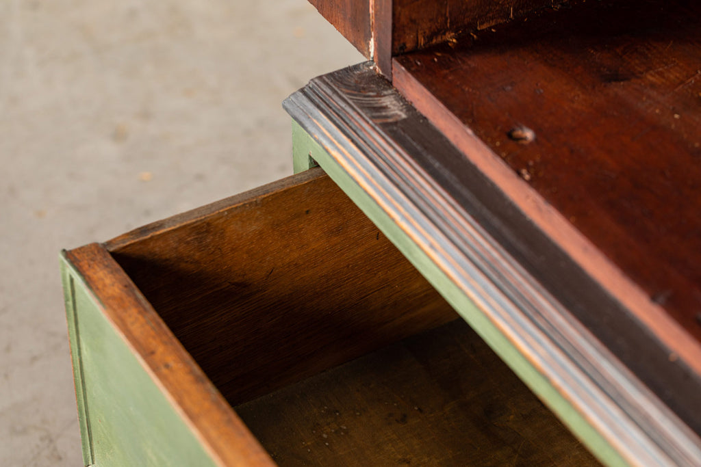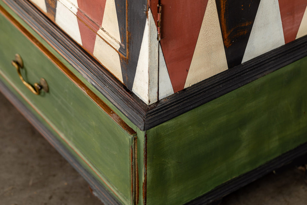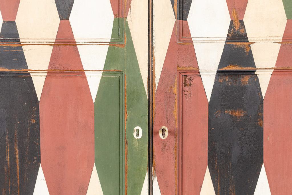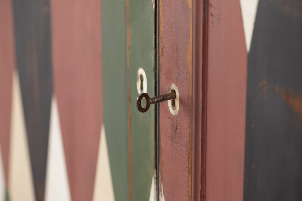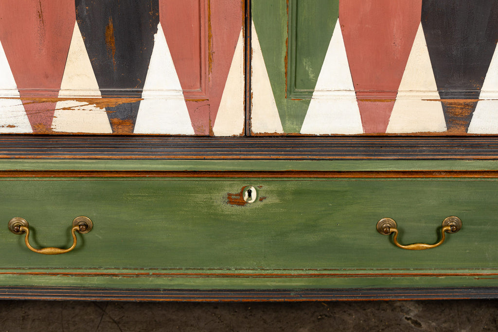 George 111 mahogany cupboard - later decorated and with solid mahogany shelves. Comes in two parts for ease of transport.