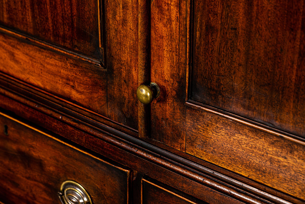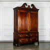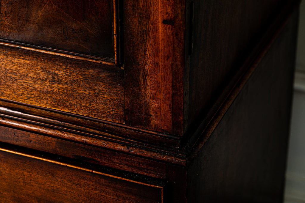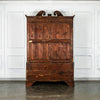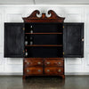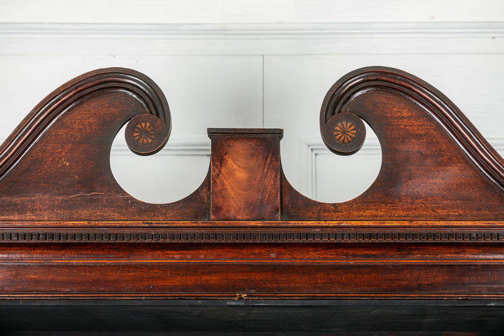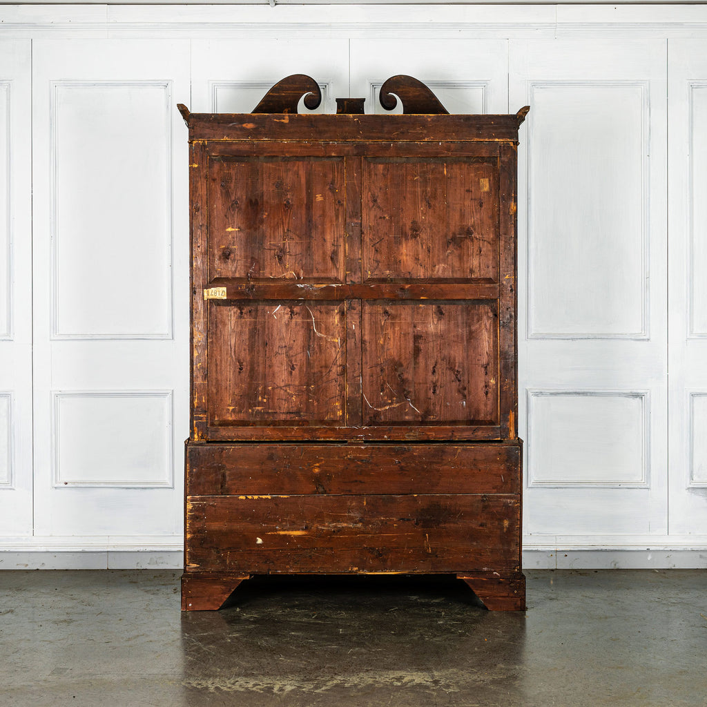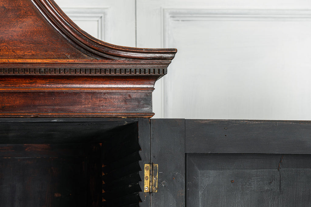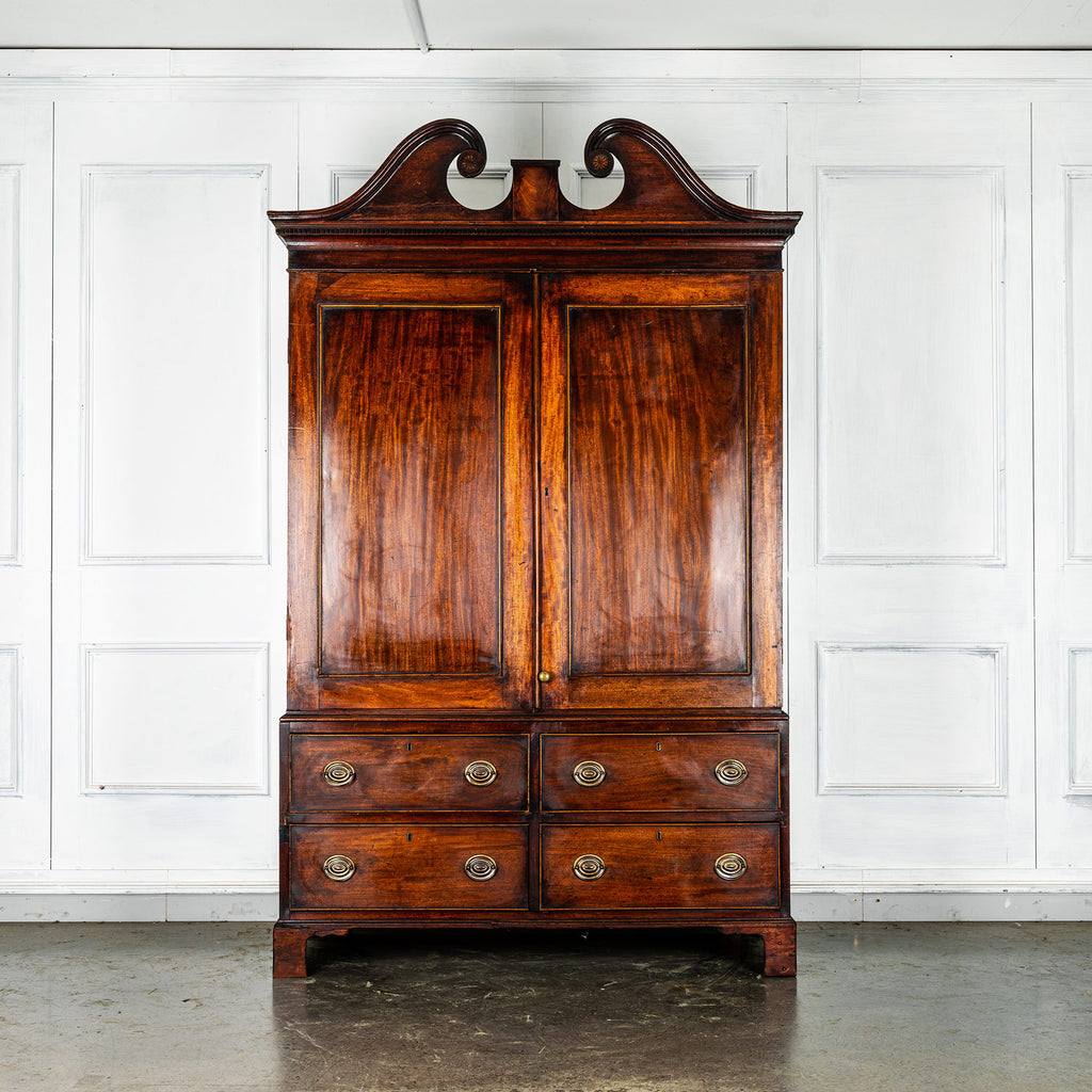 Wonderful George 111 mahogany linen press with broken swan neck architectural pediment, over a pair of rectangular panelled doors, enclosing a later painted and shelved interior - with period mahogany planks on bracket feet. A fabulous kitchen cupboard or storage space with a pile of style.