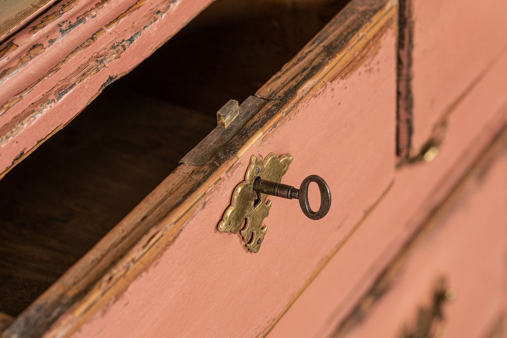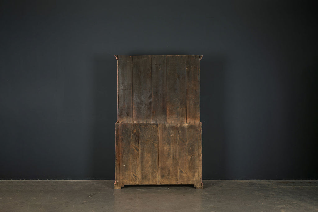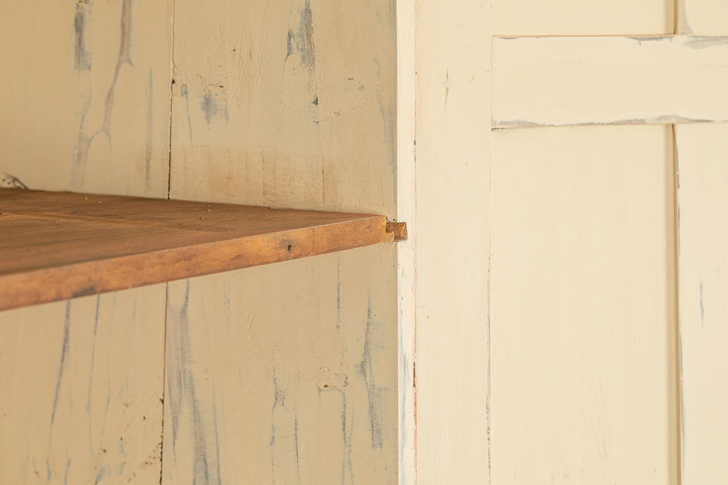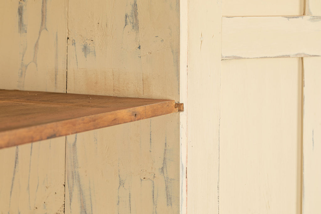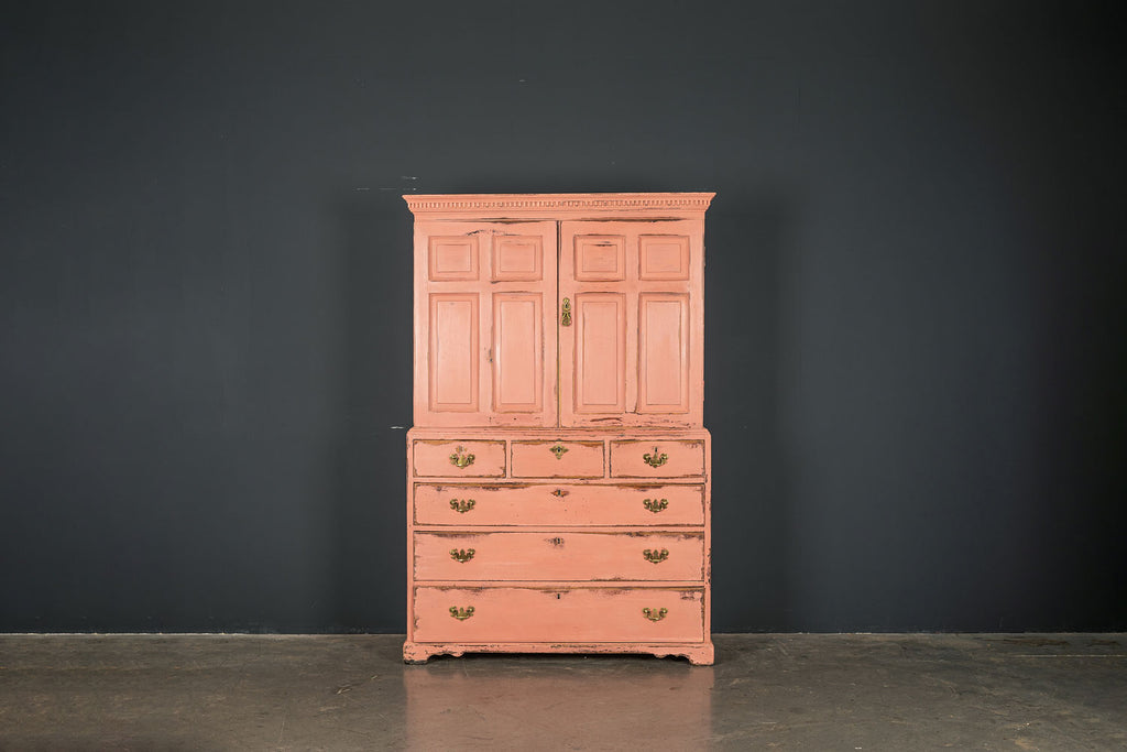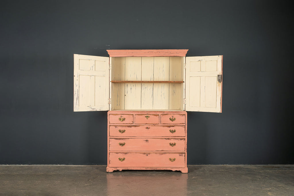 Lovely pine house keeper’s cupboard with two panelled doors enclosing removable shelves over three short drawers and three long drawers with attractive period brass handles and escutcheons.  Key present with working lock and latches. A lovely country piece with an original back, always a good sign.