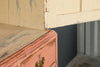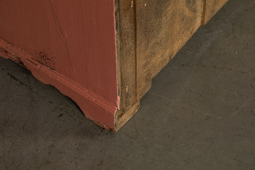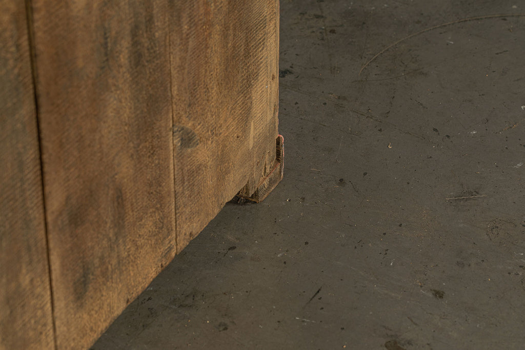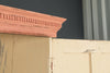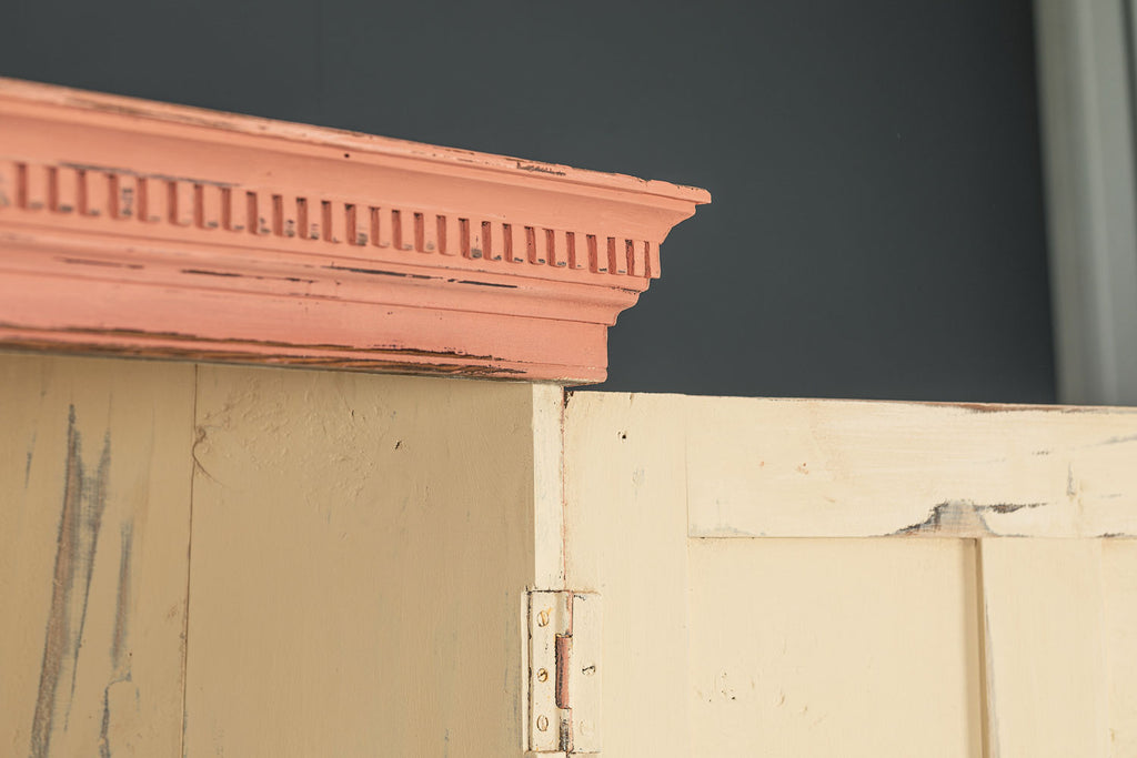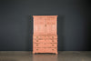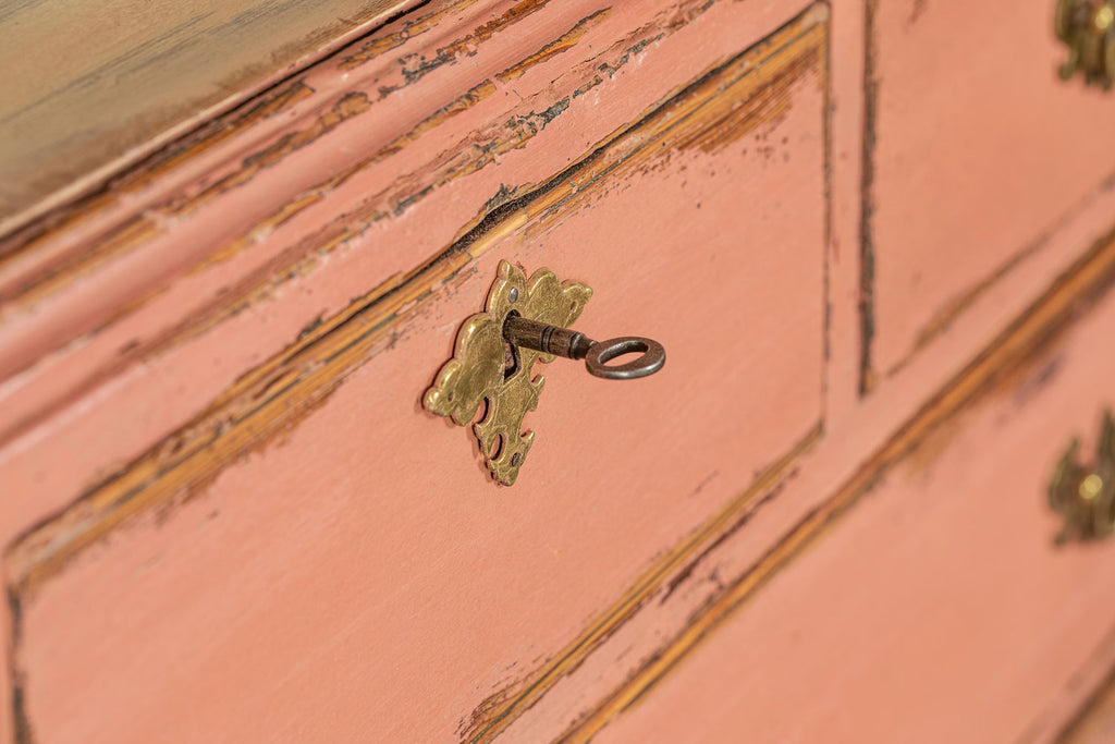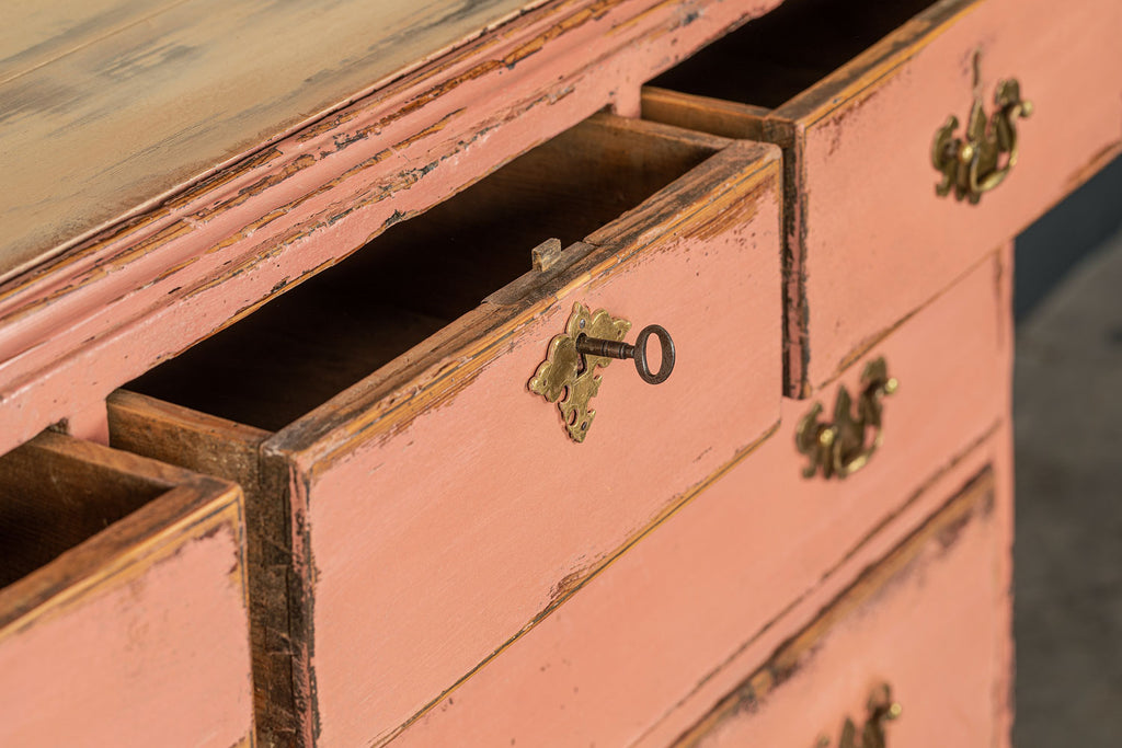 Lovely pine house keeper’s cupboard with two panelled doors enclosing removable shelves over three short drawers and three long drawers with attractive period brass handles and escutcheons.  Key present with working lock and latches. A lovely country piece with an original back, always a good sign.