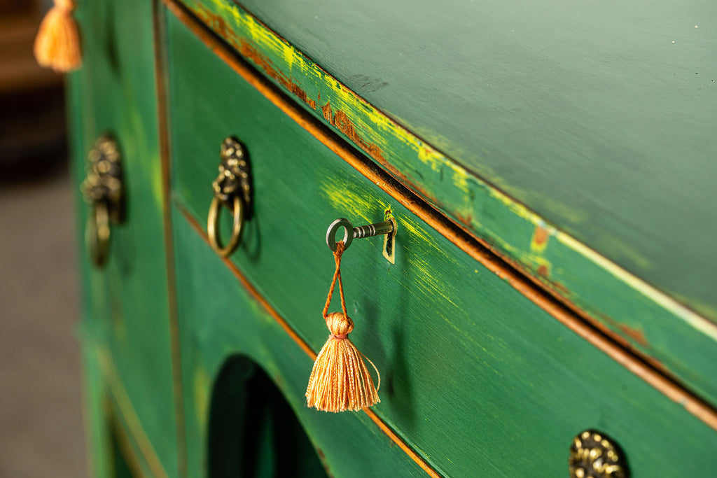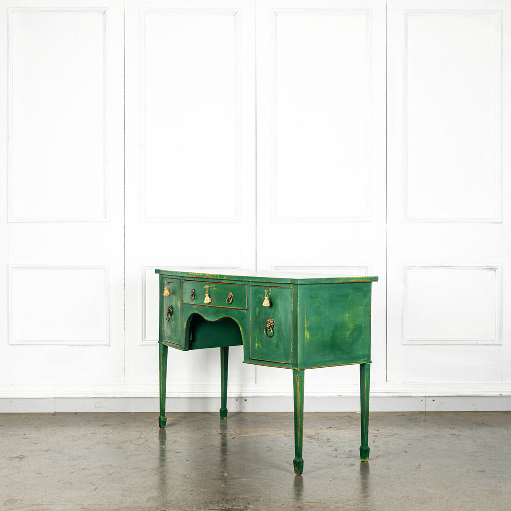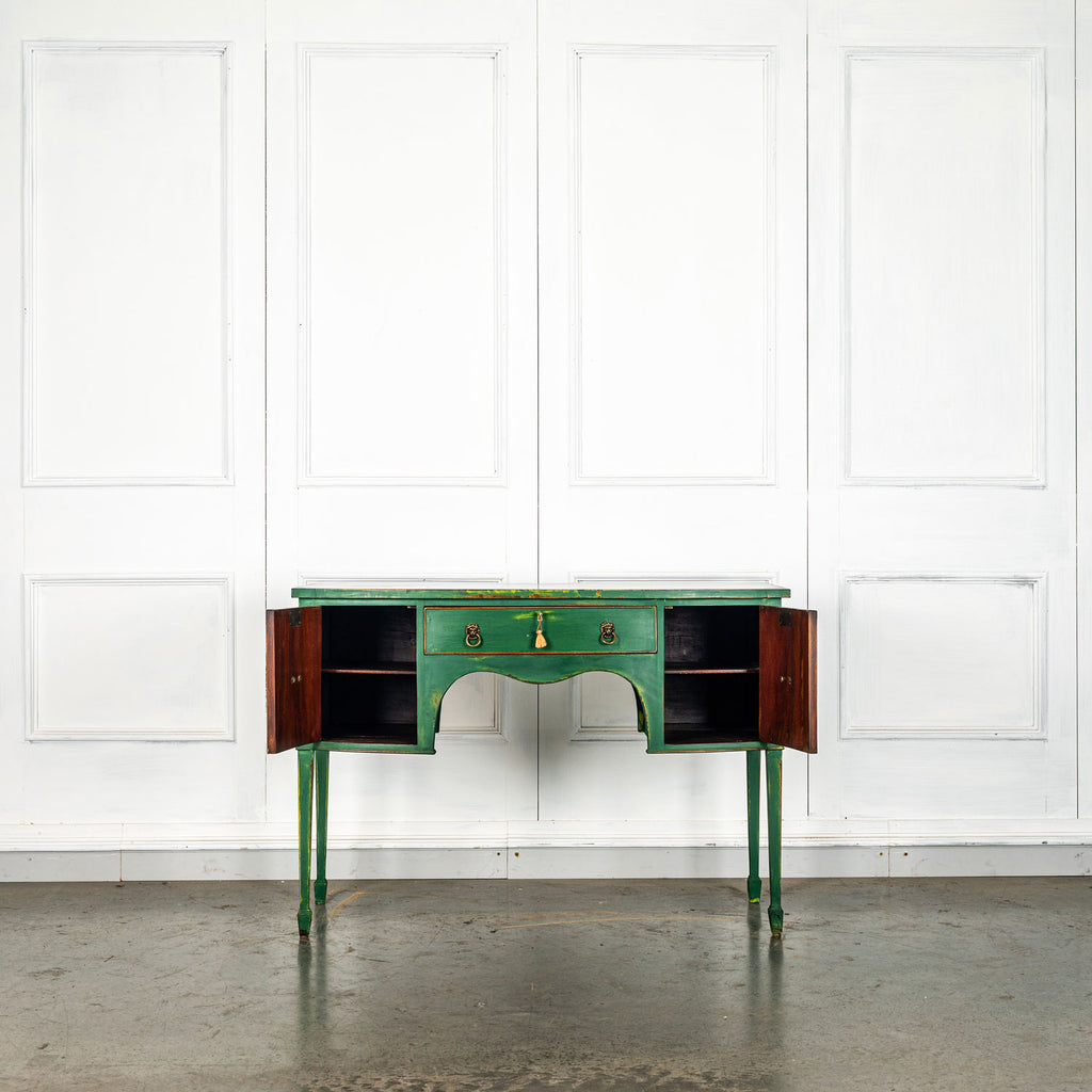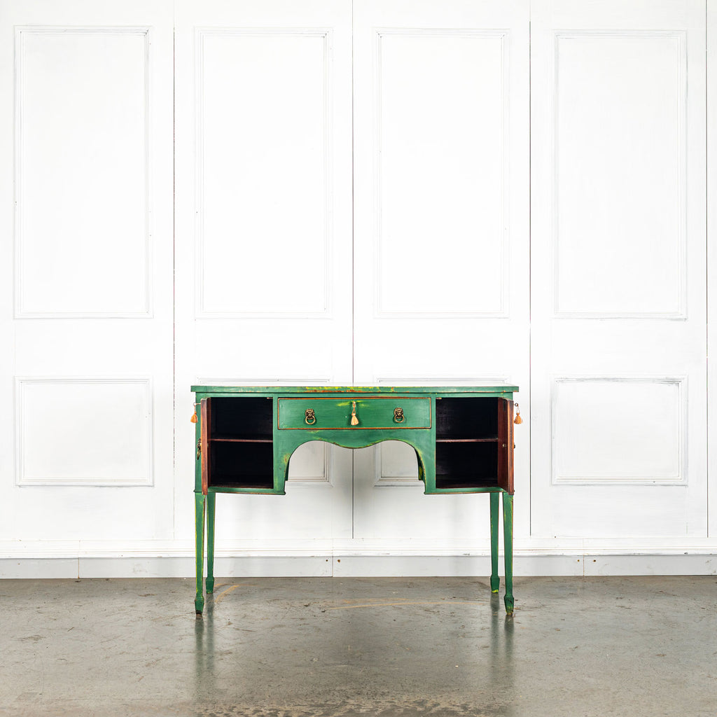 Edwardian painted mahogany bow fronted sideboard with central frieze drawer flanked by a cupboard on either side on square tapered legs and spayed feet. Wonderful brass lion head pull handles with all locks in working order with three keys. Antiques are green!