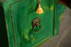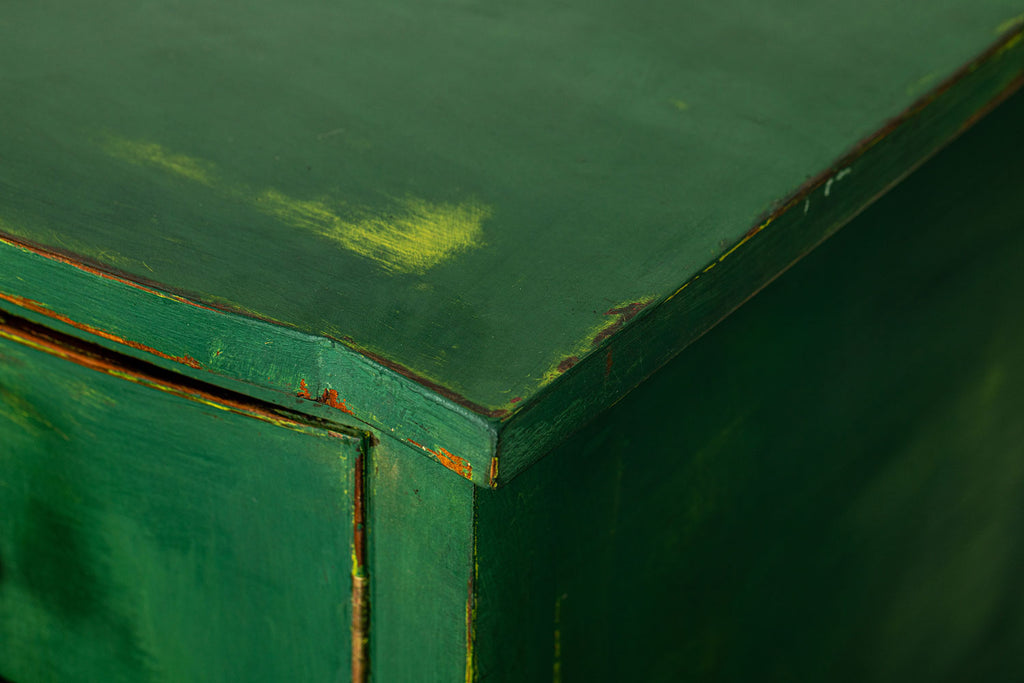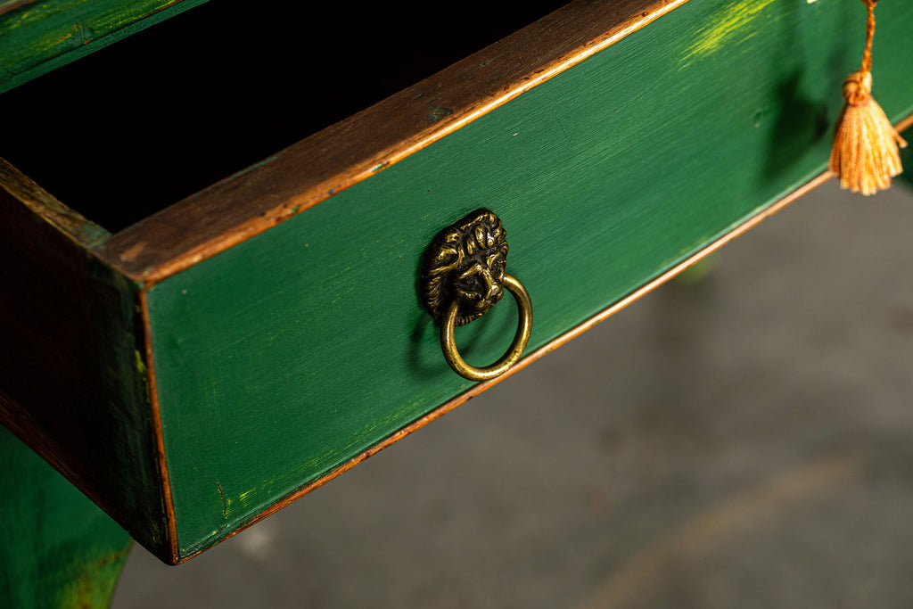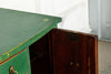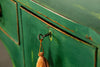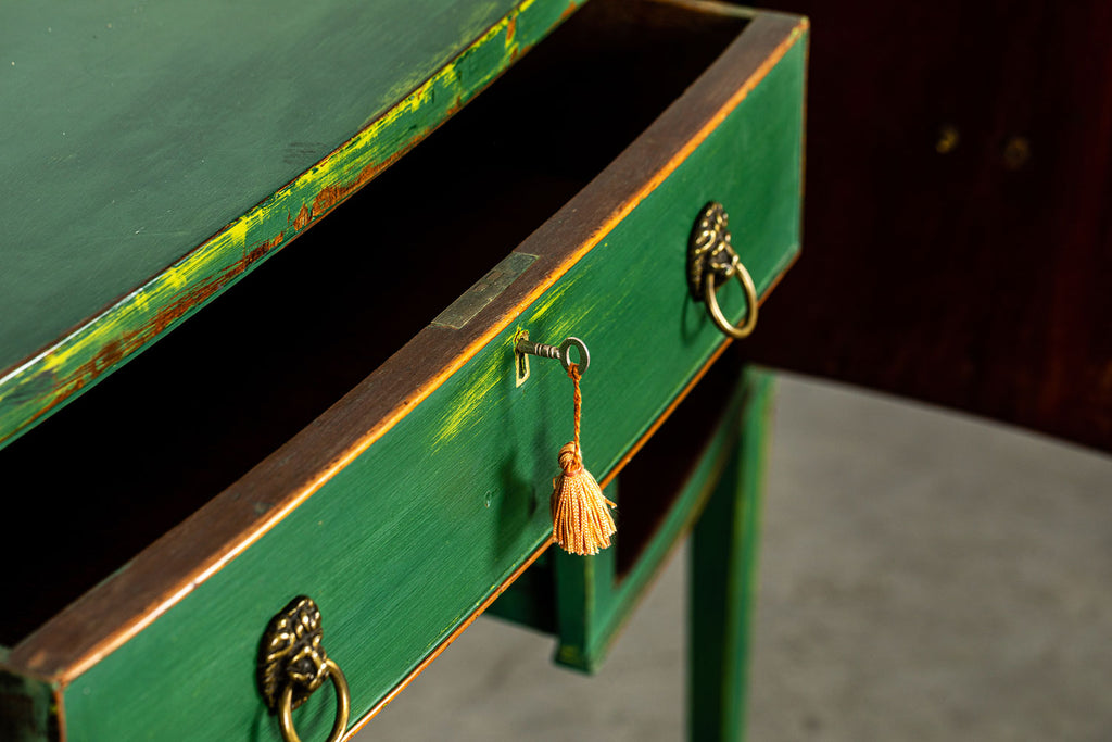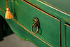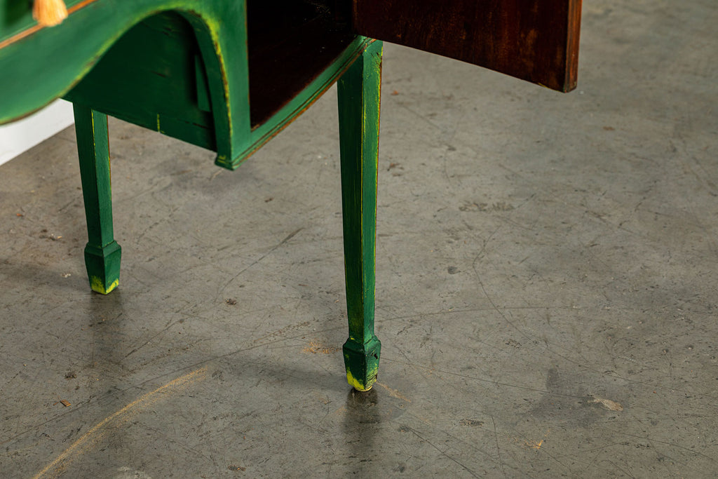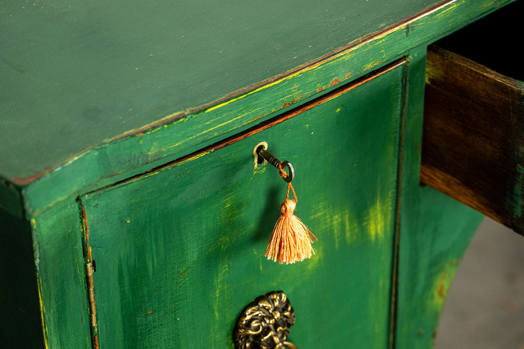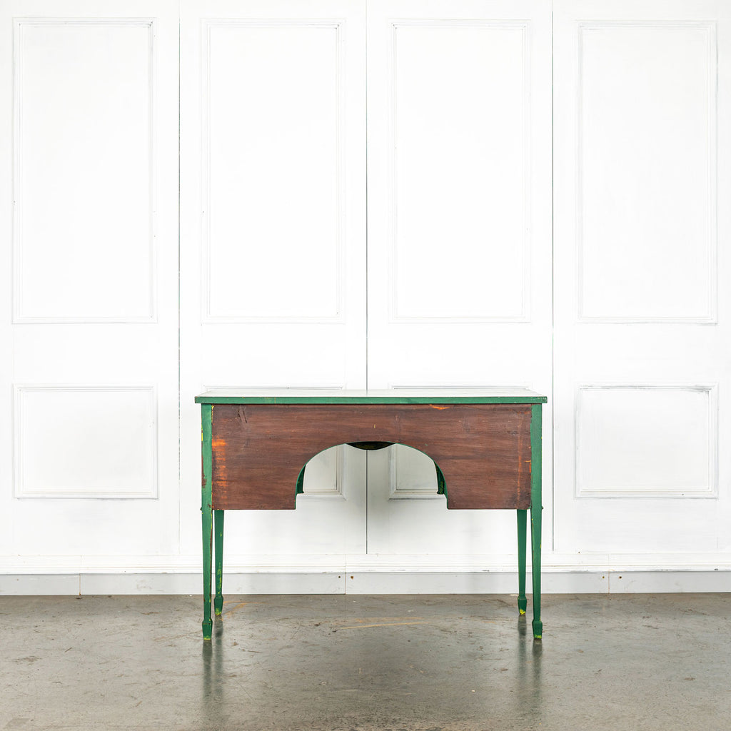 Edwardian painted mahogany bow fronted sideboard with central frieze drawer flanked by a cupboard on either side on square tapered legs and spayed feet. Wonderful brass lion head pull handles with all locks in working order with three keys. Antiques are green!