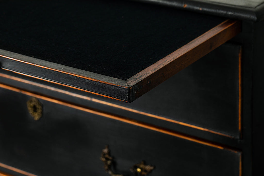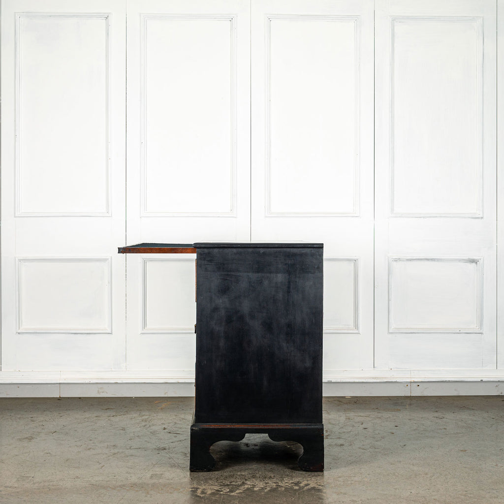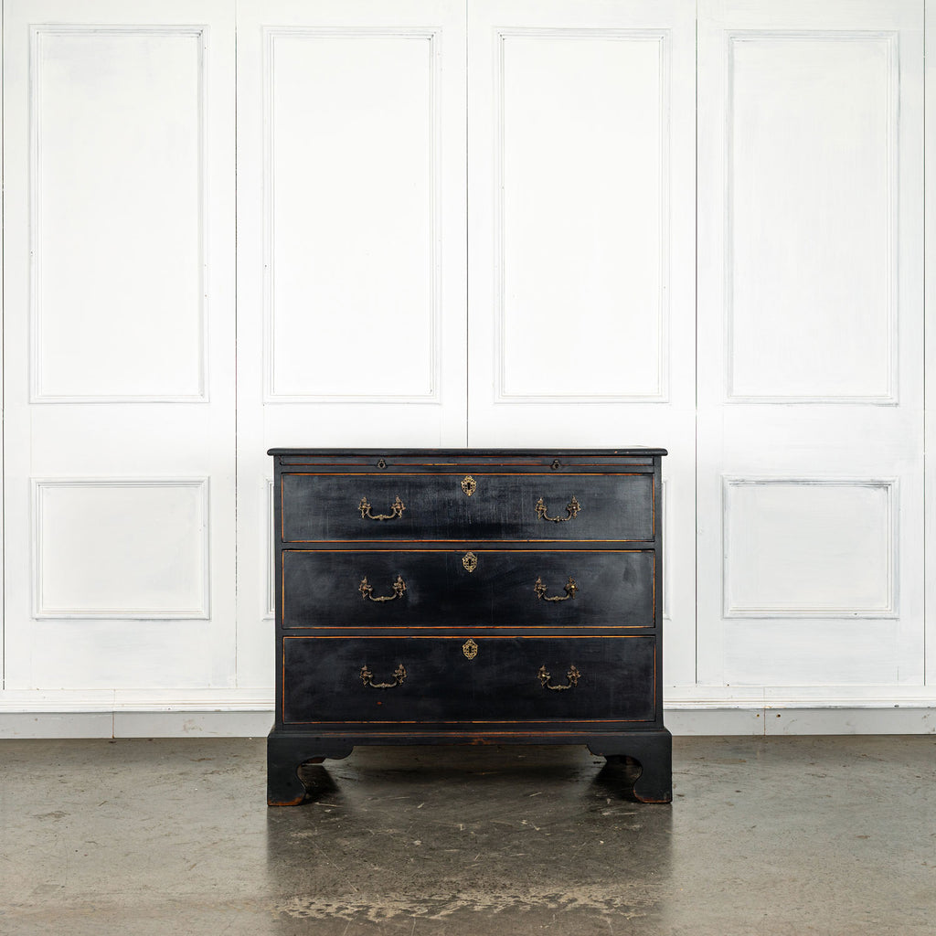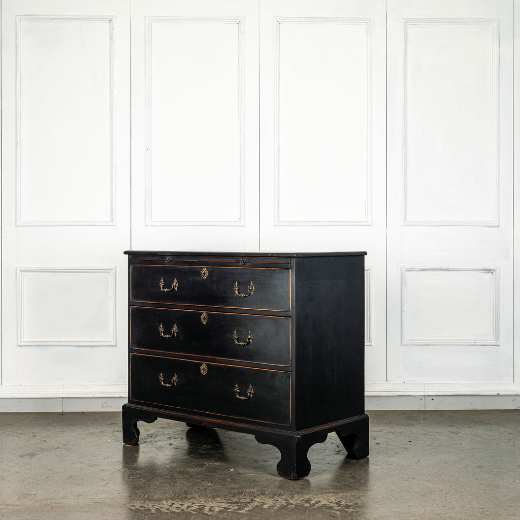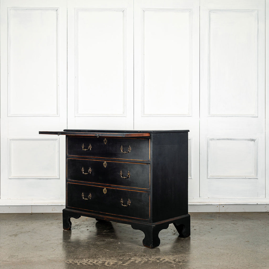 George 111 ebonised mahogany chest of drawers with three long graduated and cockbeaded drawers beneath a full width new black baize lined brushing slide. With brass chippendale handles (a personal favourite) and escutcheons of the period. This is a chest of drawers with a pile of style!