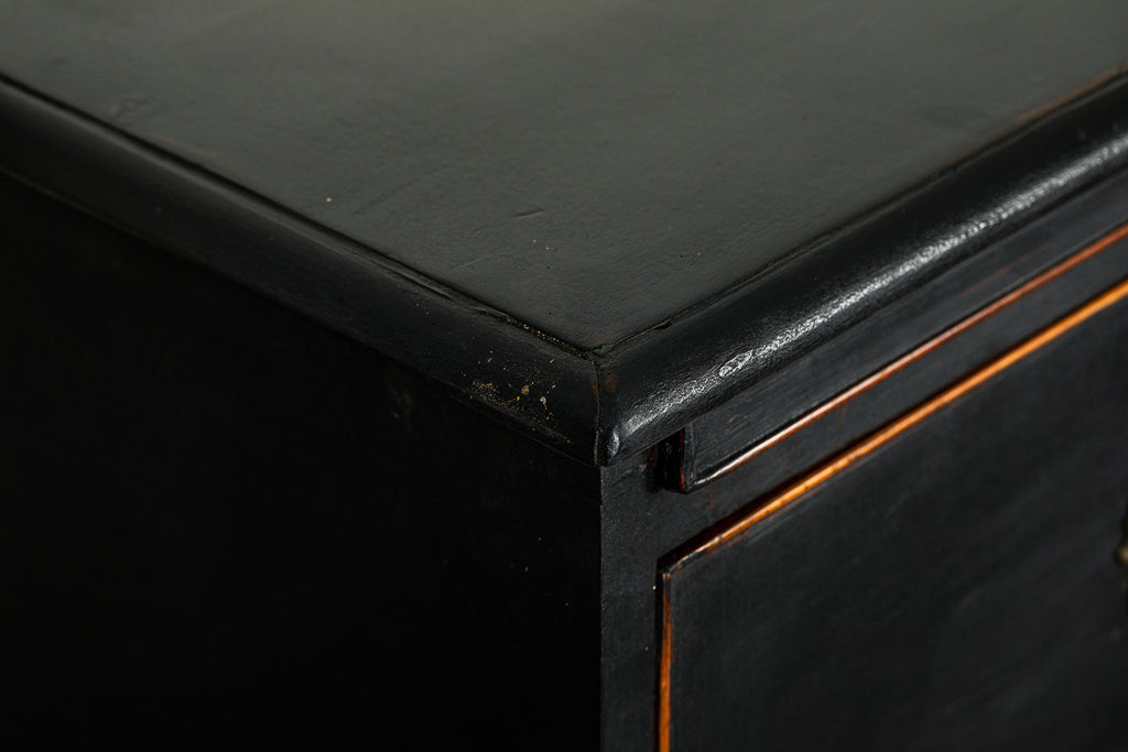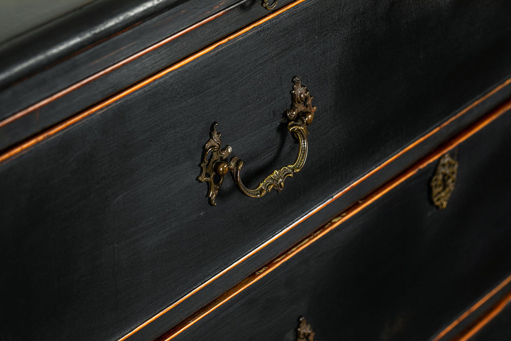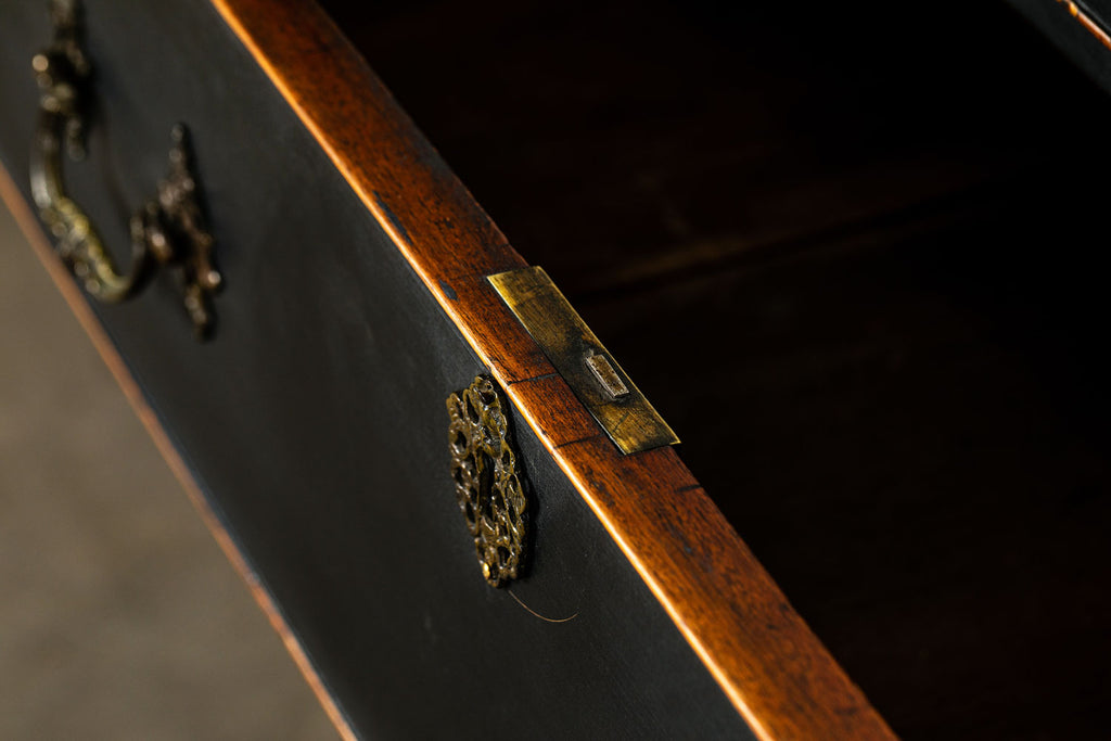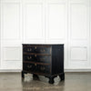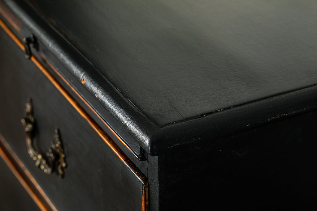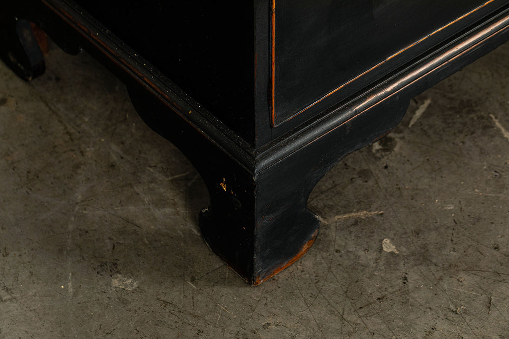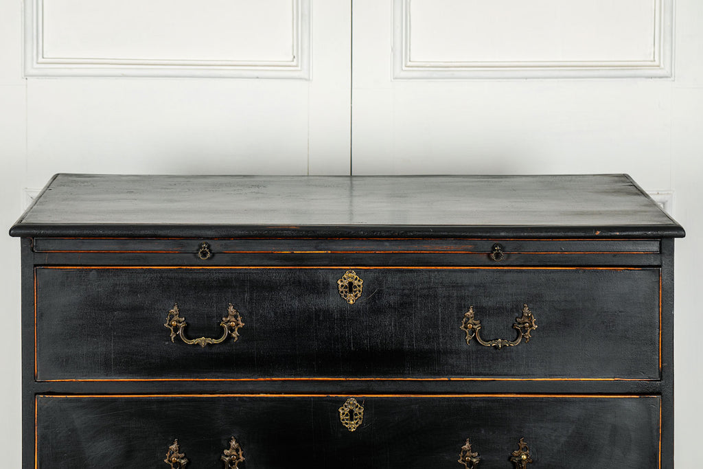 George 111 ebonised mahogany chest of drawers with three long graduated and cockbeaded drawers beneath a full width new black baize lined brushing slide. With brass chippendale handles (a personal favourite) and escutcheons of the period. This is a chest of drawers with a pile of style!