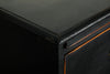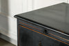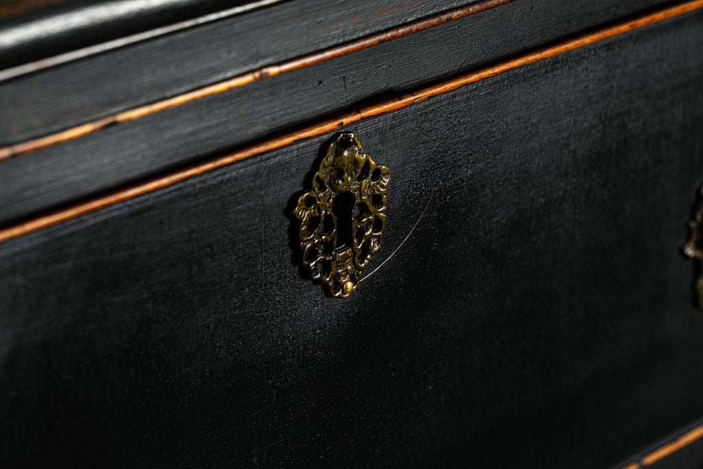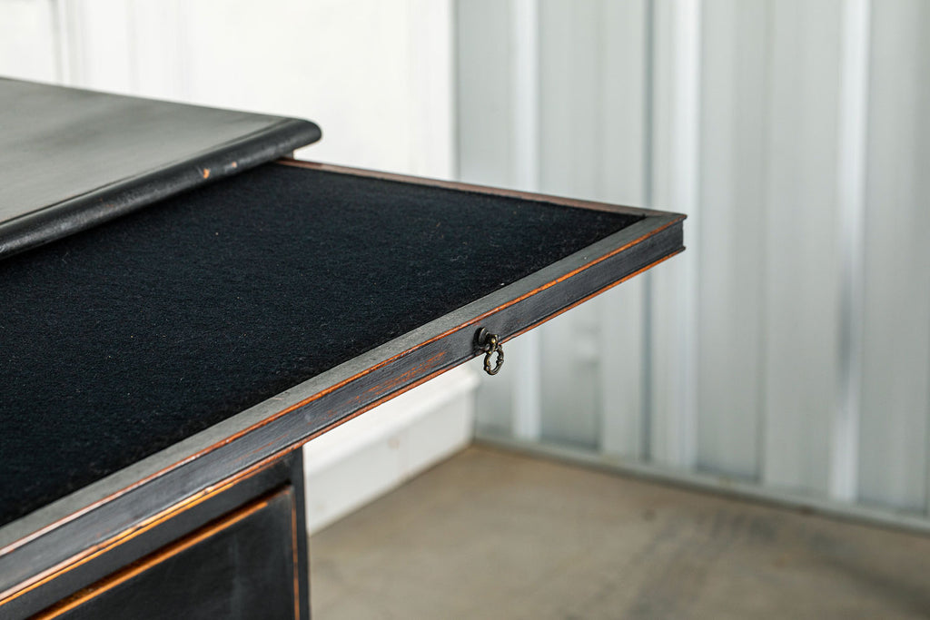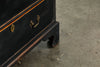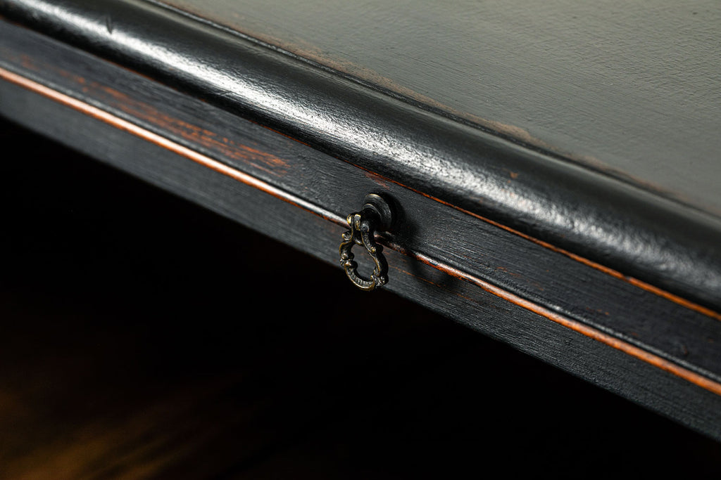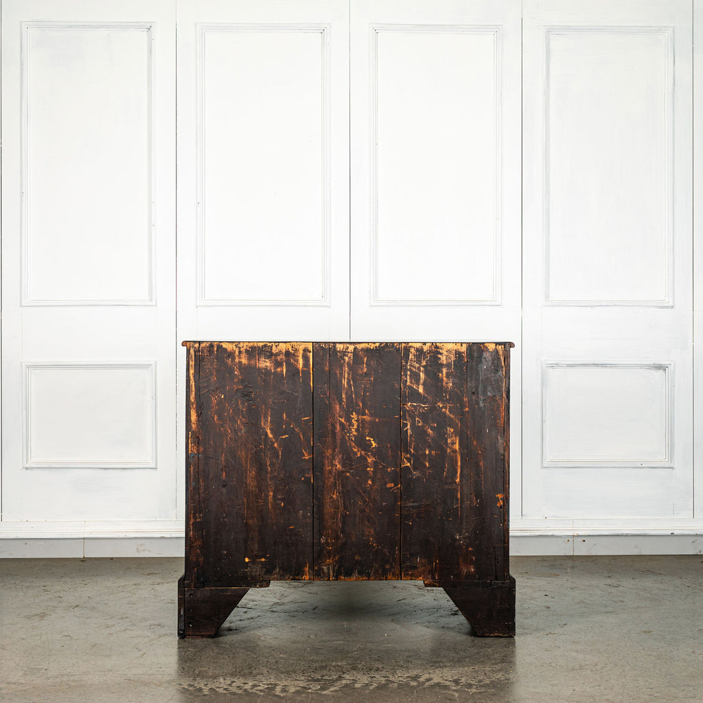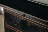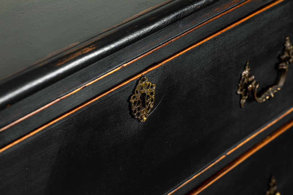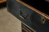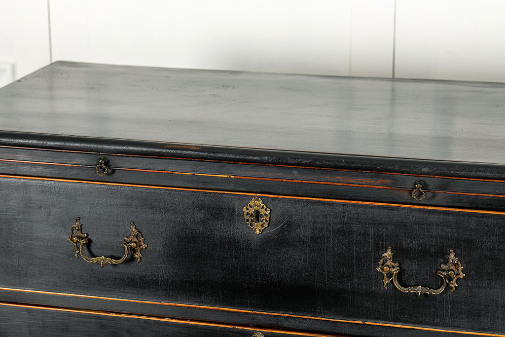 George 111 ebonised mahogany chest of drawers with three long graduated and cockbeaded drawers beneath a full width new black baize lined brushing slide. With brass chippendale handles (a personal favourite) and escutcheons of the period. This is a chest of drawers with a pile of style!