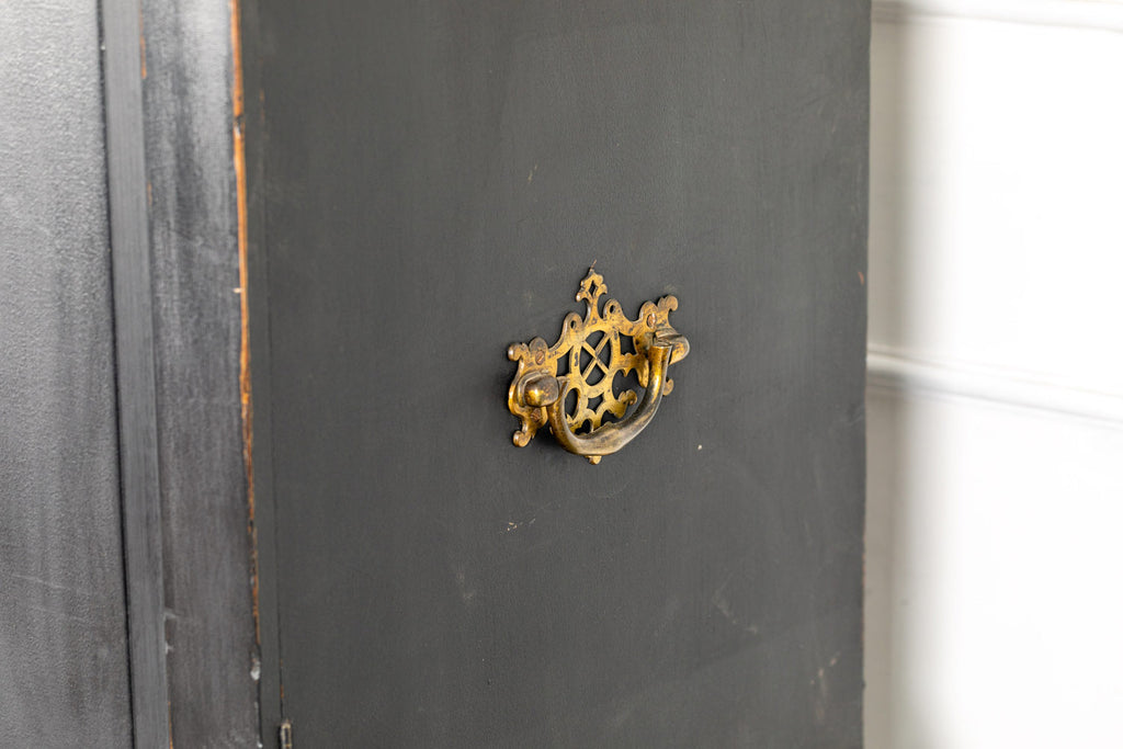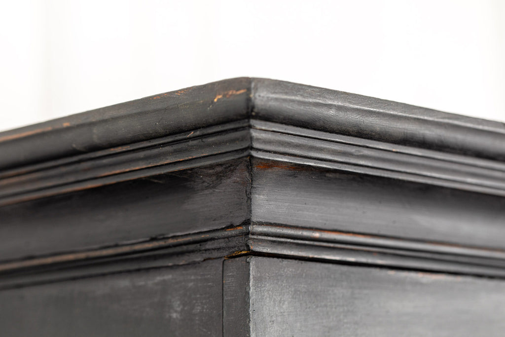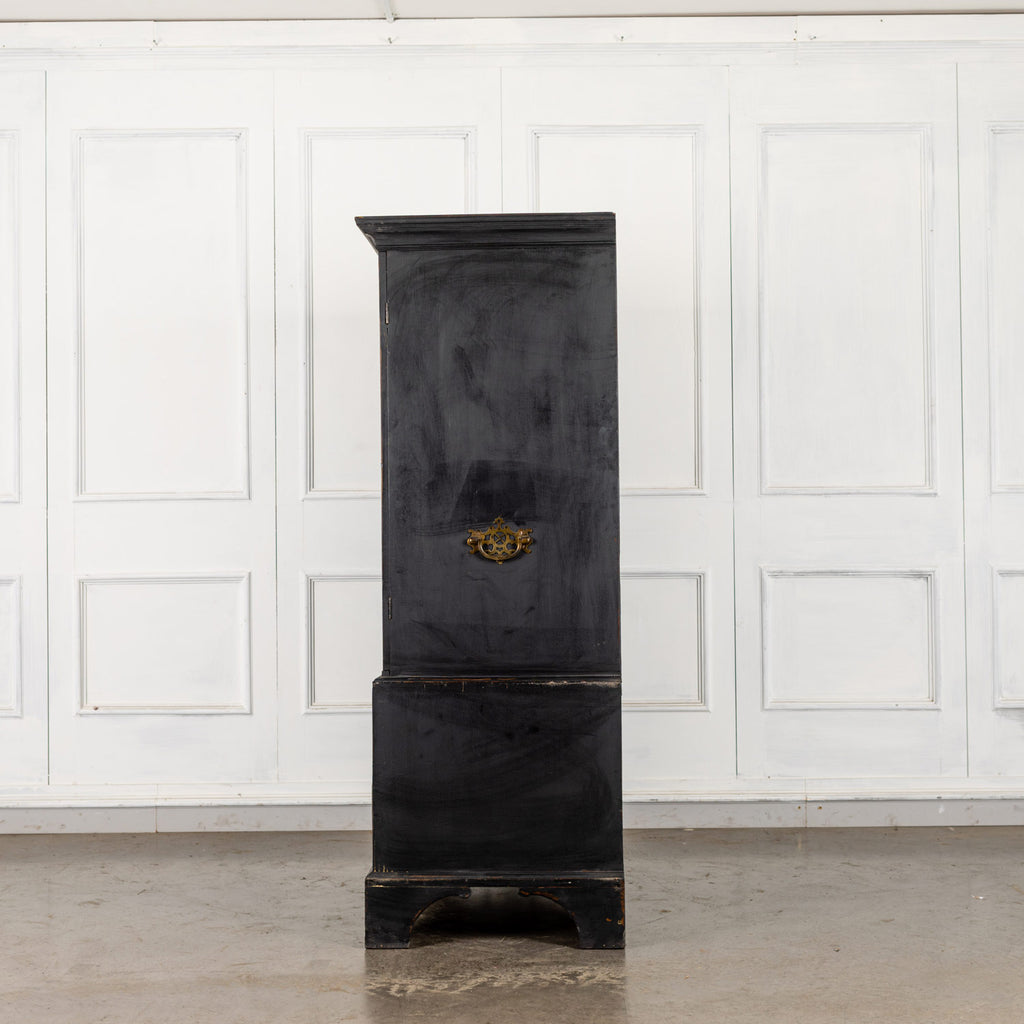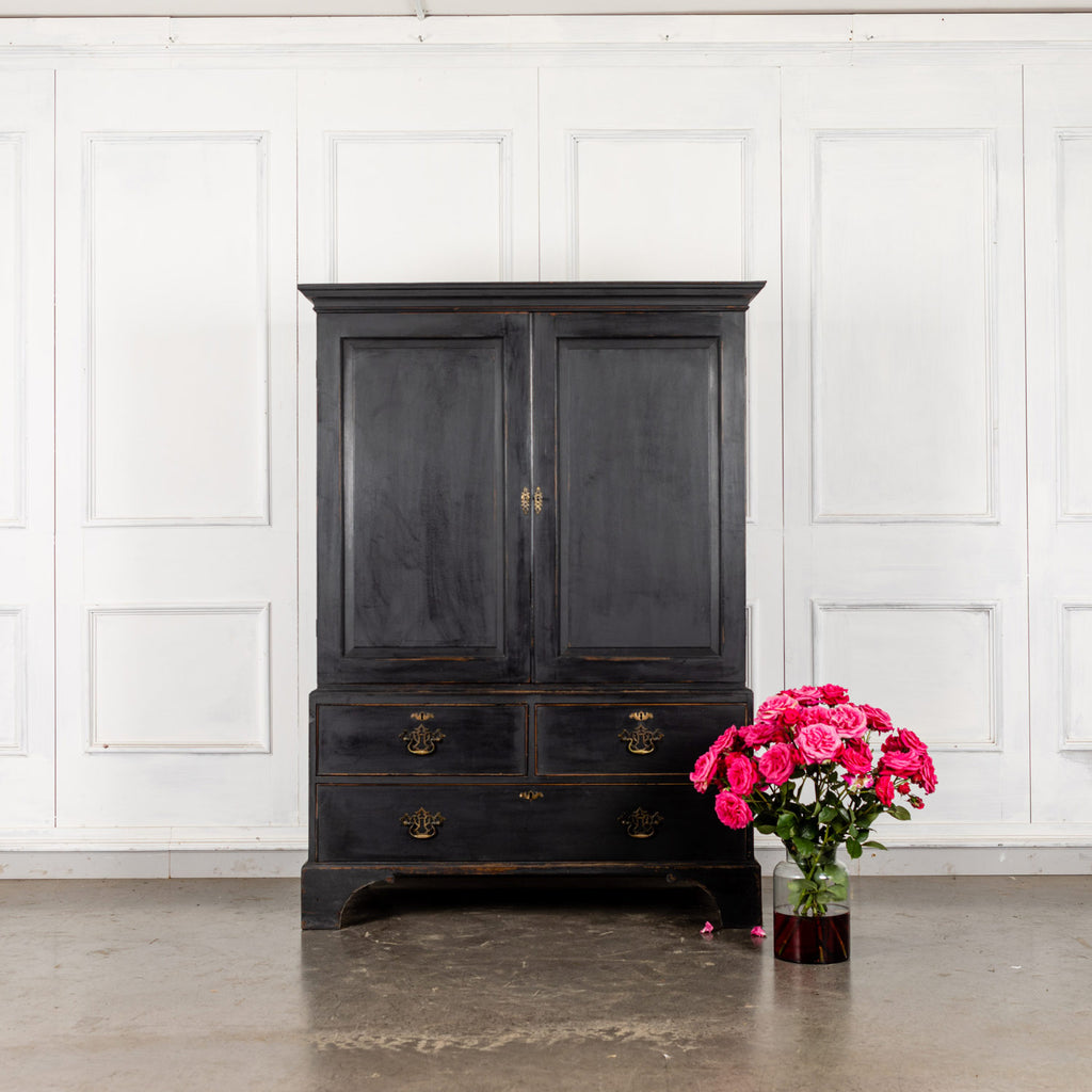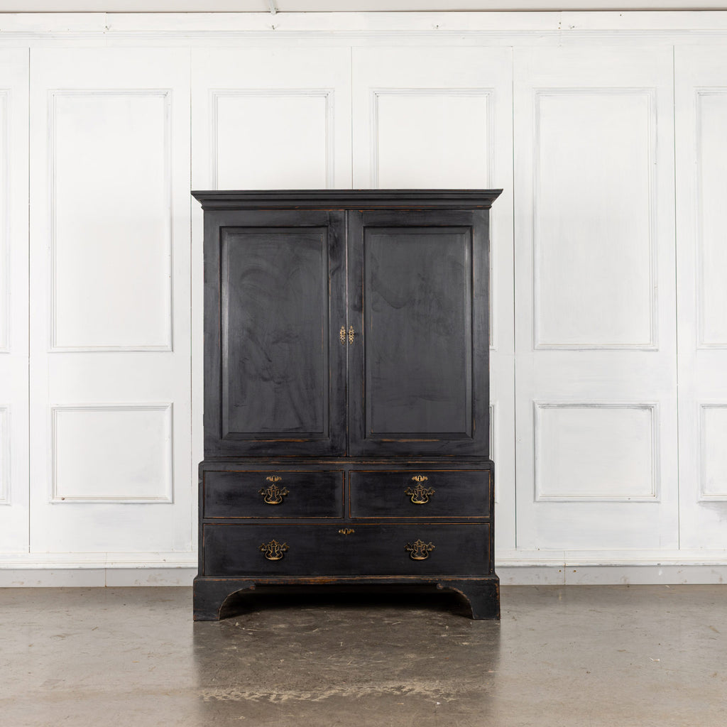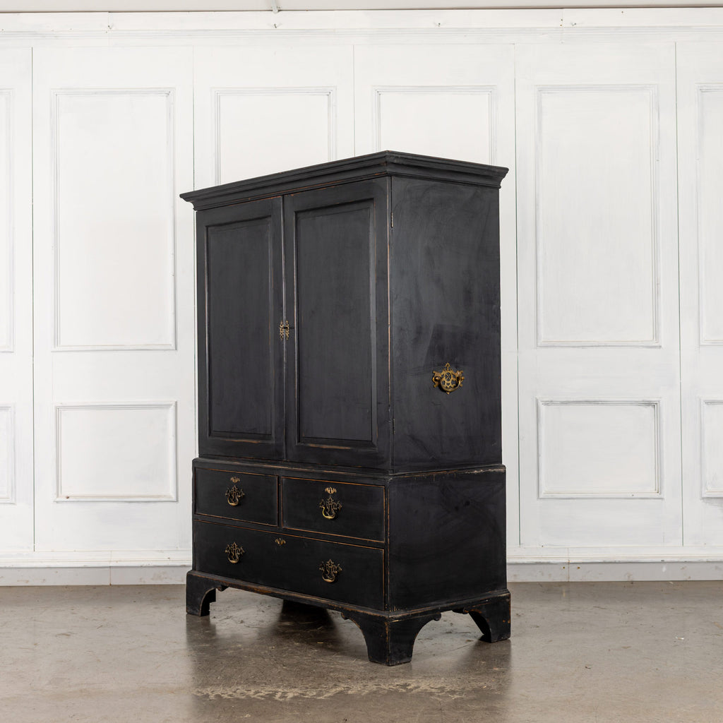 A George 111 ebonised linen press with a moulded cornice above two panelled doors enclosing golden oak sliding trays. Below are two short and one long graduated and cockbeaded drawers with impressive brass handles and finishing on bracket feet. There also large brass handles to the side of the cupboard section which make an unusual and impressive addition to this statement piece.