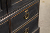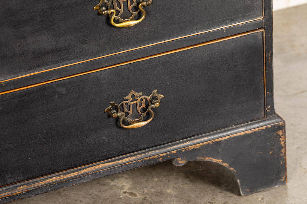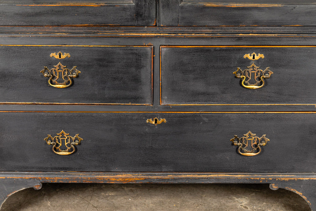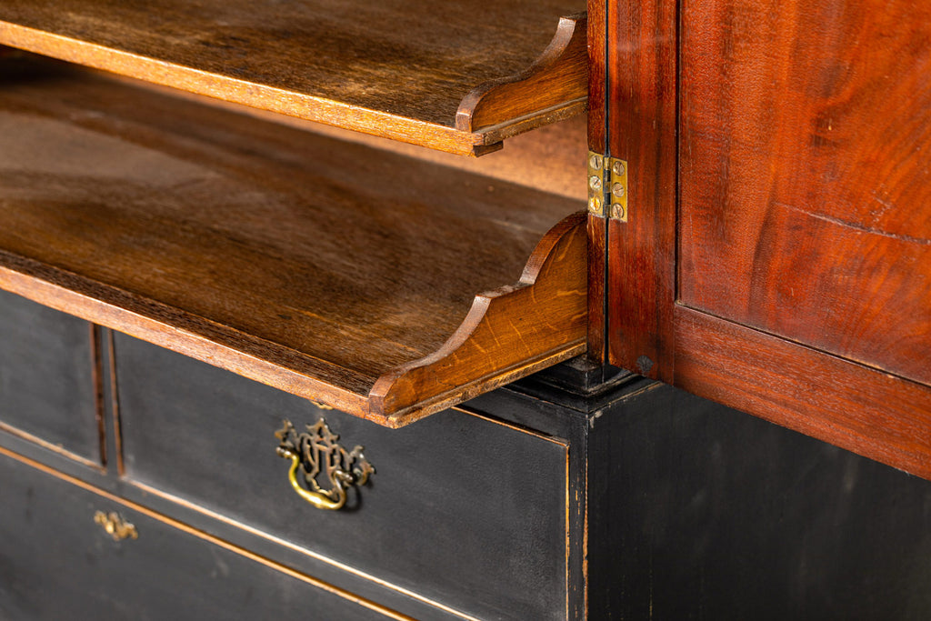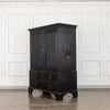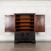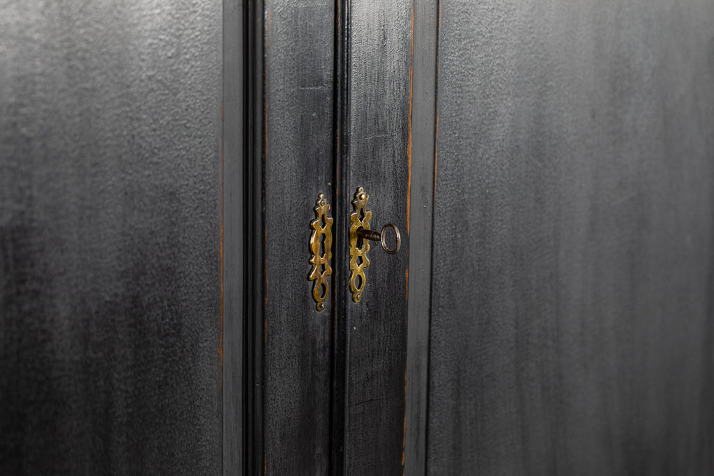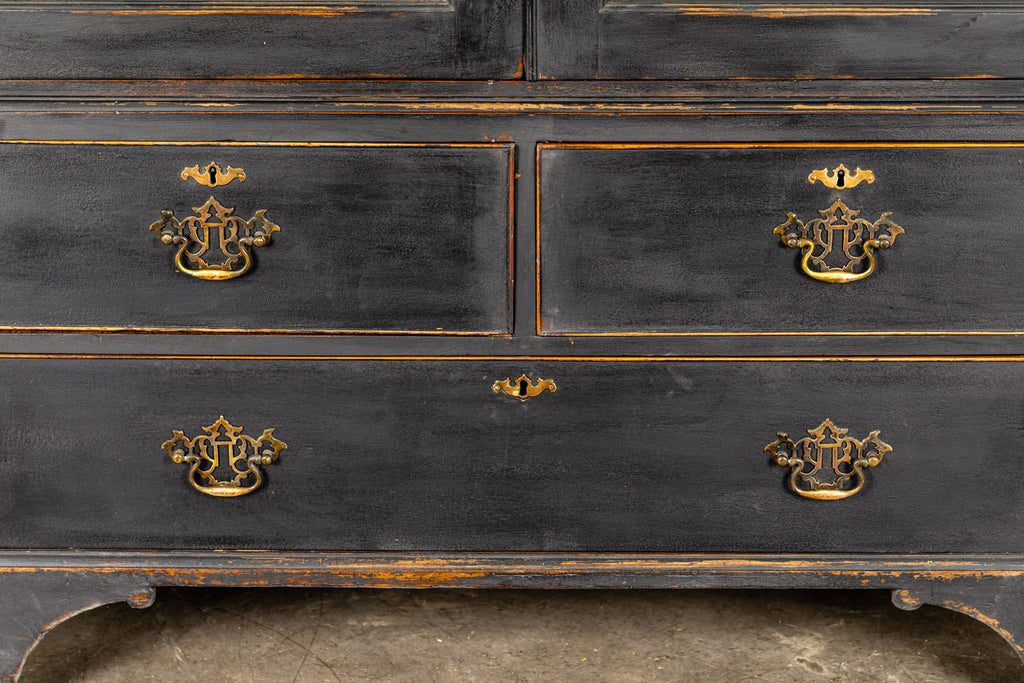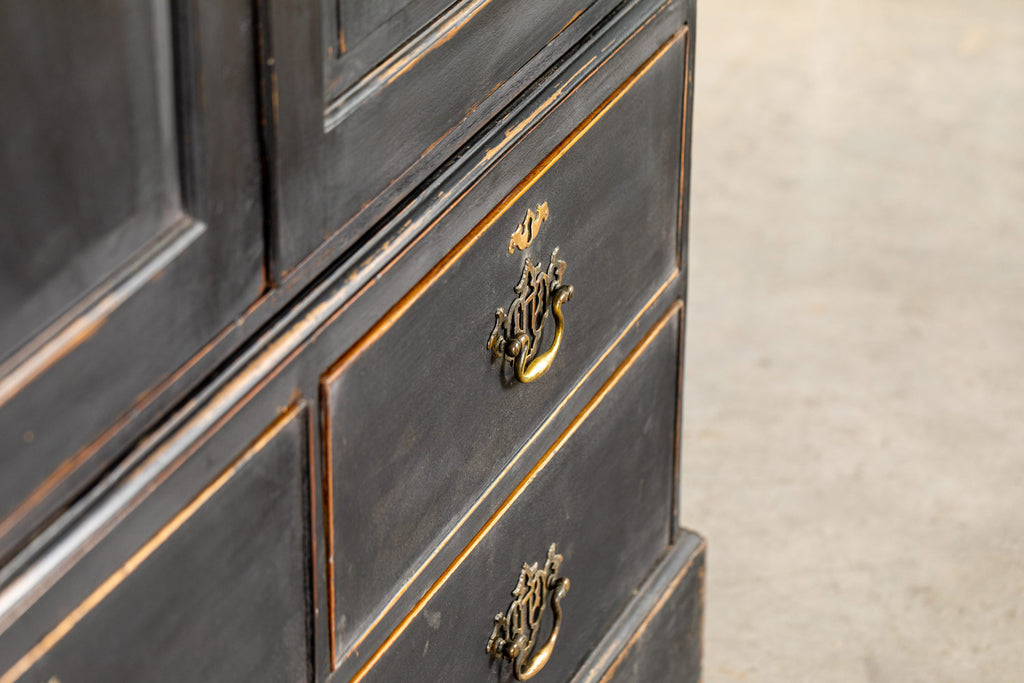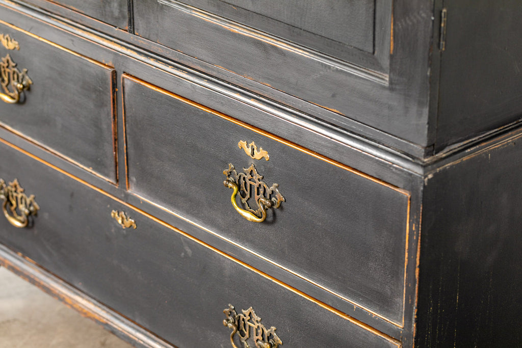 A George 111 ebonised linen press with a moulded cornice above two panelled doors enclosing golden oak sliding trays. Below are two short and one long graduated and cockbeaded drawers with impressive brass handles and finishing on bracket feet. There also large brass handles to the side of the cupboard section which make an unusual and impressive addition to this statement piece.