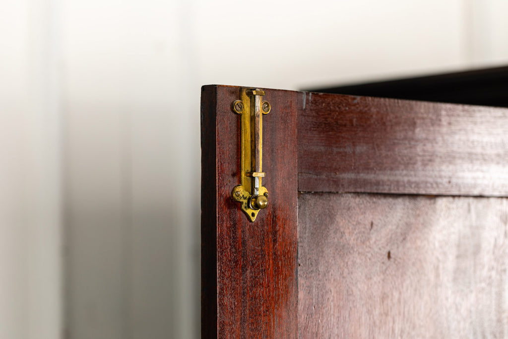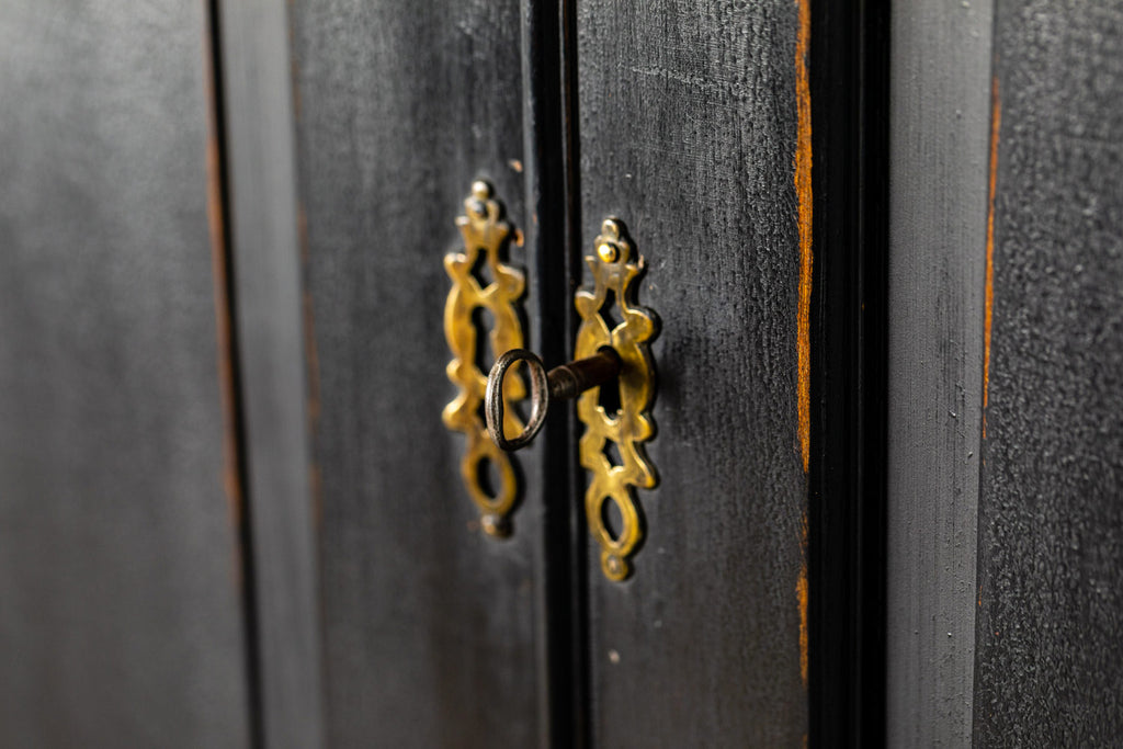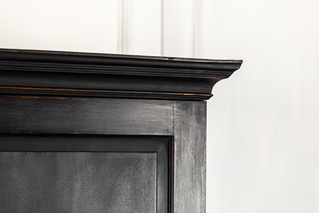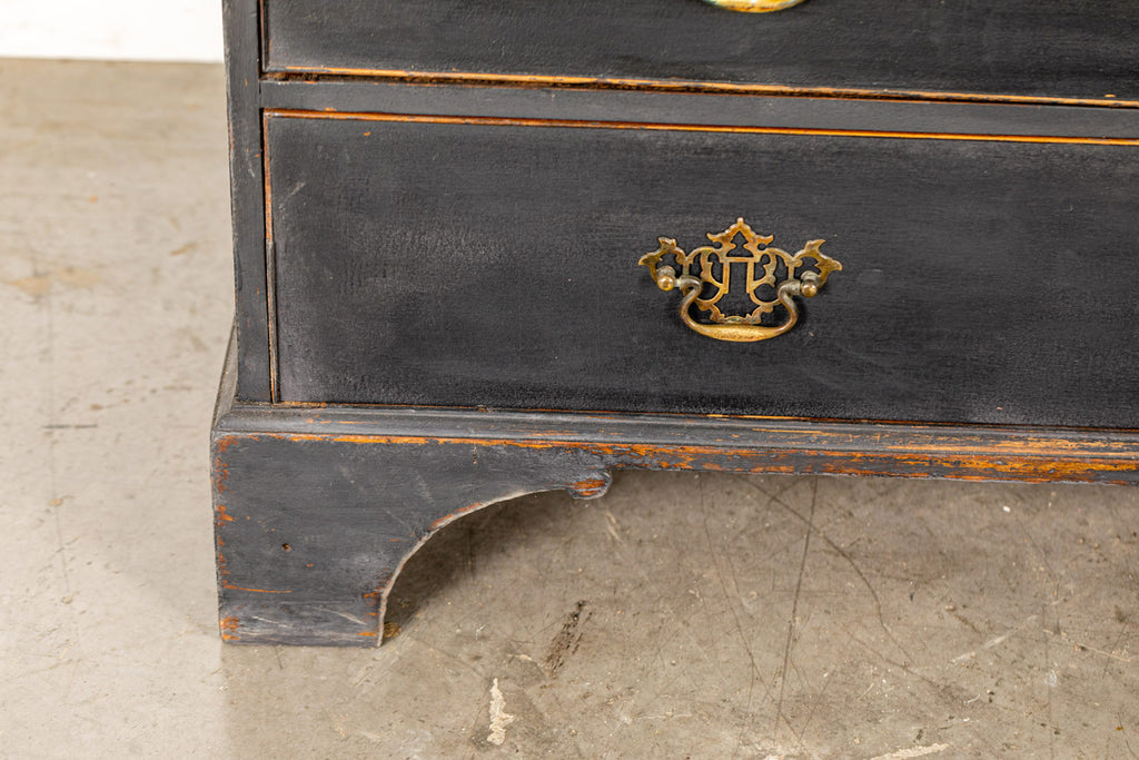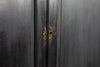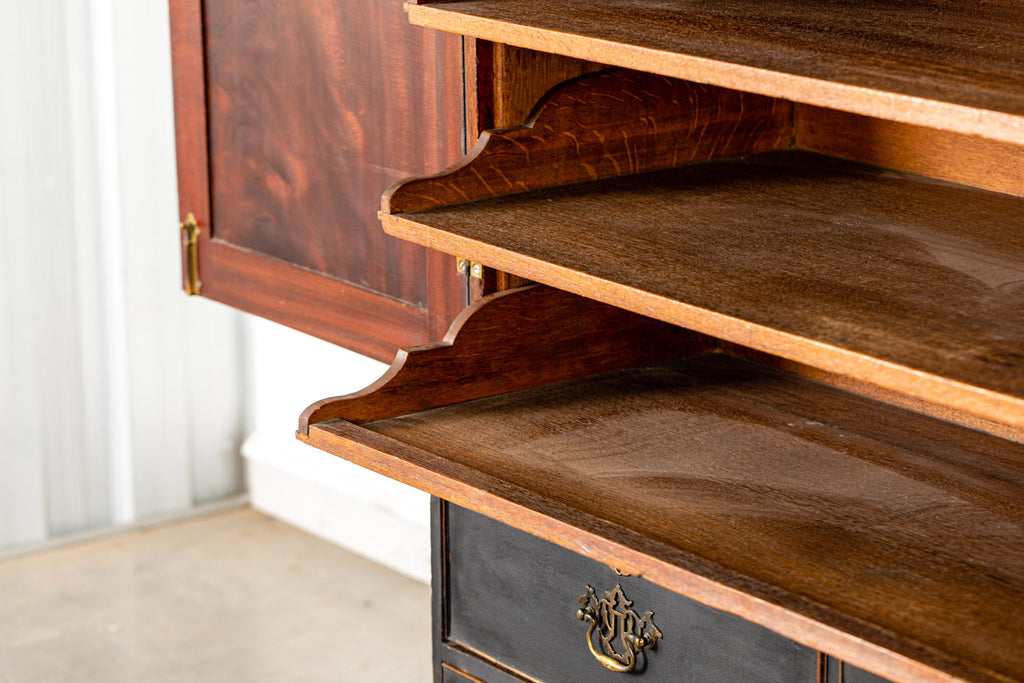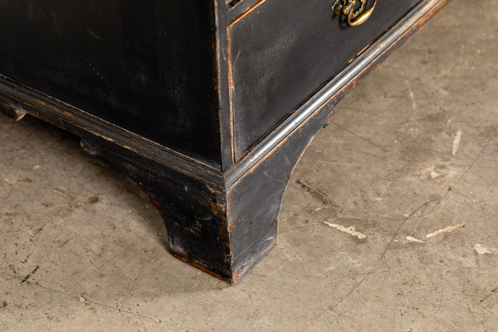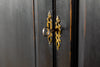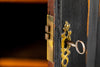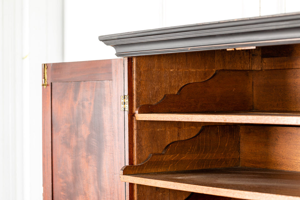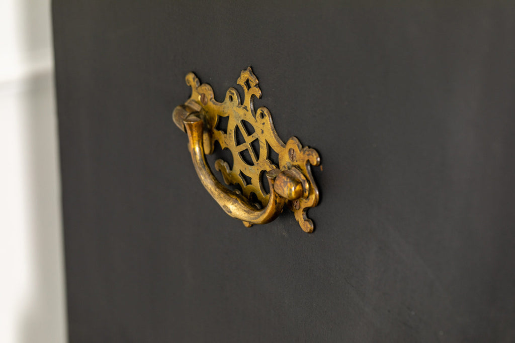 A George 111 ebonised linen press with a moulded cornice above two panelled doors enclosing golden oak sliding trays. Below are two short and one long graduated and cockbeaded drawers with impressive brass handles and finishing on bracket feet. There also large brass handles to the side of the cupboard section which make an unusual and impressive addition to this statement piece.