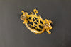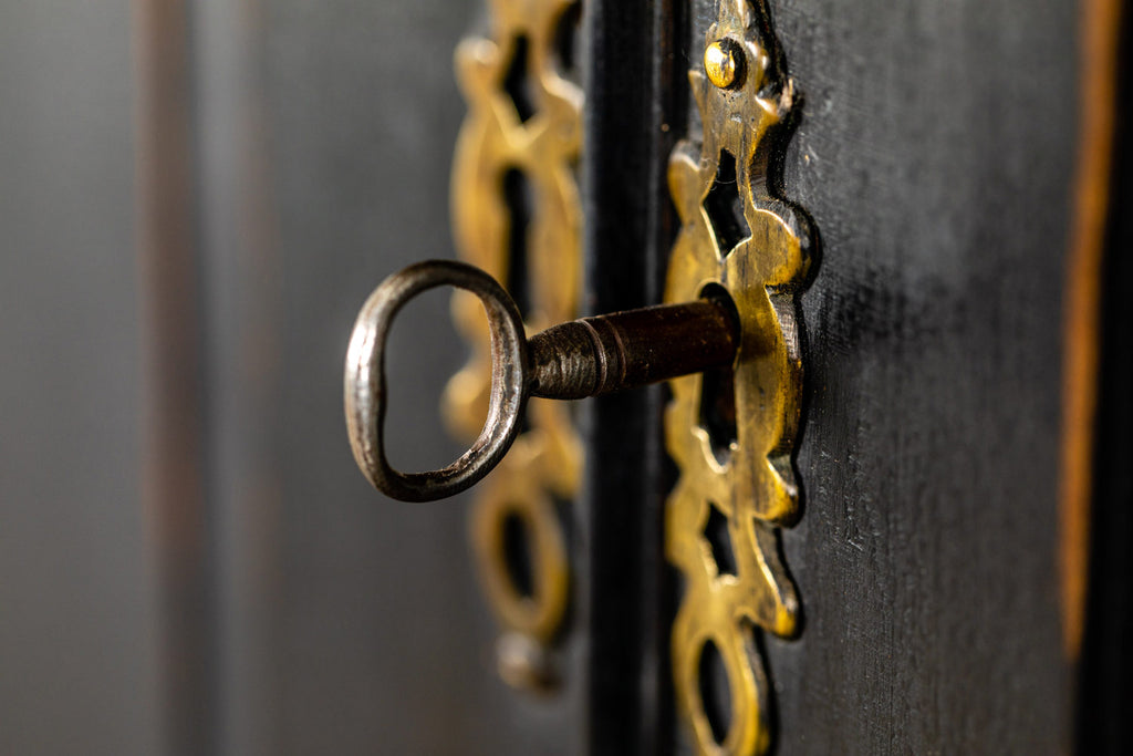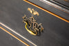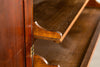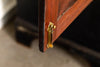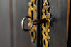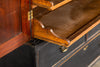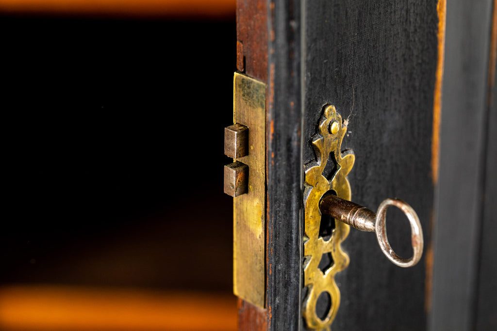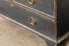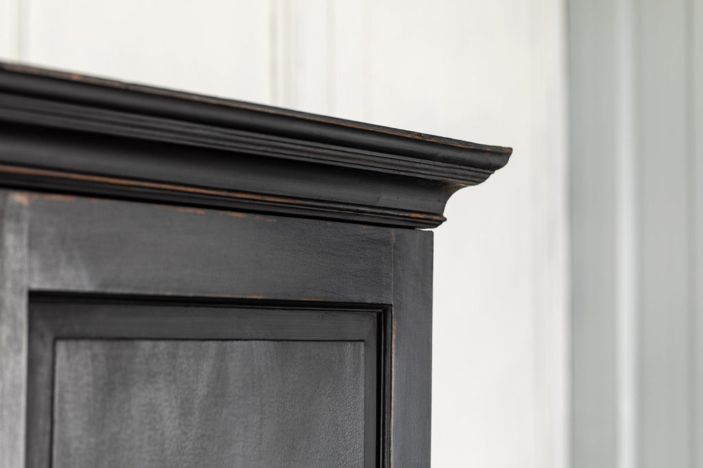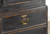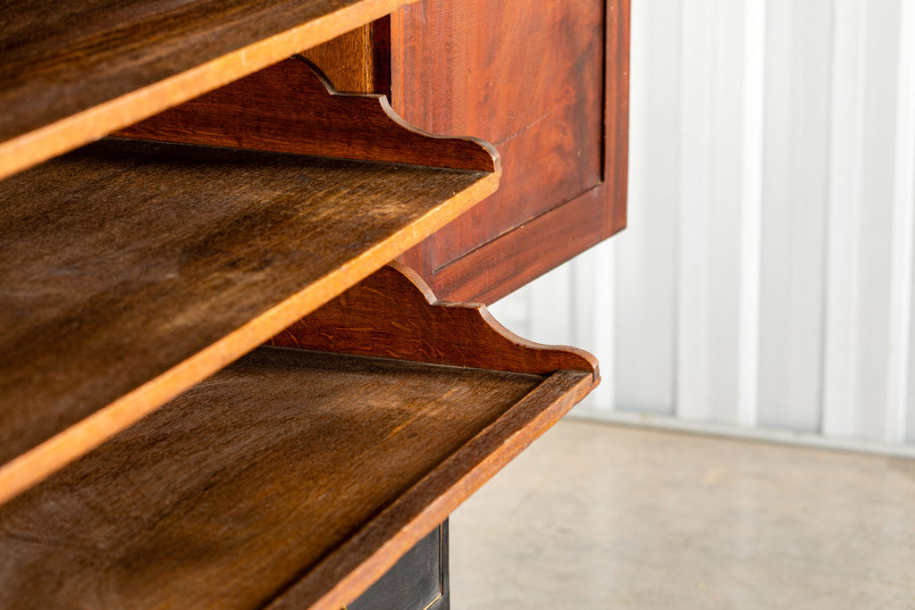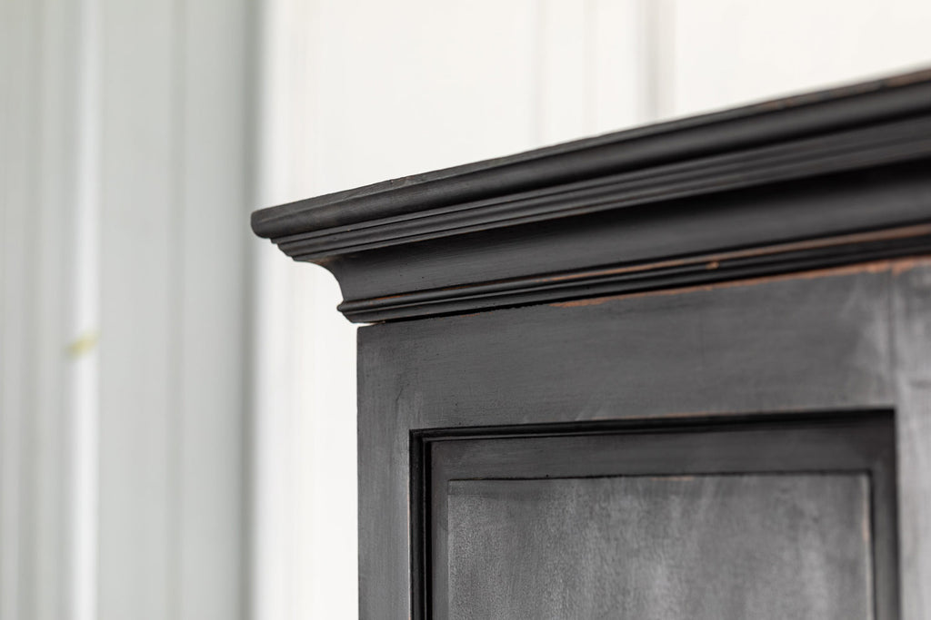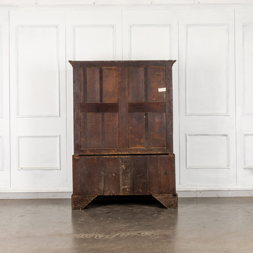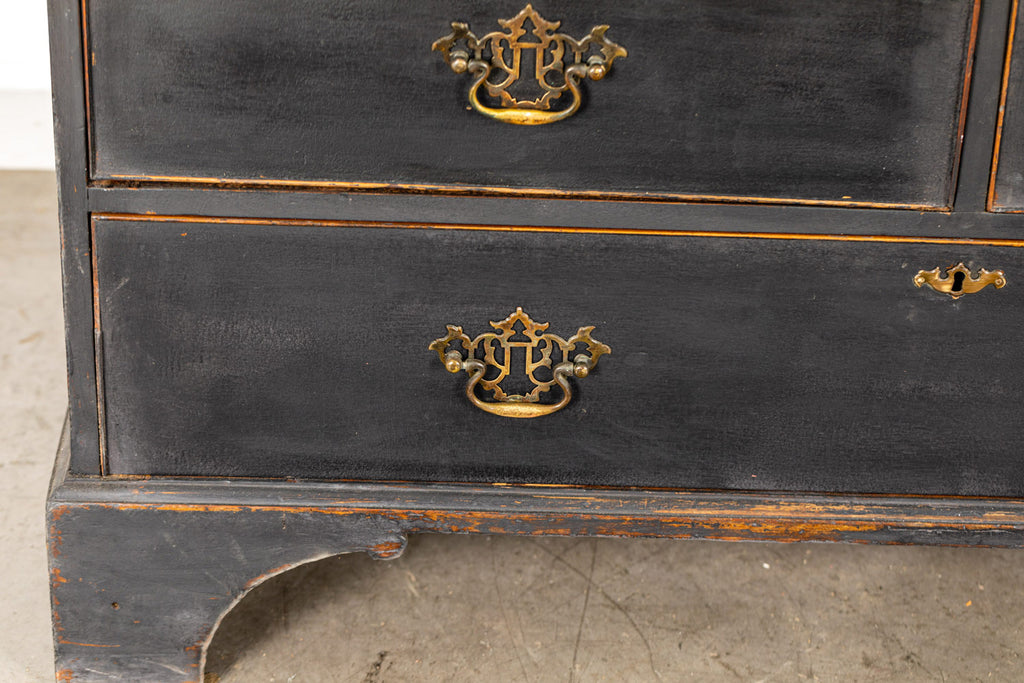 A George 111 ebonised linen press with a moulded cornice above two panelled doors enclosing golden oak sliding trays. Below are two short and one long graduated and cockbeaded drawers with impressive brass handles and finishing on bracket feet. There also large brass handles to the side of the cupboard section which make an unusual and impressive addition to this statement piece.