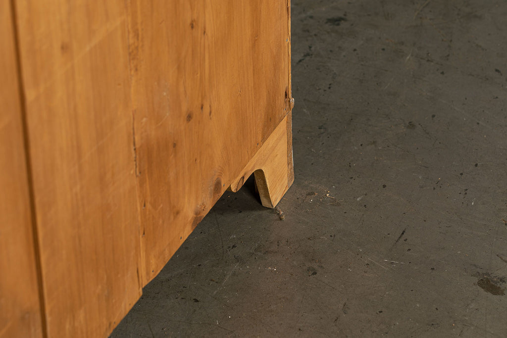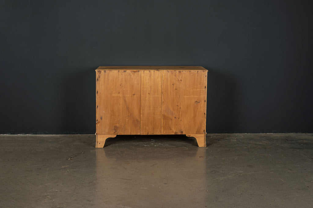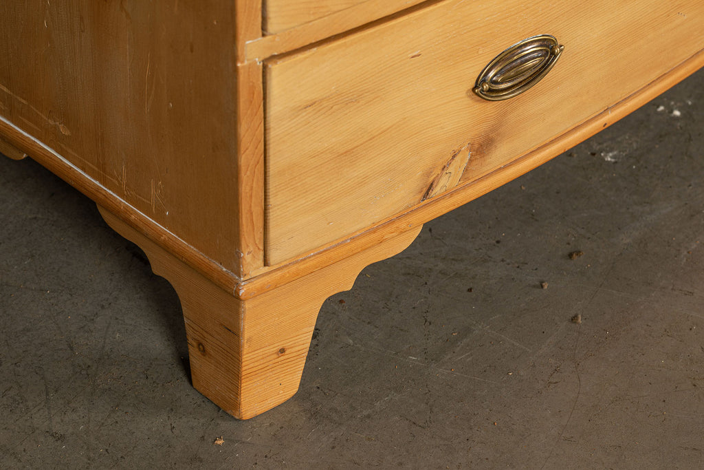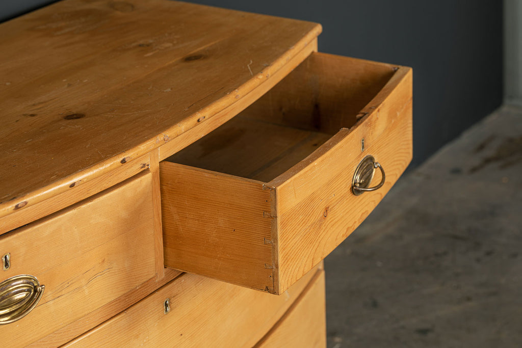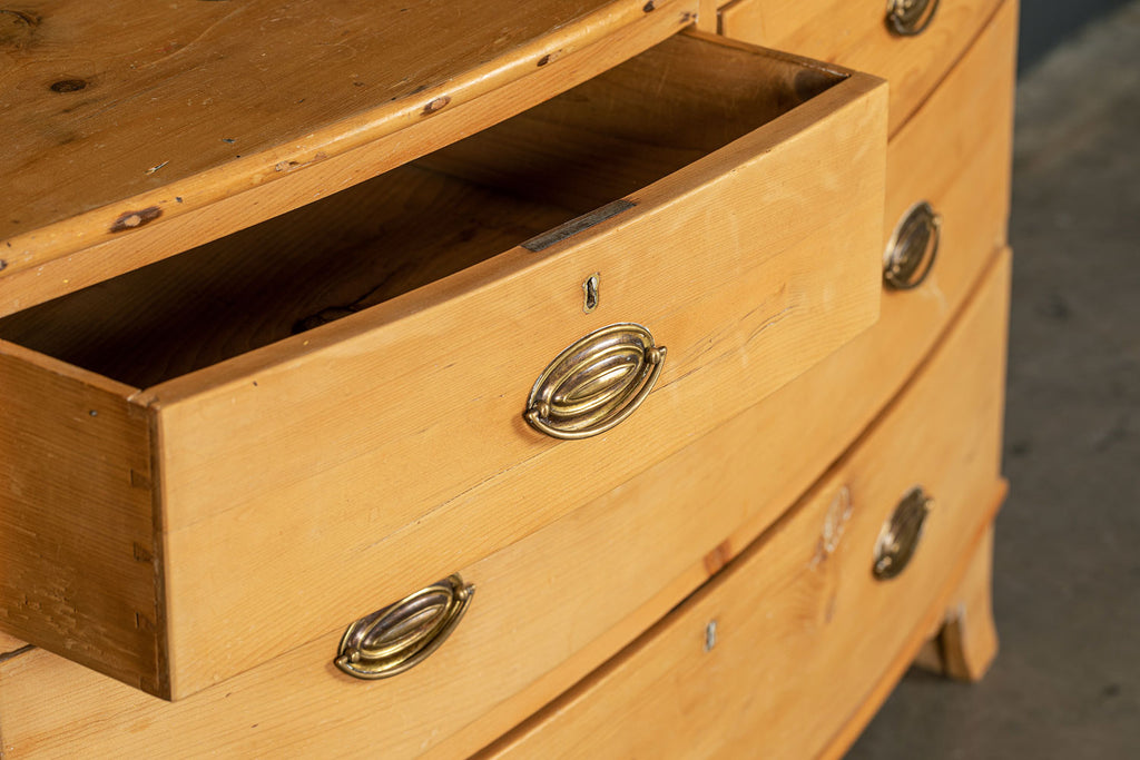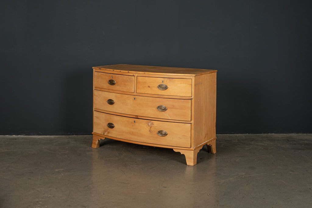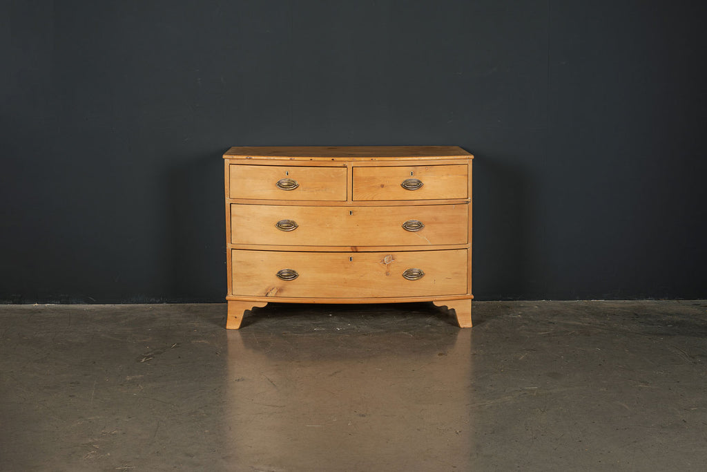 An early 19th Century pine bow fronted chest of drawers with two short over two long drawers on splayed bracket feet. A beautifully crafted piece and a good example of refined proportions with uniform colour and sheen. No splits or cracks, complete with working lock and key. It is unusual to find a piece of this age in pine. An outstanding piece of furniture.