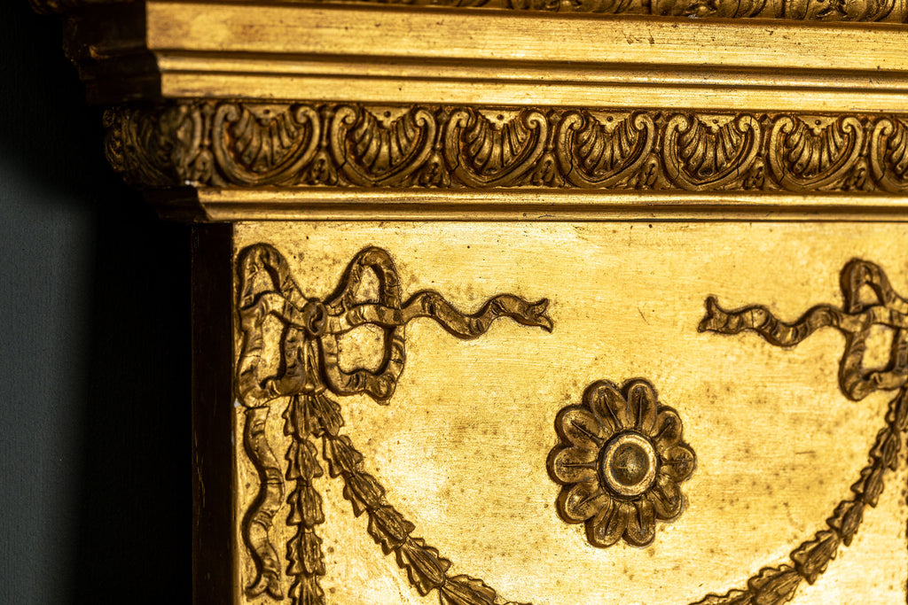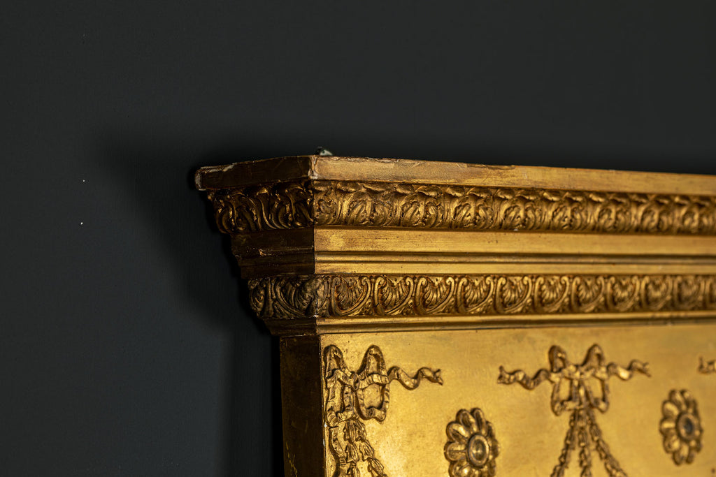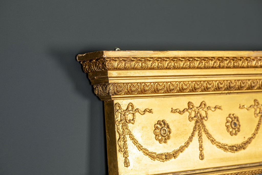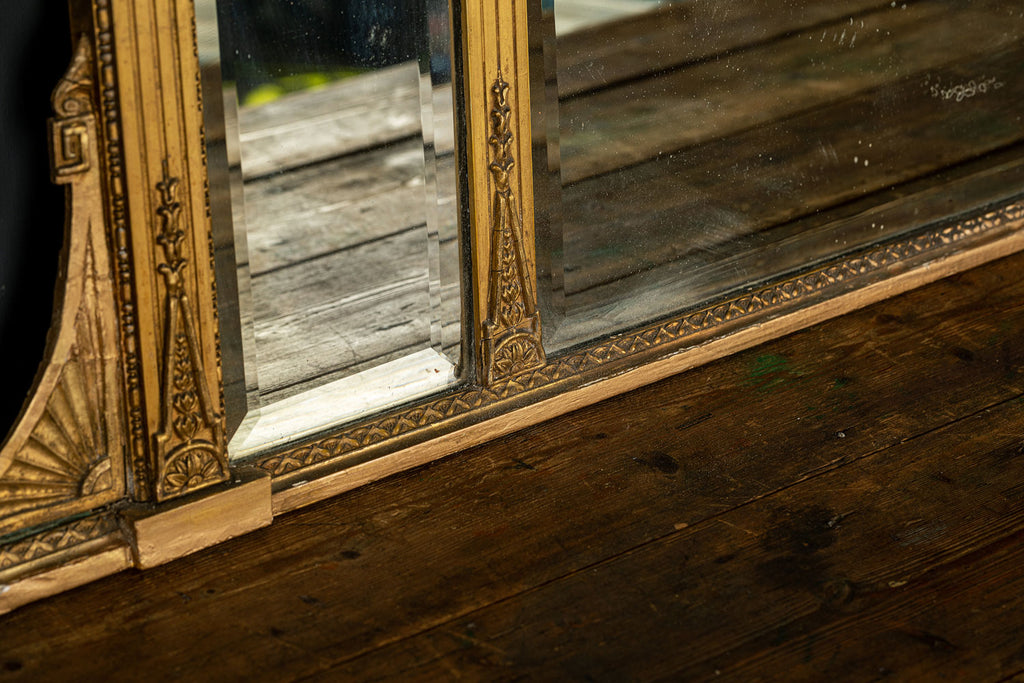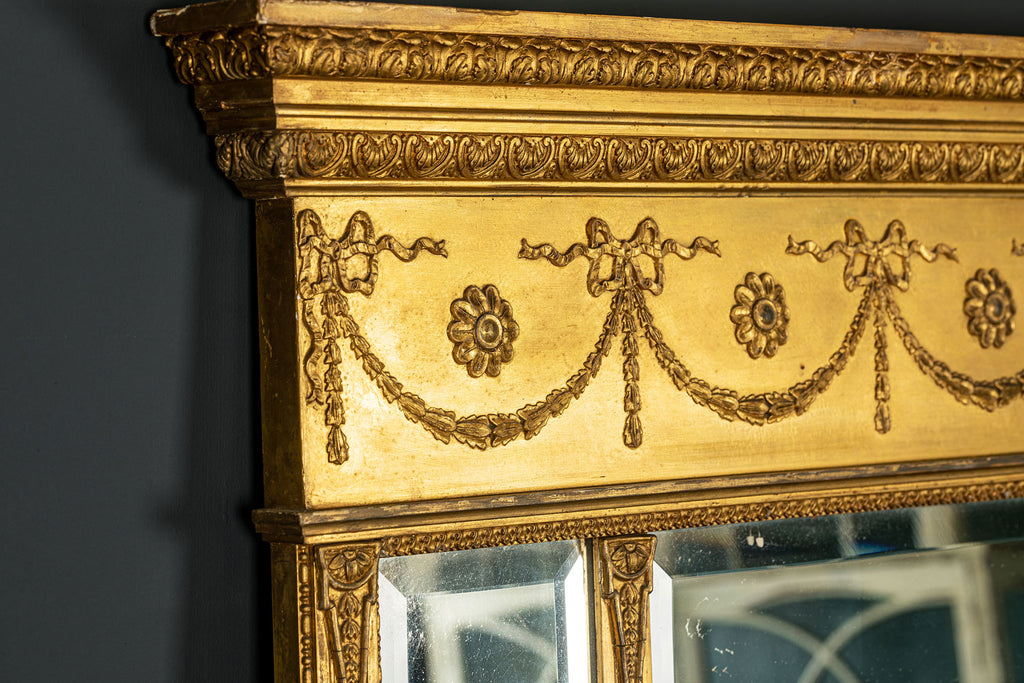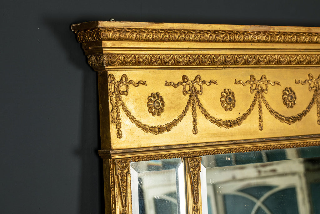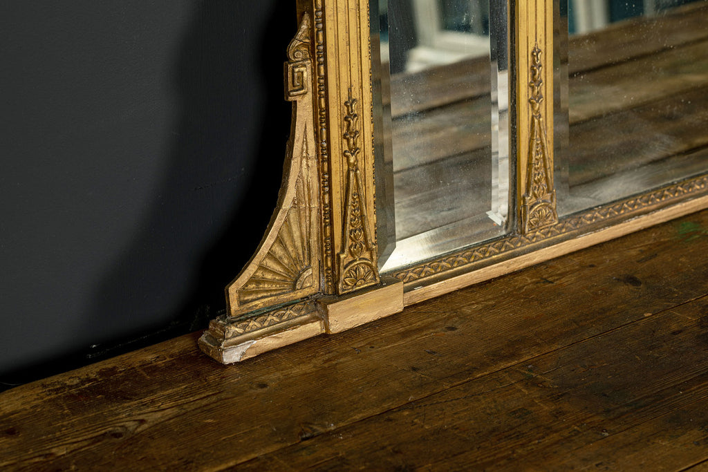 Fine Regency overmantle mirror, the gilded framework with ribbon, garland and floral details enclosing three bevelled edge mirror plates. Original form, original back and beautiful even before you appear in it.