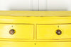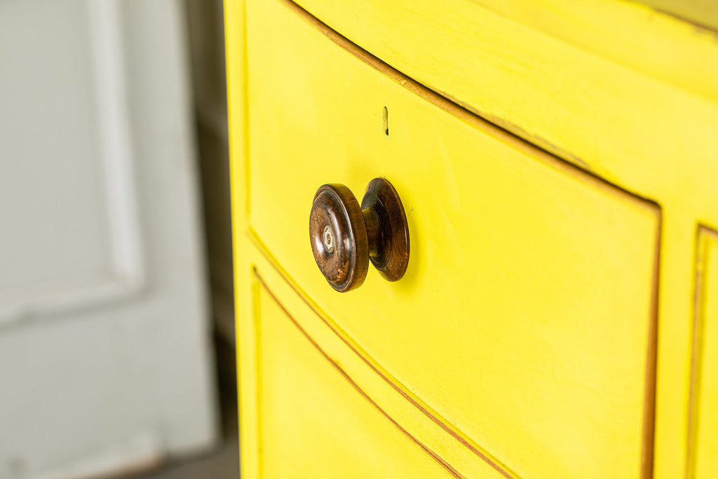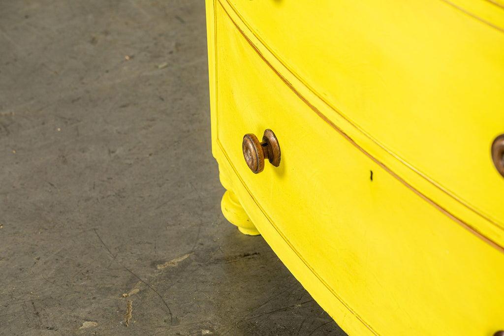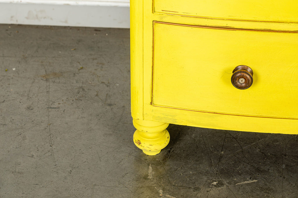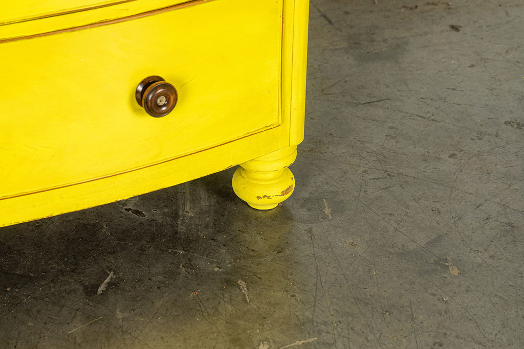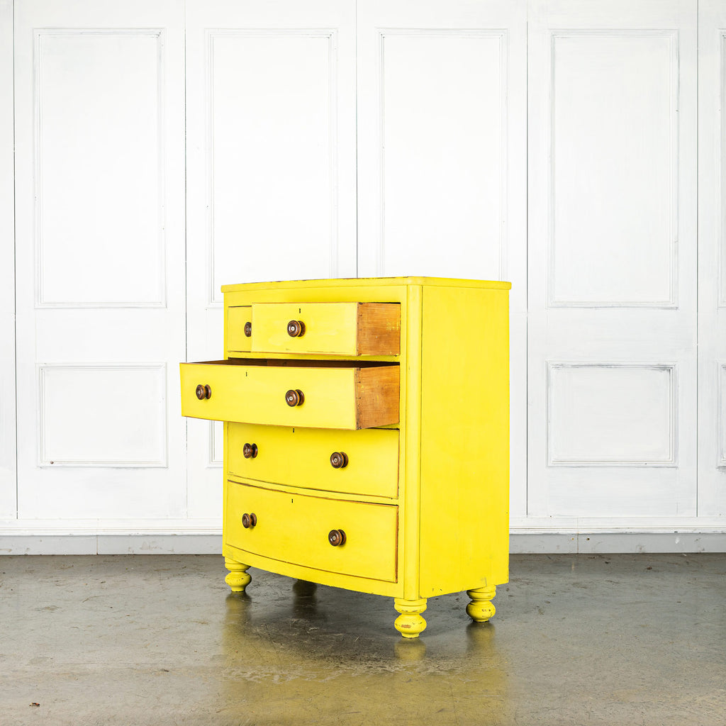 Lovely 19th Century mahogany bow fronted chest of drawers of two short and three long graduated cockbeaded drawers with original turned handles and turned bun feet. Our yellow chests always find interesting homes, one of them is doing night life in a Soho wine bar! Let a little sunshine into your life!