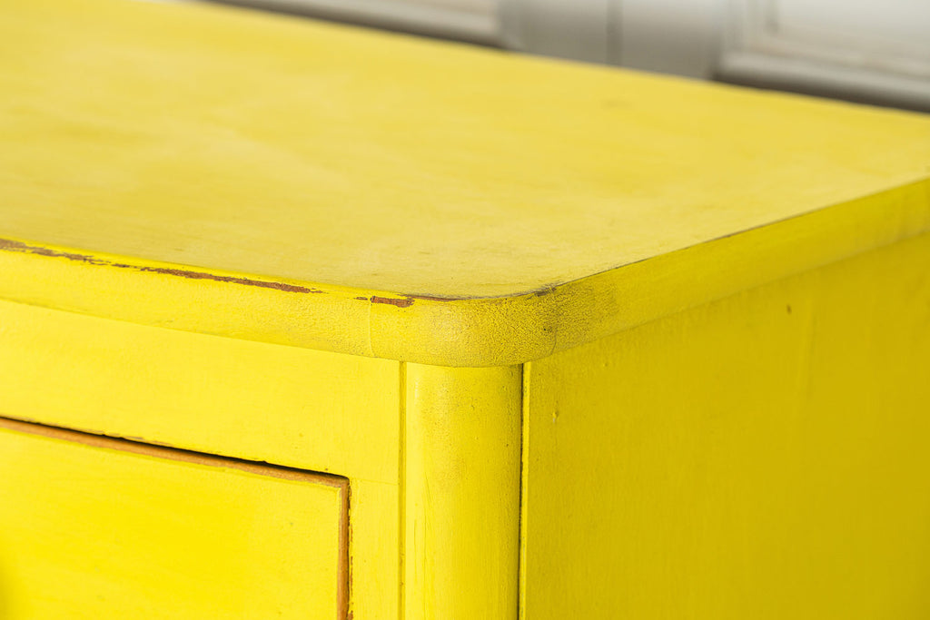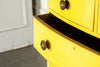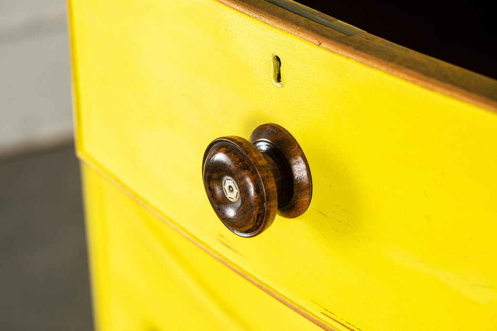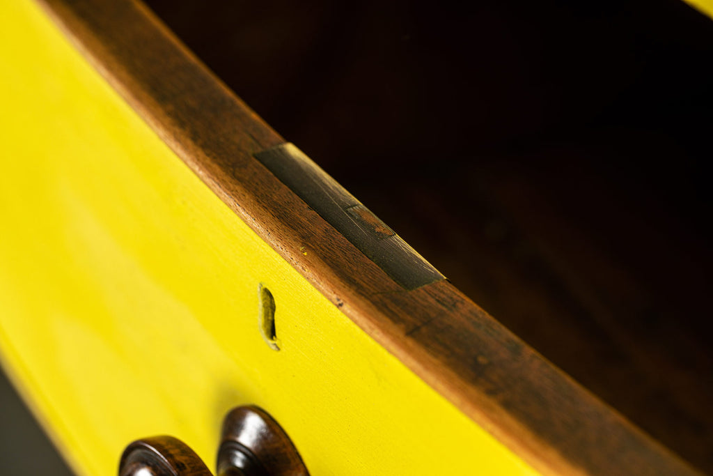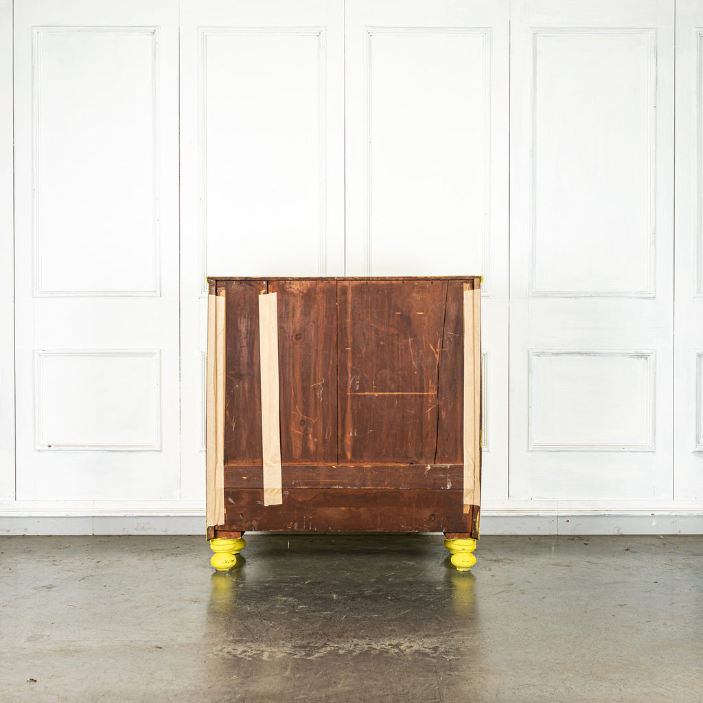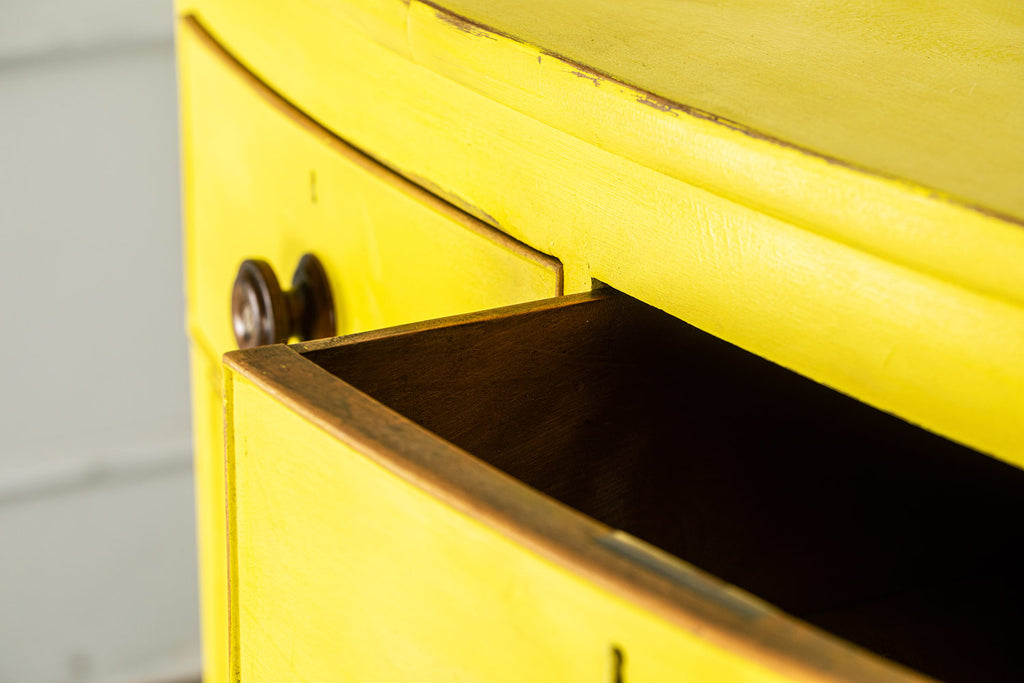 Lovely 19th Century mahogany bow fronted chest of drawers of two short and three long graduated cockbeaded drawers with original turned handles and turned bun feet. Our yellow chests always find interesting homes, one of them is doing night life in a Soho wine bar! Let a little sunshine into your life!