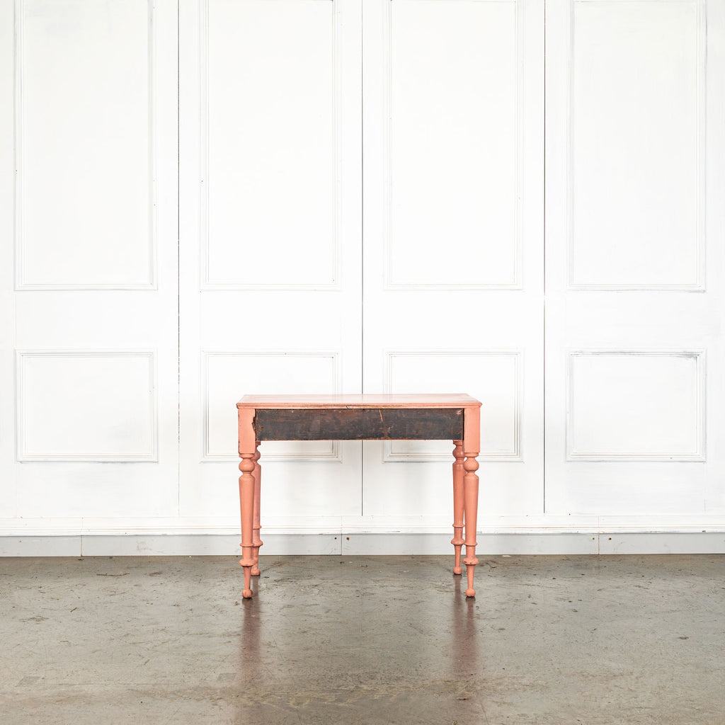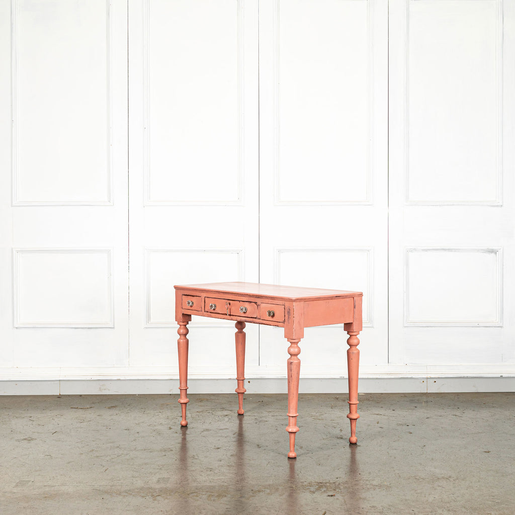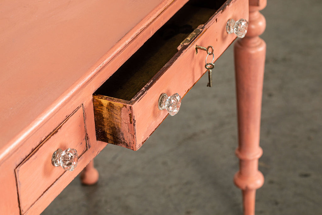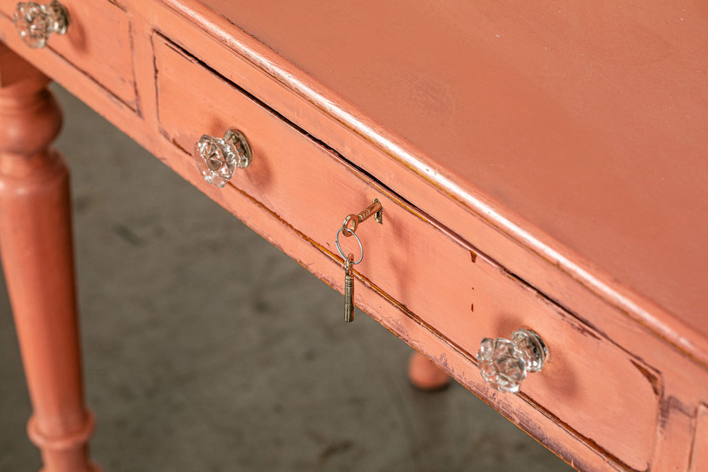 Lovely Victorian mahogany painted side table with three frieze drawers, the central one lock and key, the two flanking drawers with a secret locking mechanism operated from within the central drawer. Decorative glass handles probably later but lovely.