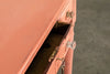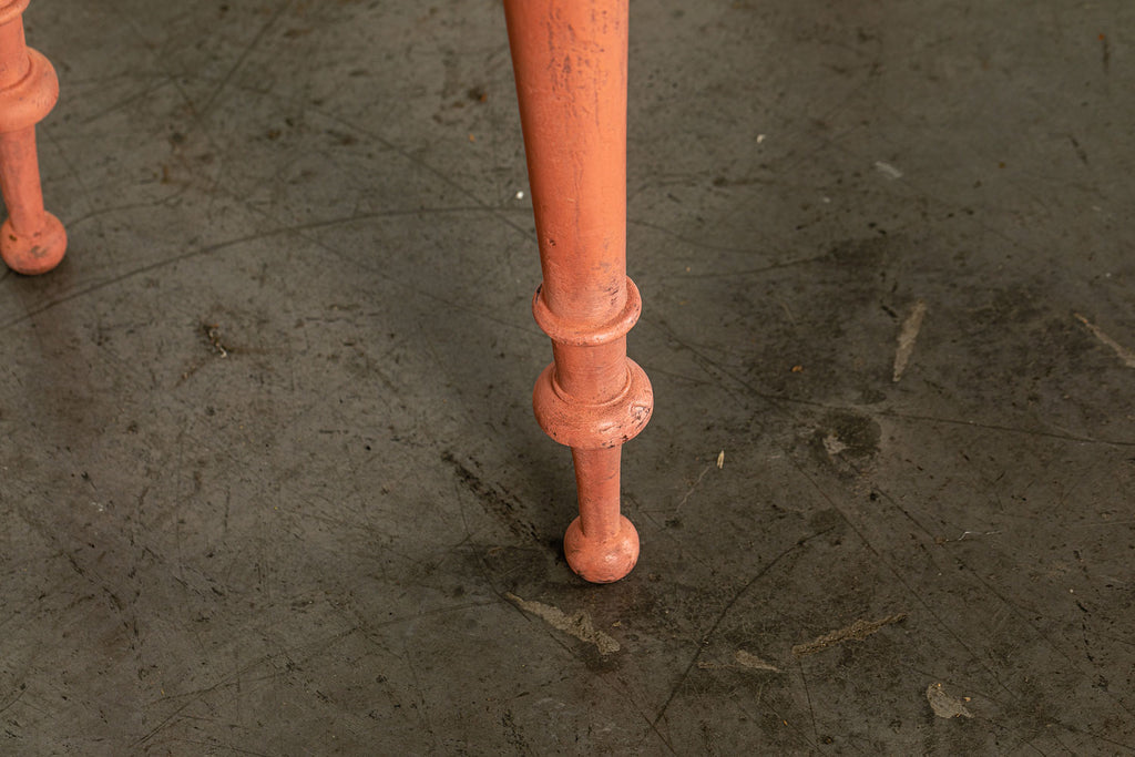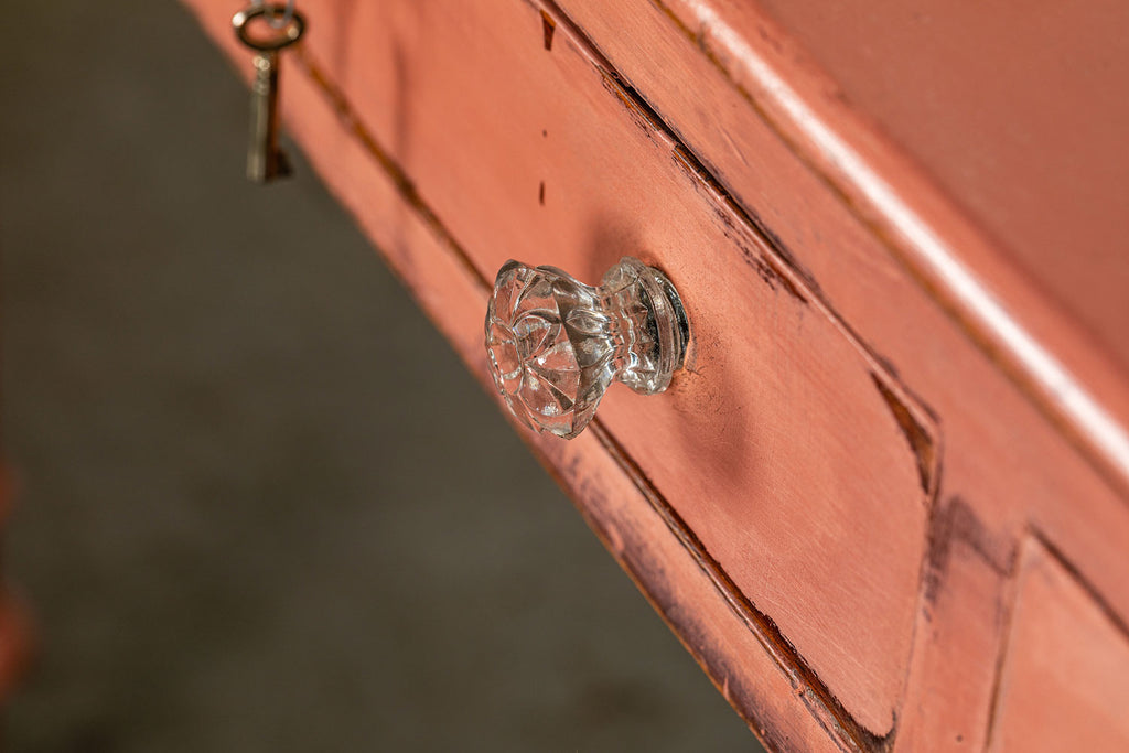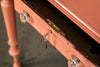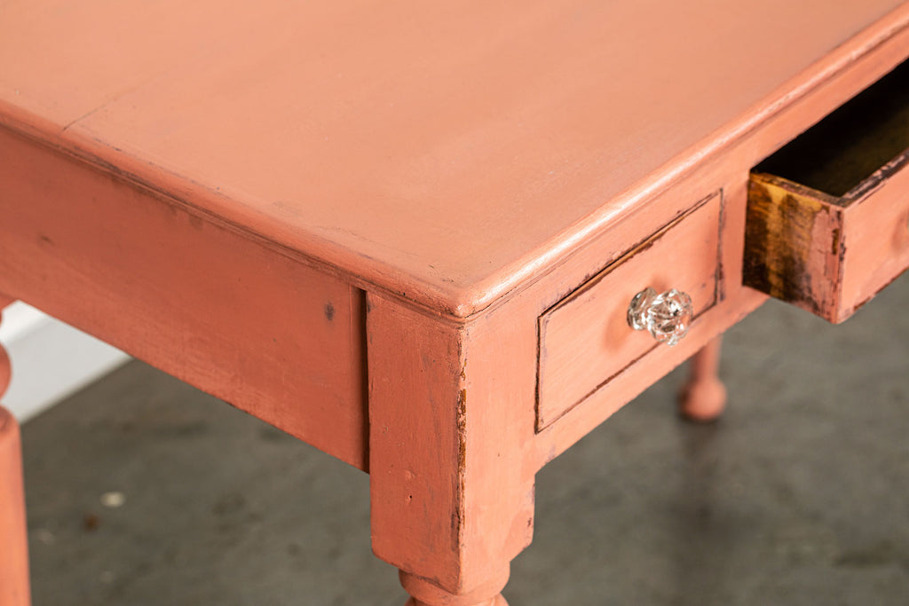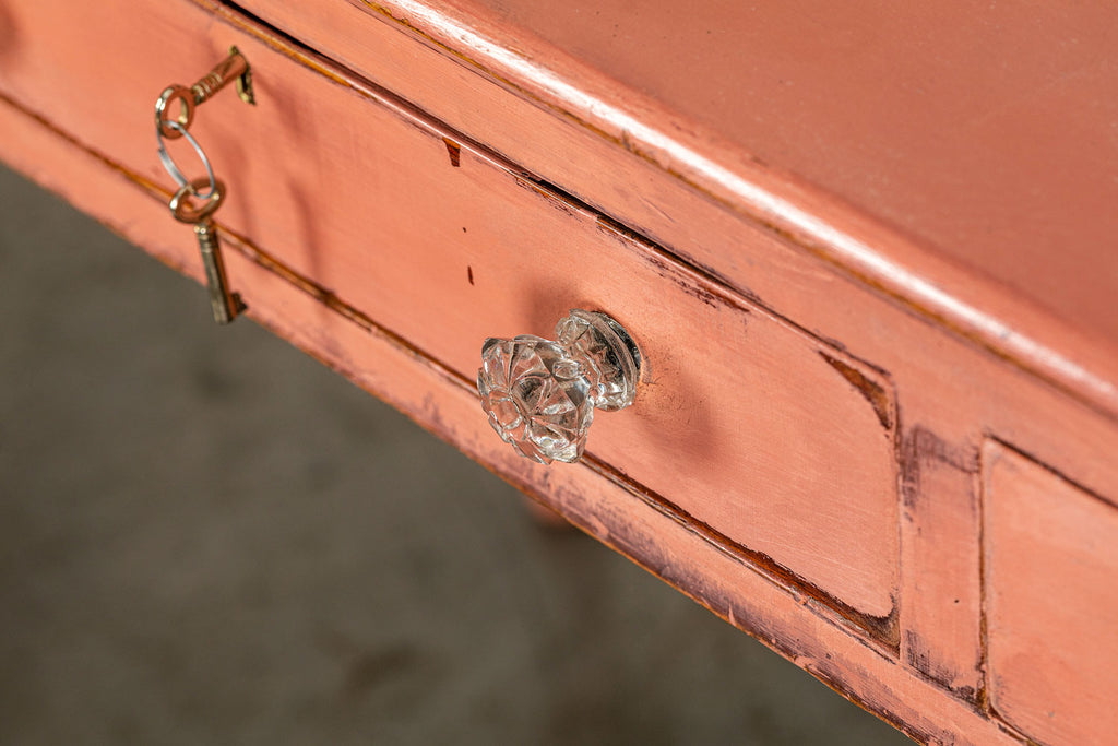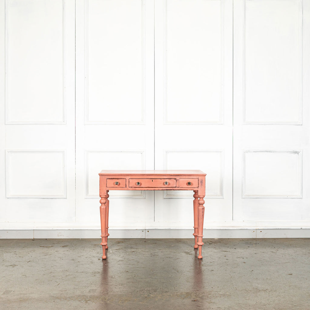 Lovely Victorian mahogany painted side table with three frieze drawers, the central one lock and key, the two flanking drawers with a secret locking mechanism operated from within the central drawer. Decorative glass handles probably later but lovely.
