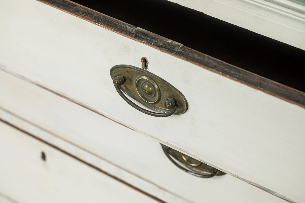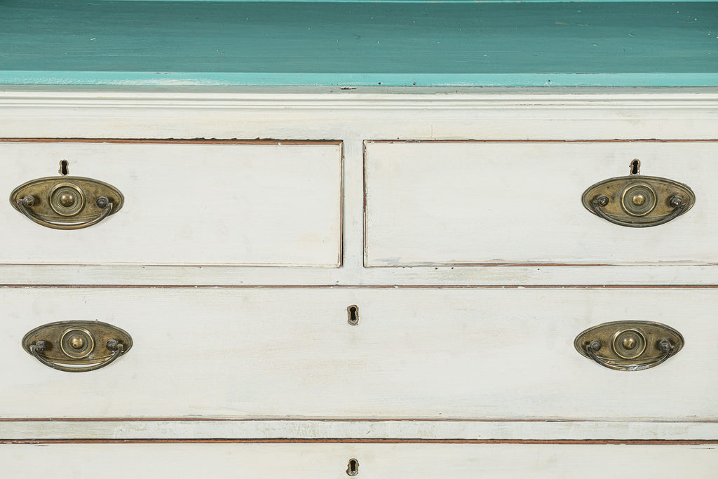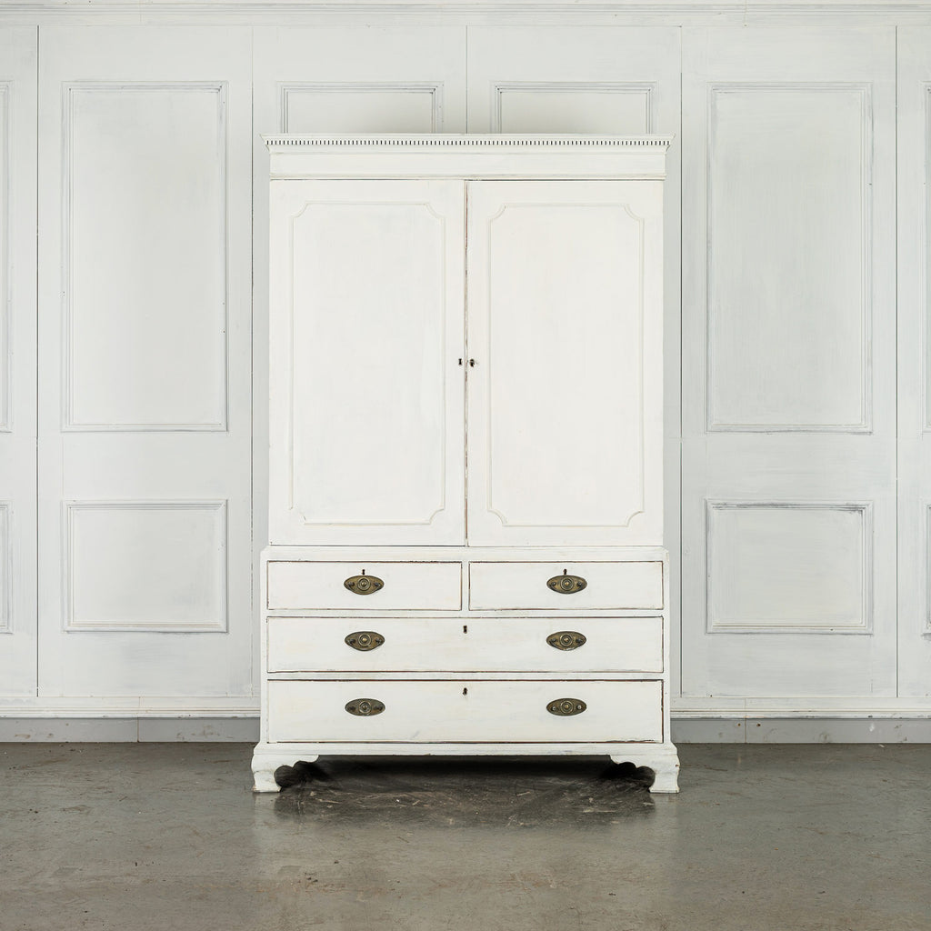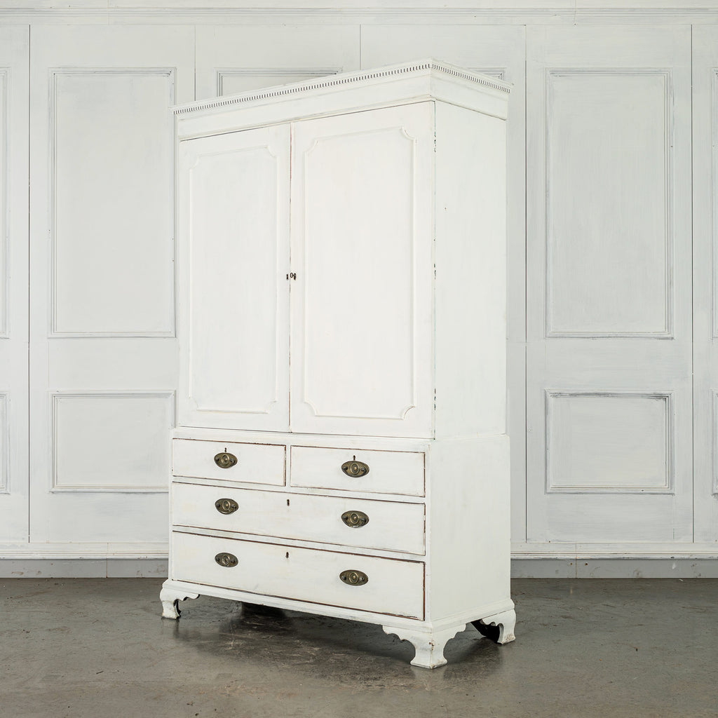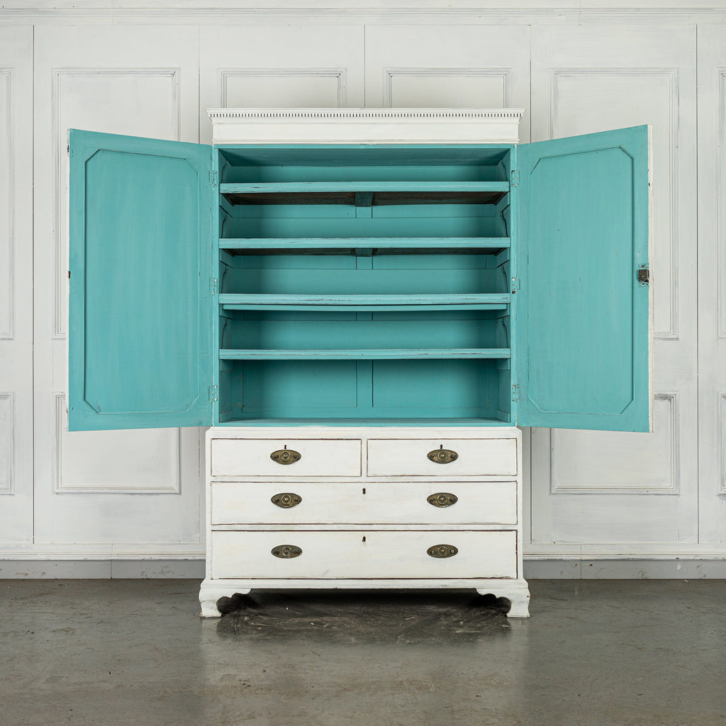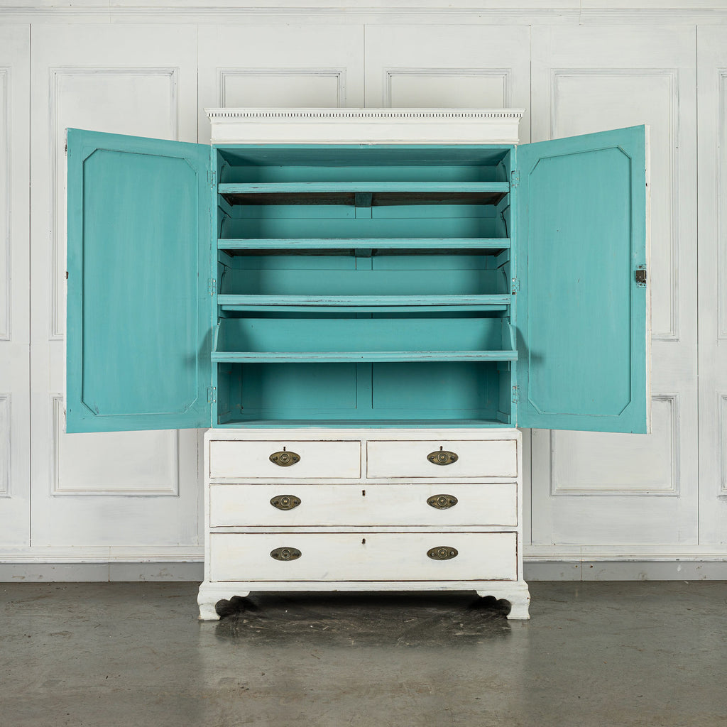 19th Century Mahogany Linen Press, later painted in a beautiful chalk white and a green (or is it blue?) interior. The moulded dentil cornice sits above the two panelled doors which enclose linen slides.  Below are two short and two long cockbeaded drawers with attractive brass plate handles on ogee bracket feet.
