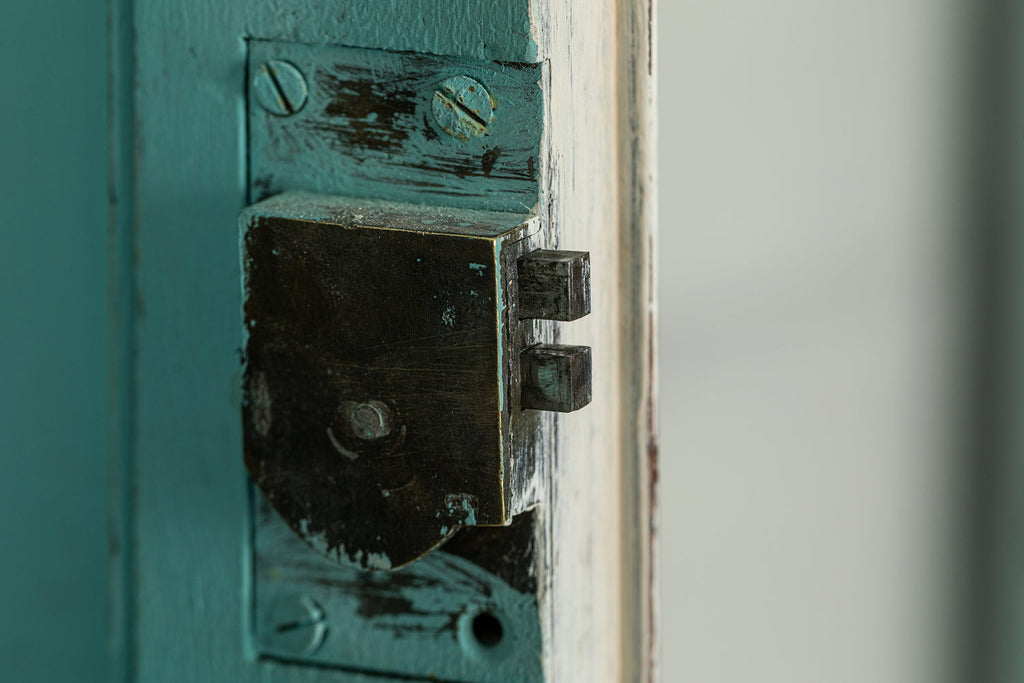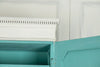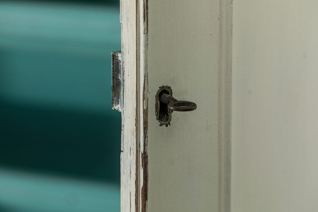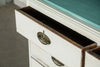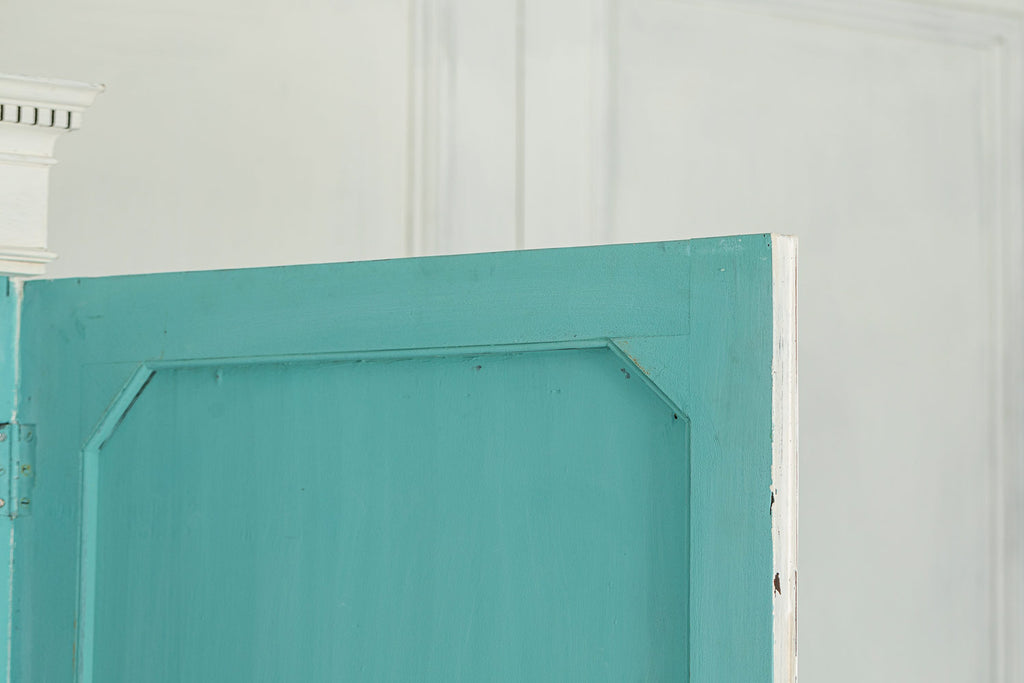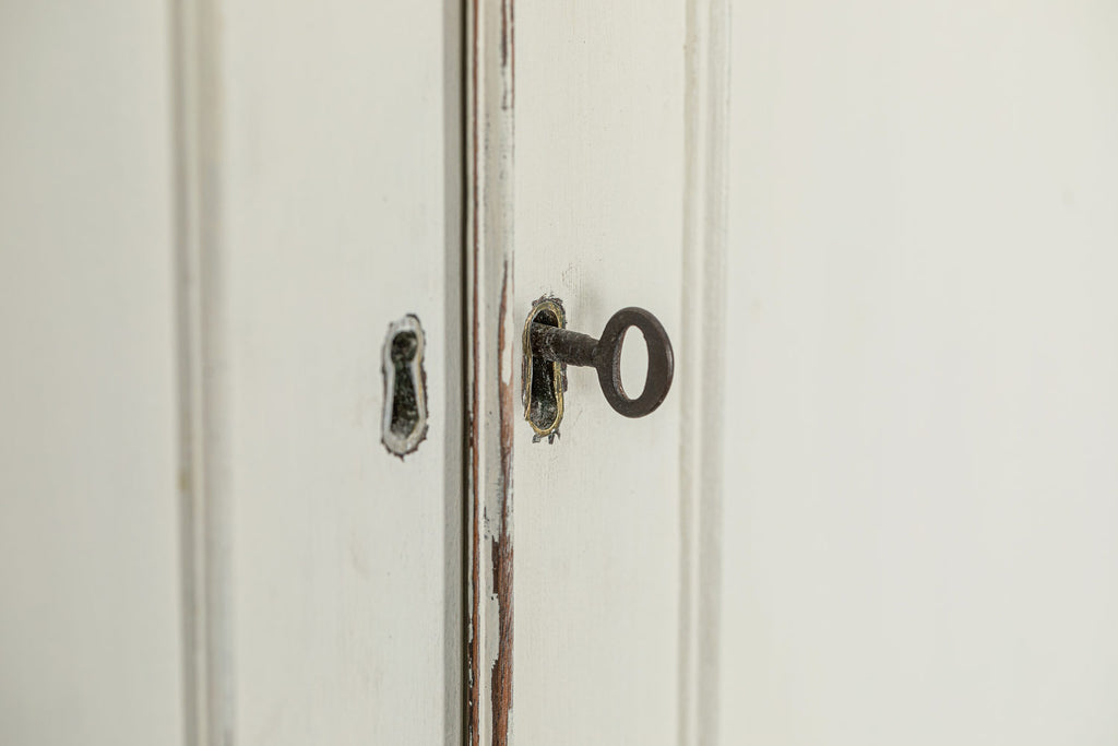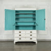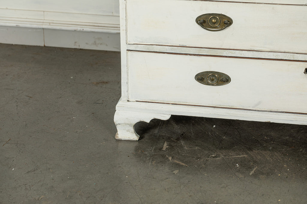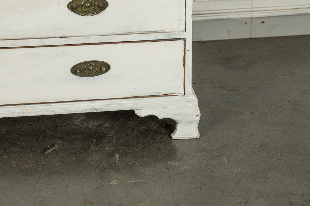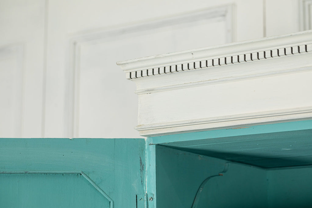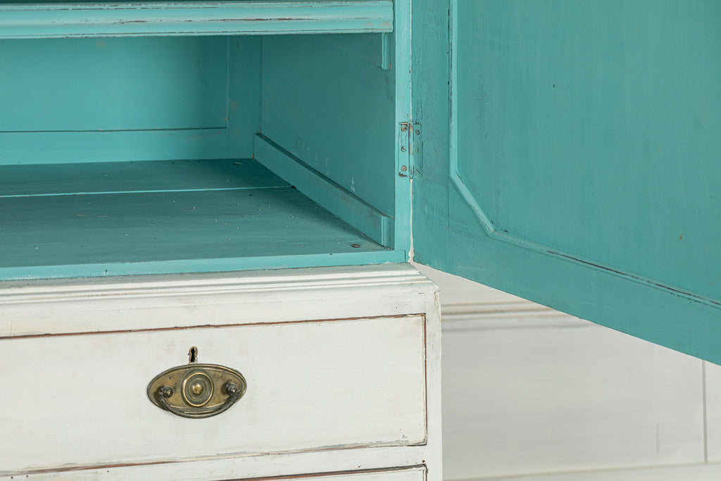 19th Century Mahogany Linen Press, later painted in a beautiful chalk white and a green (or is it blue?) interior. The moulded dentil cornice sits above the two panelled doors which enclose linen slides.  Below are two short and two long cockbeaded drawers with attractive brass plate handles on ogee bracket feet.