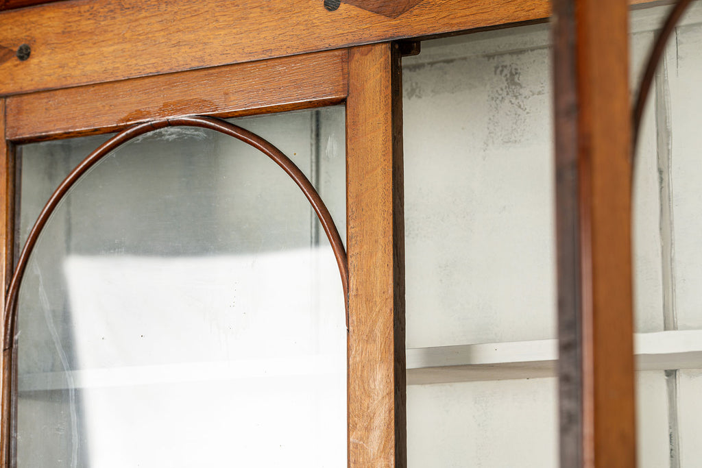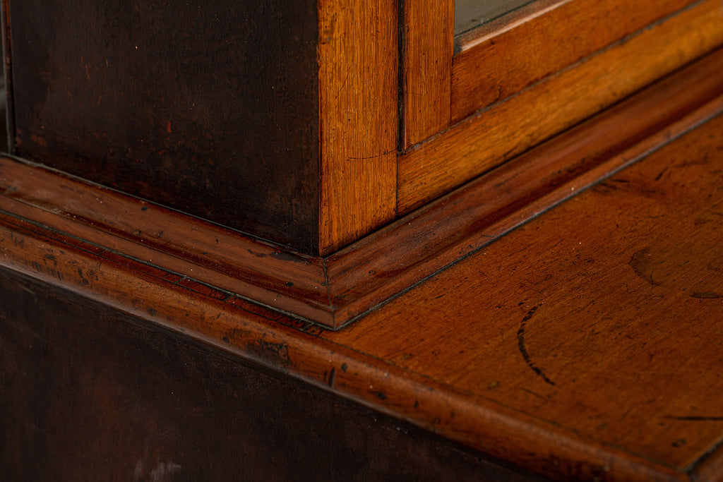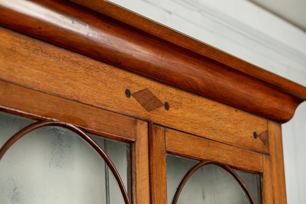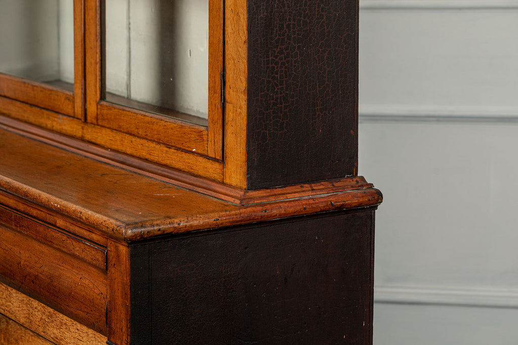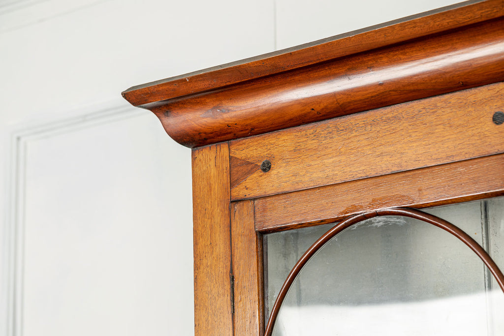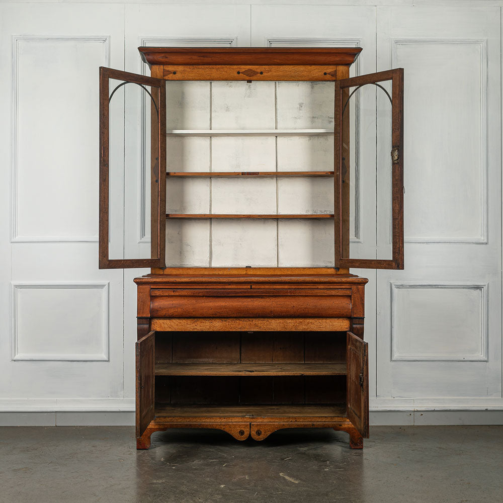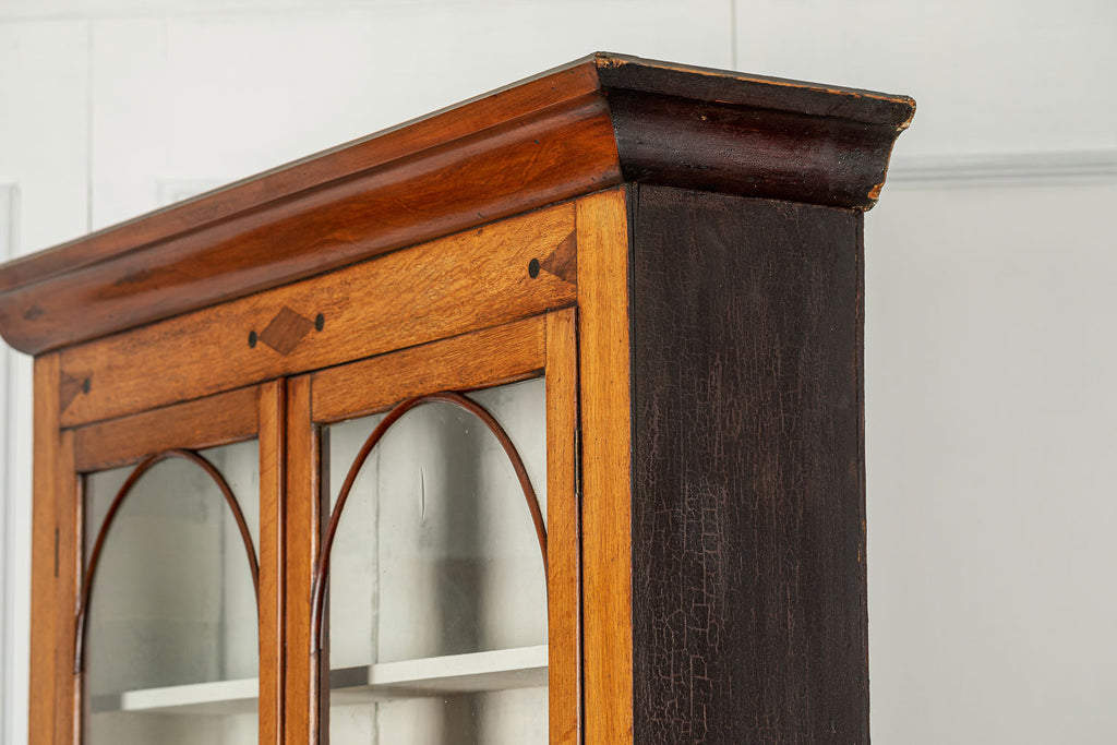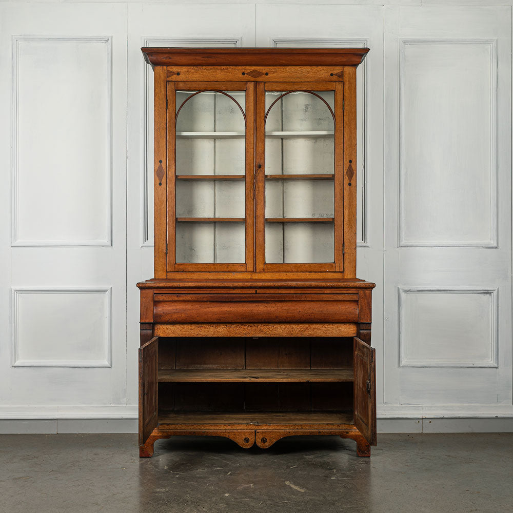 Unusual 19th Century Welsh oak dress or bookcase with glazed panelled doors enclosing three fixed shelves with limed pine back boards above an ogee frieze drawer, wth panelled doors below enclosing pine shelf interior - all on bracket feet. A well proportioned piece of honey coloured oak and decorative mahogany with a wonderful patina and original crackle varnish to the sides. All locks and latches present with key.