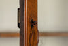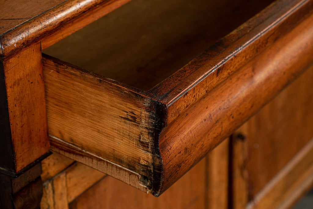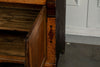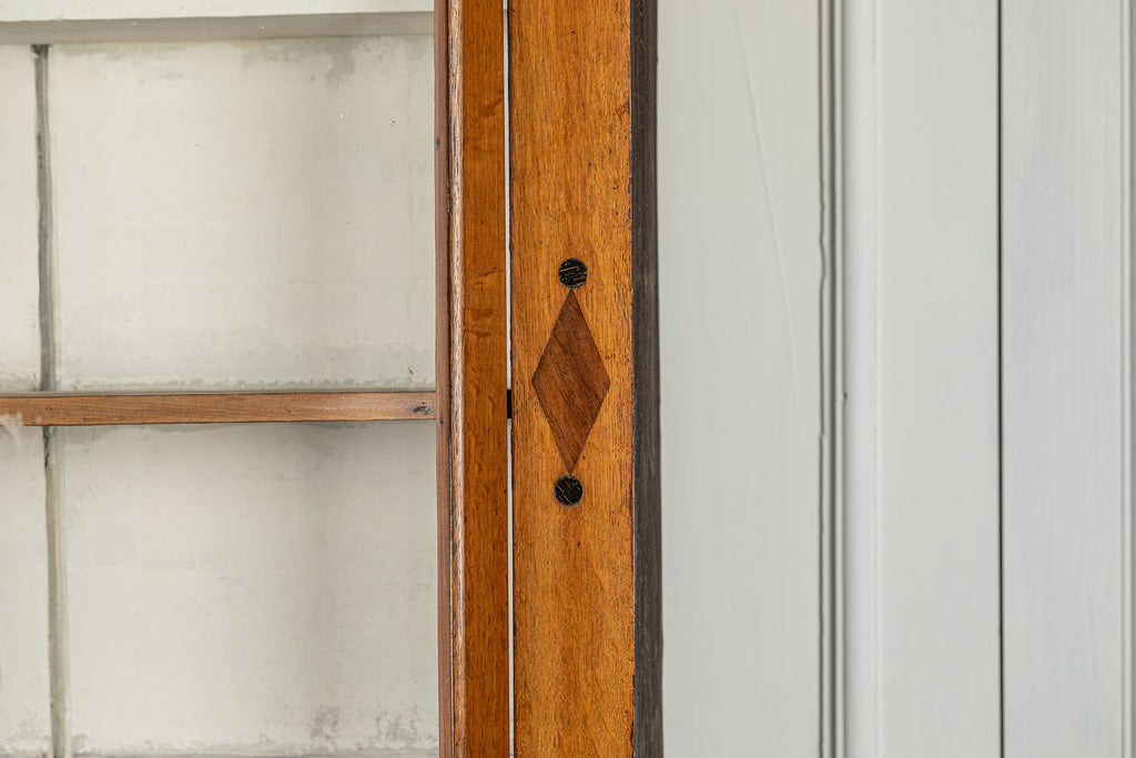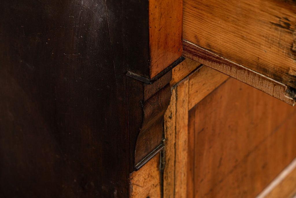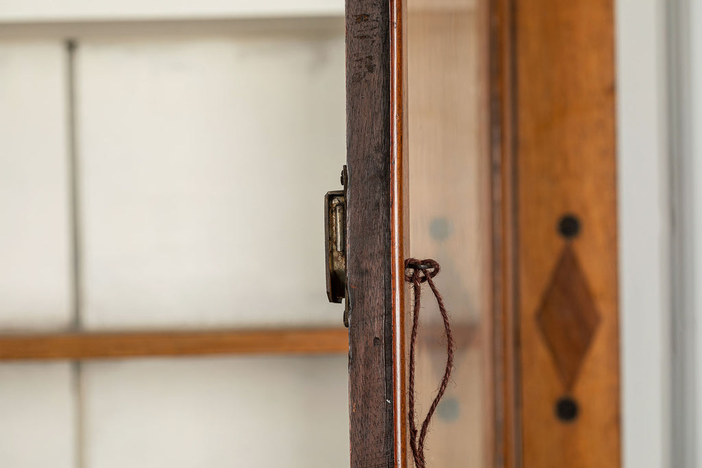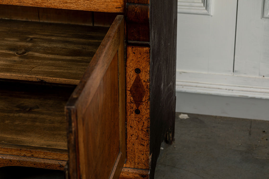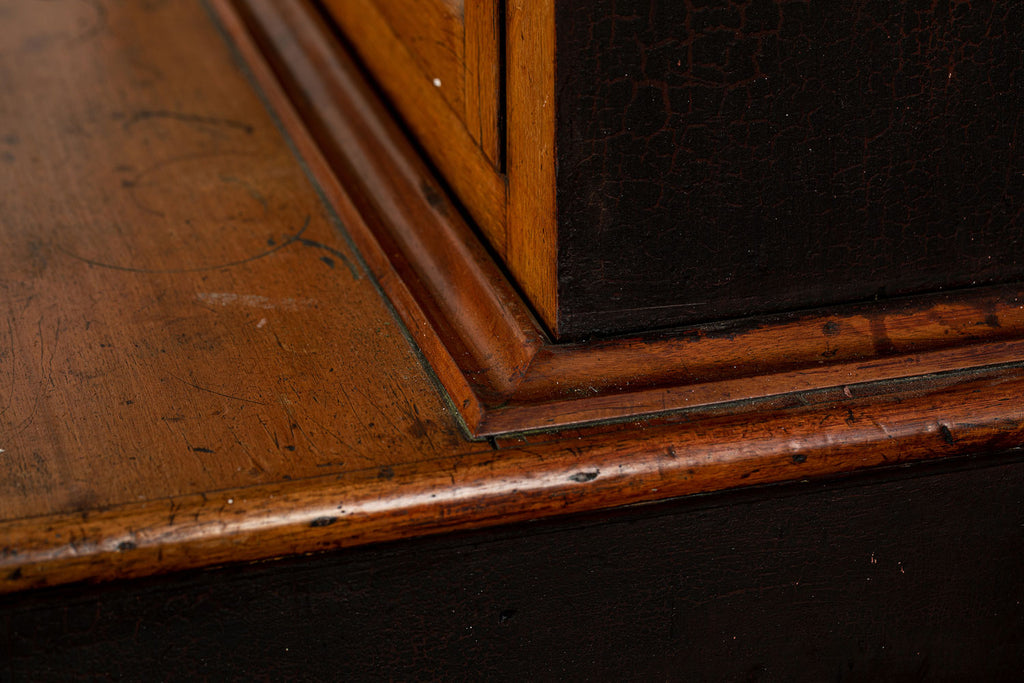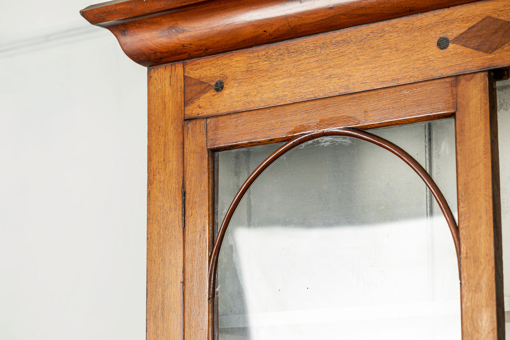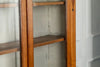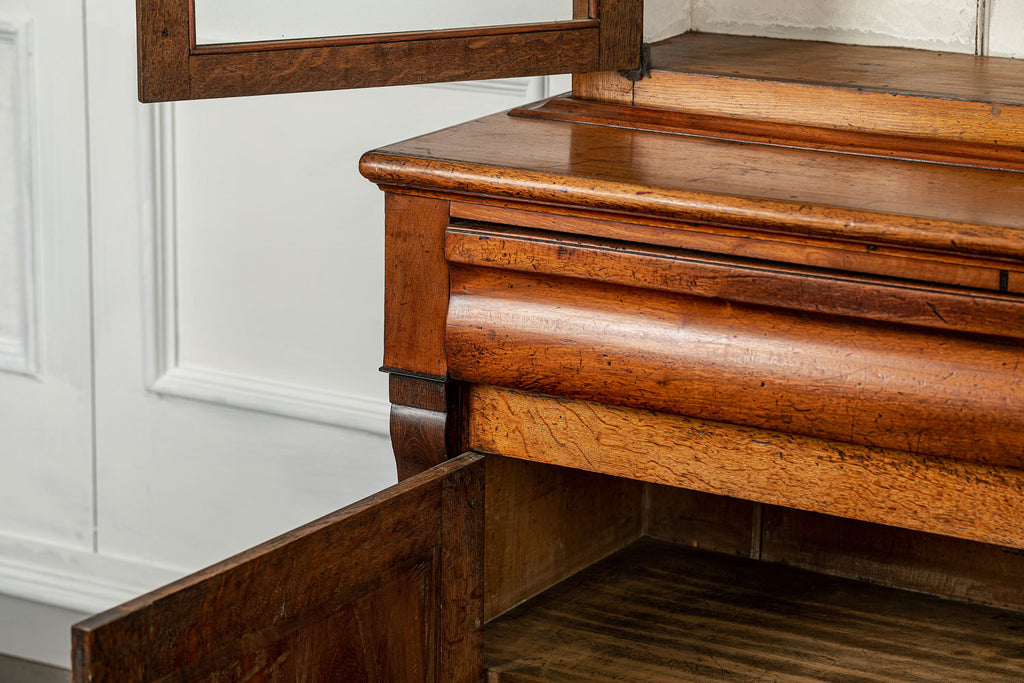 Unusual 19th Century Welsh oak dress or bookcase with glazed panelled doors enclosing three fixed shelves with limed pine back boards above an ogee frieze drawer, wth panelled doors below enclosing pine shelf interior - all on bracket feet. A well proportioned piece of honey coloured oak and decorative mahogany with a wonderful patina and original crackle varnish to the sides. All locks and latches present with key.