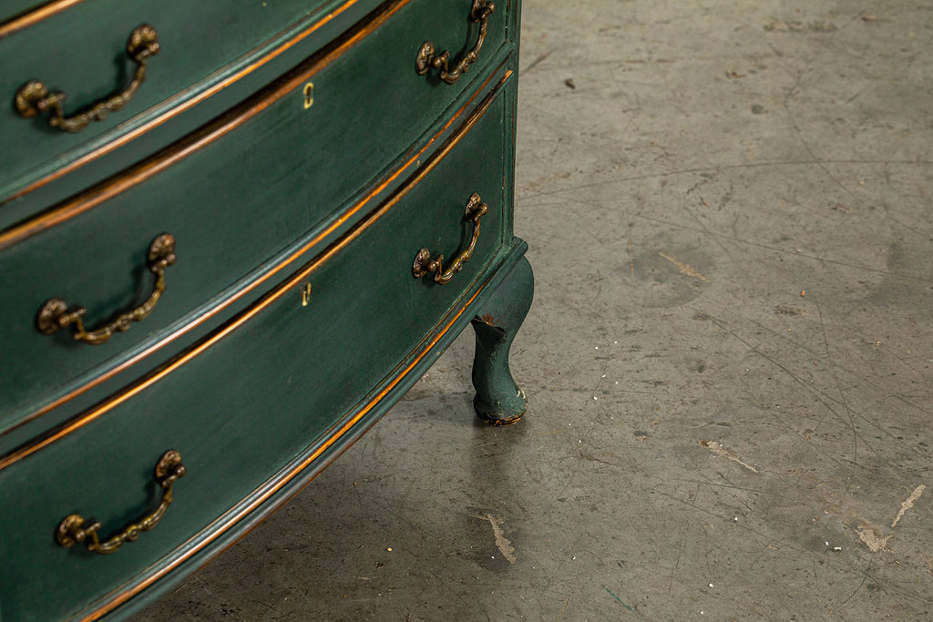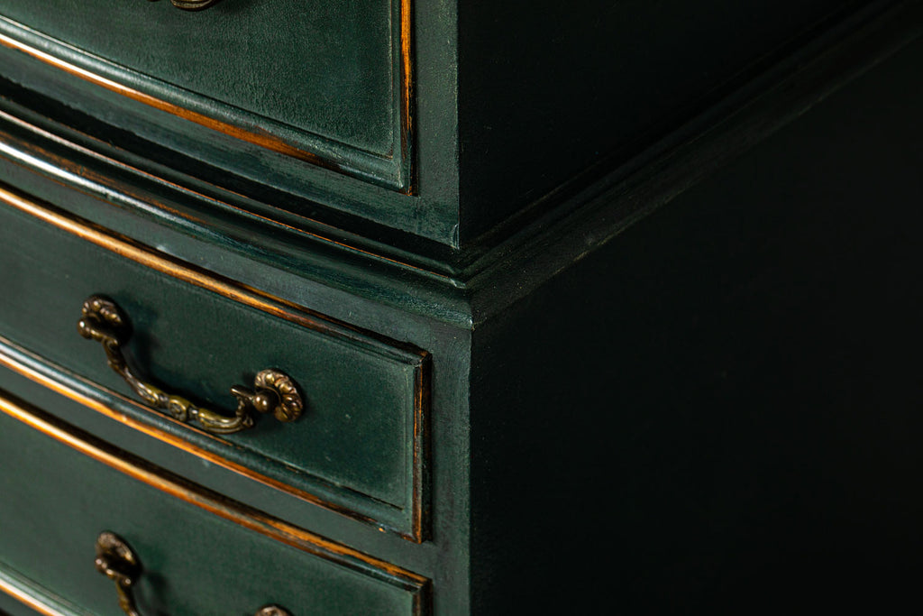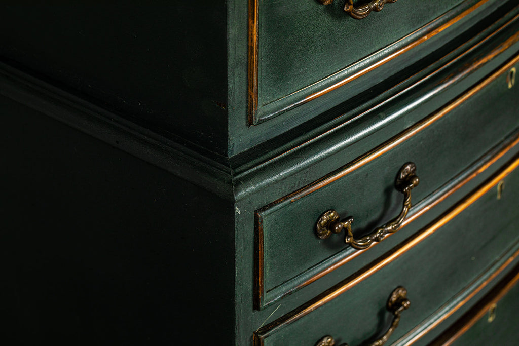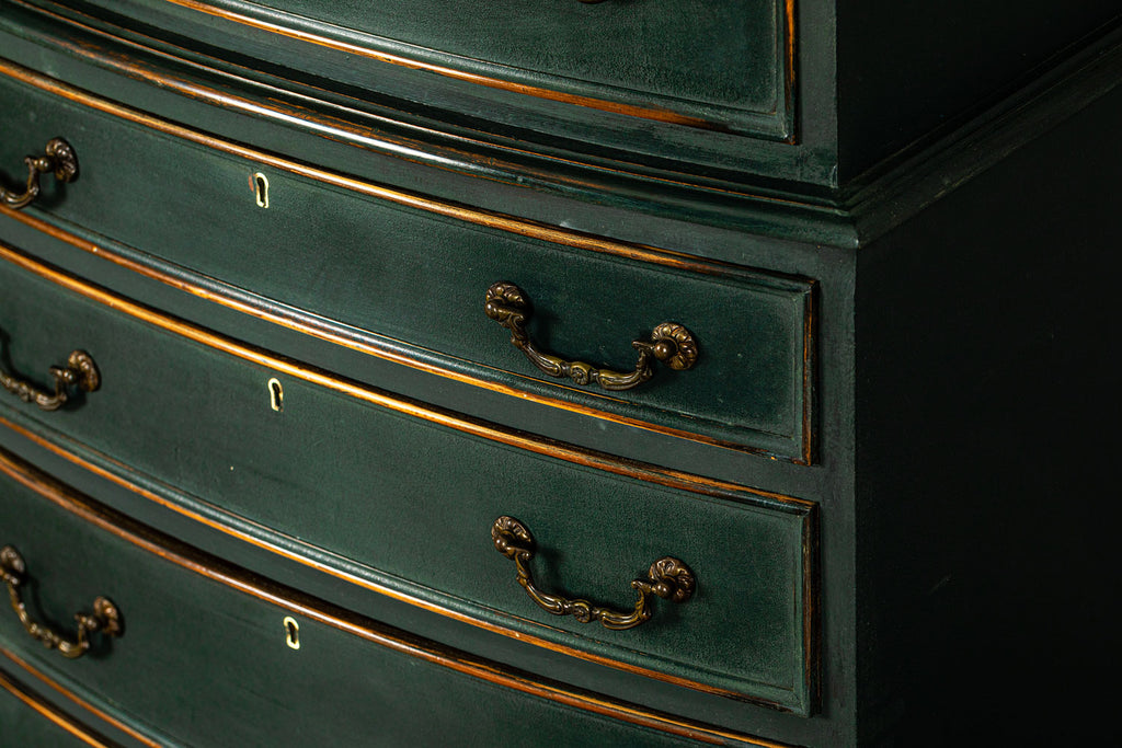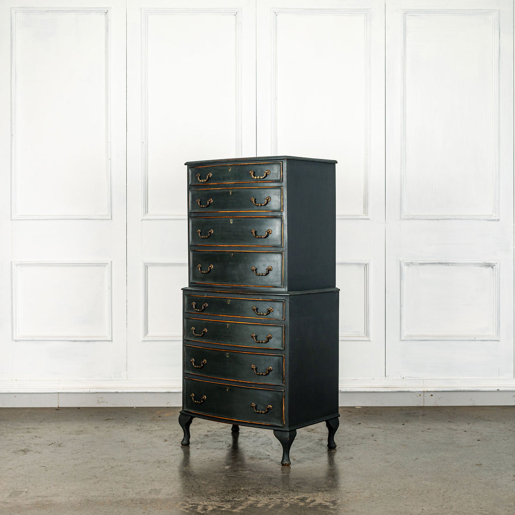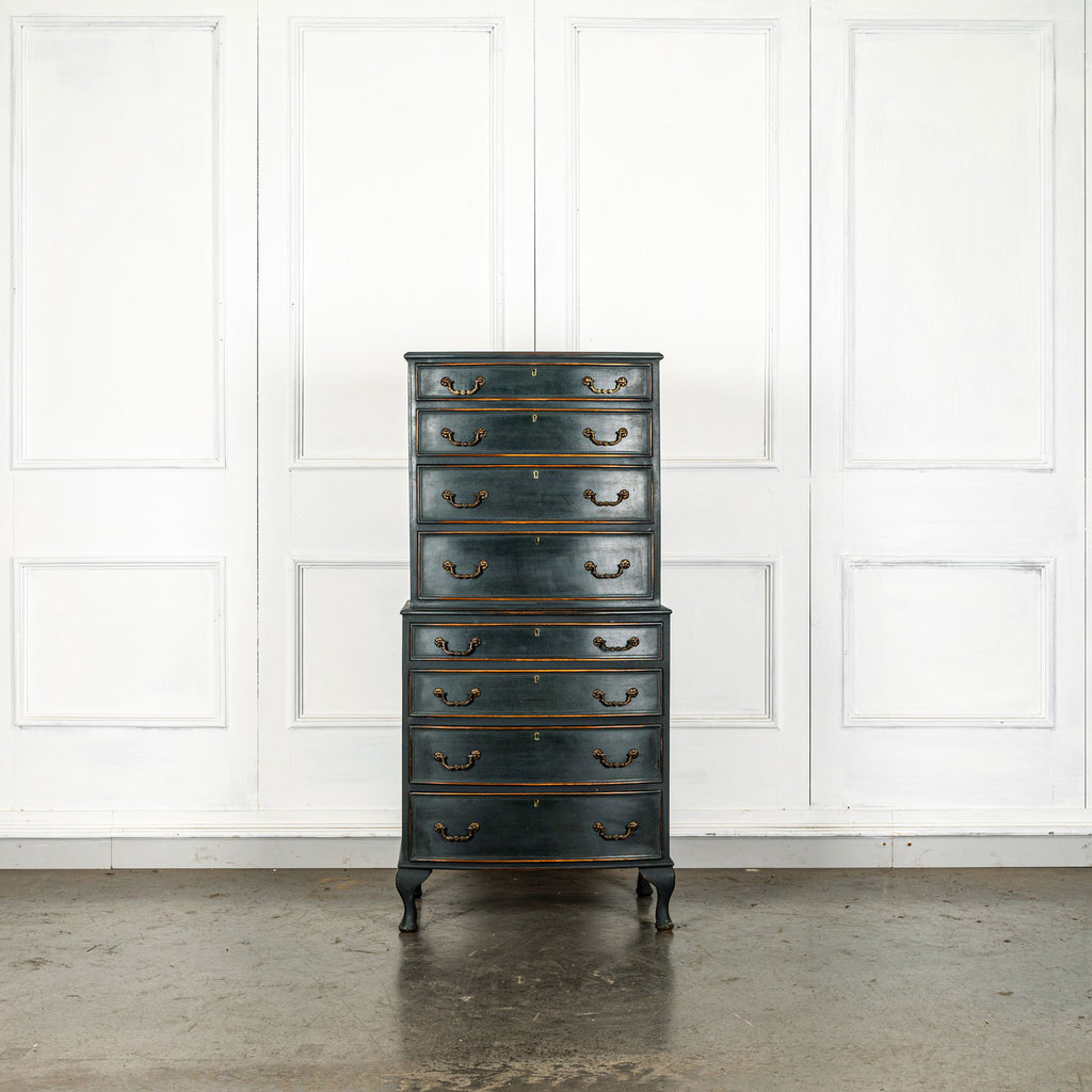 Lovely Georgian Style bow front chest on chest of smaller proportions of eight long graduated drawers raised on cabriolet legs. Painted in our dark green. A very attractive well proportioned piece.