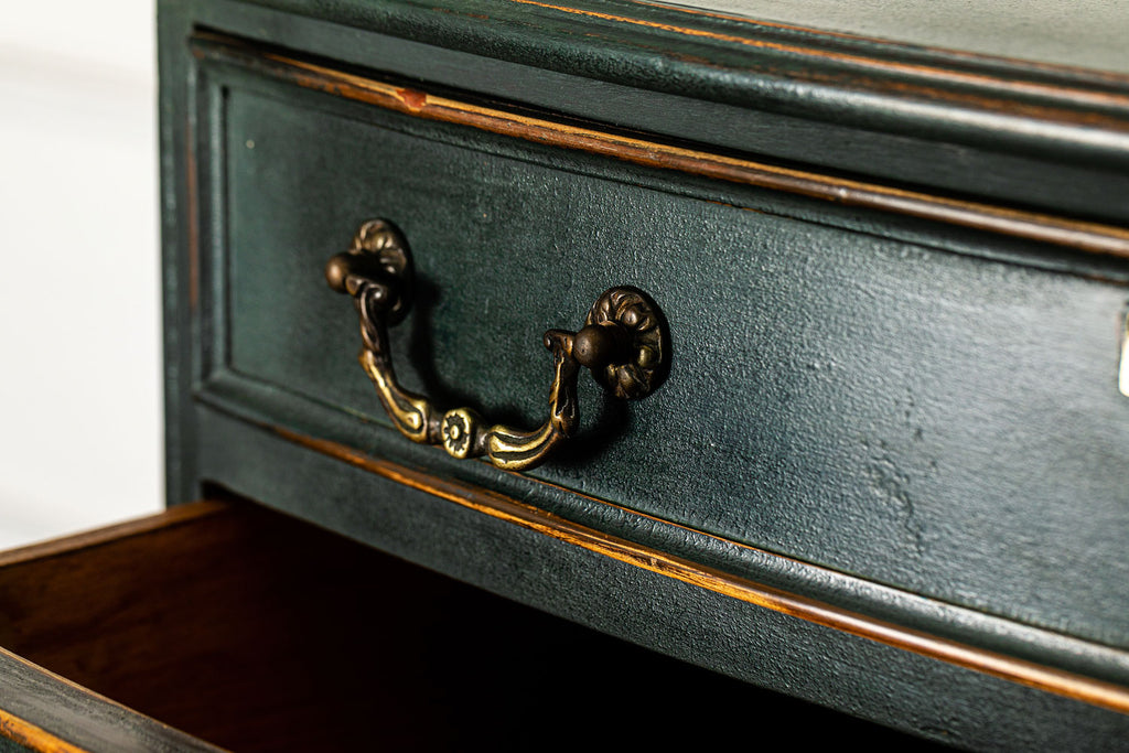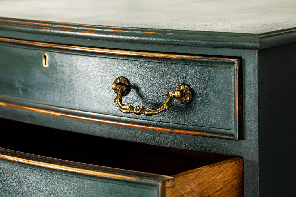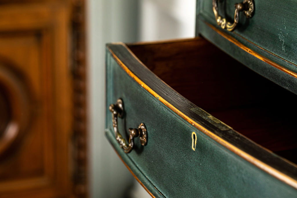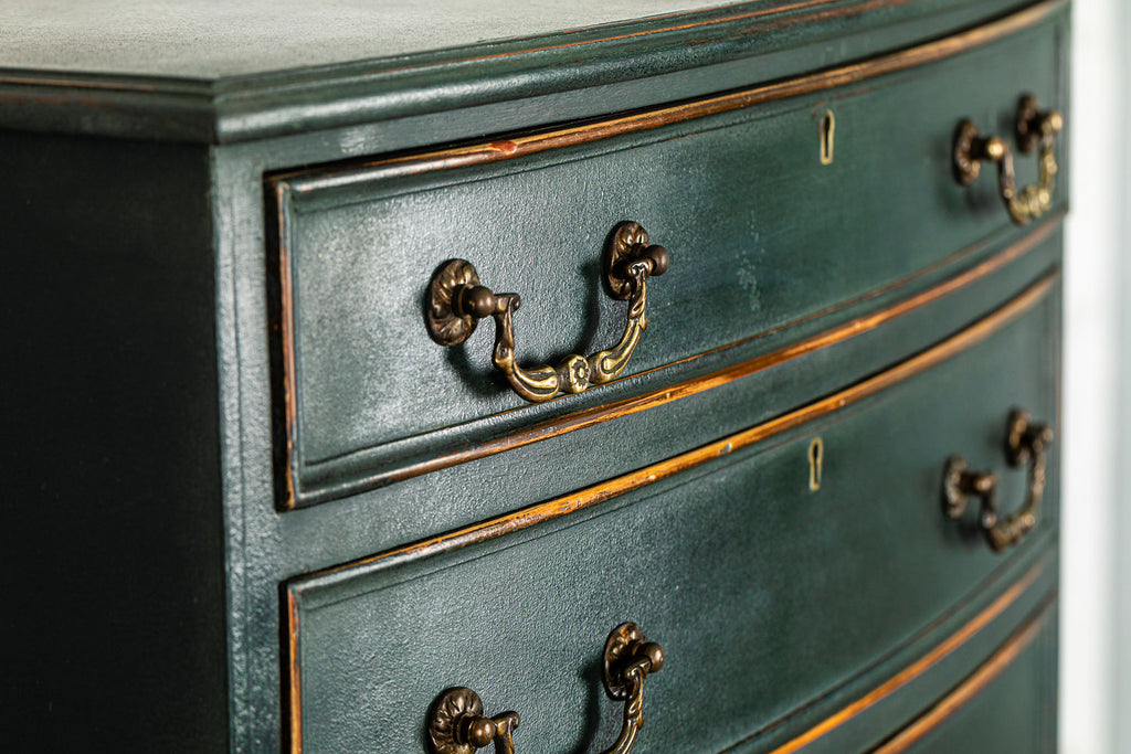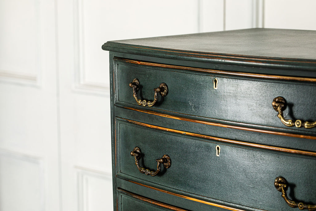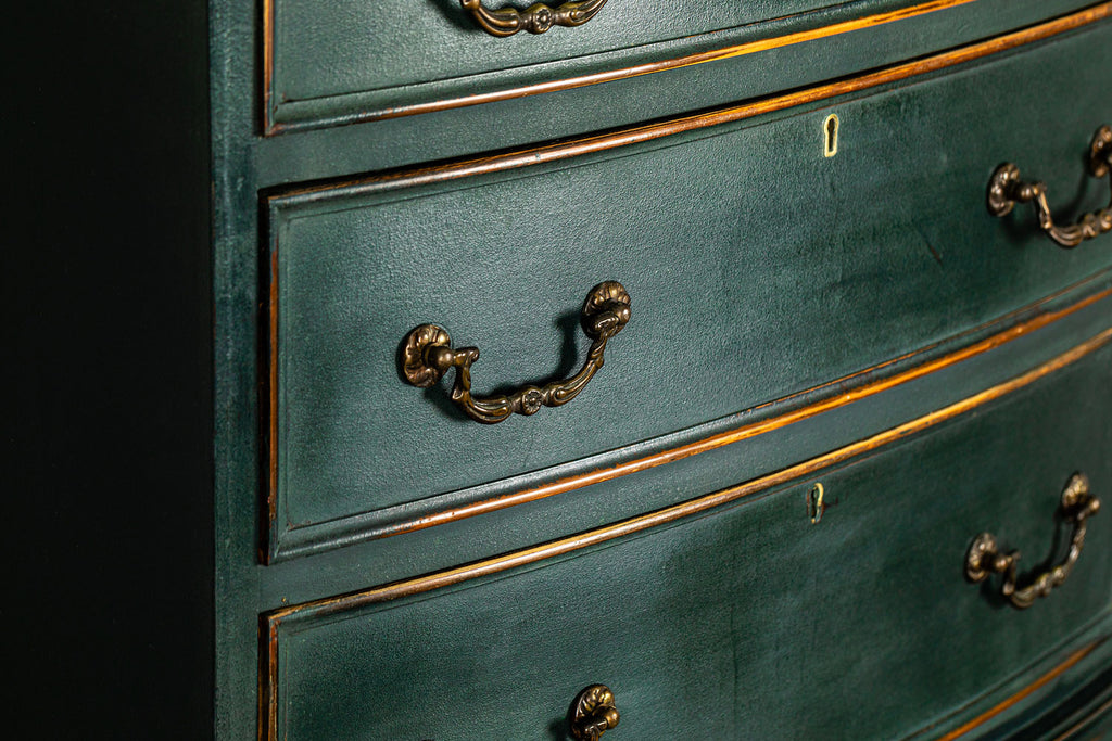 Lovely Georgian Style bow front chest on chest of smaller proportions of eight long graduated drawers raised on cabriolet legs. Painted in our dark green. A very attractive well proportioned piece.