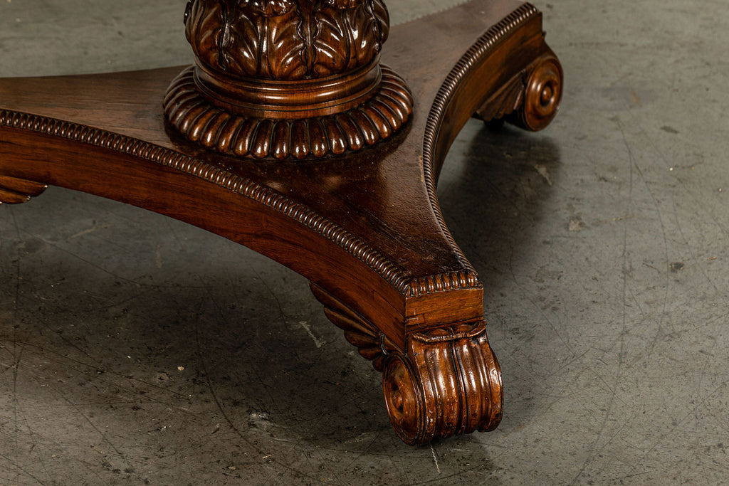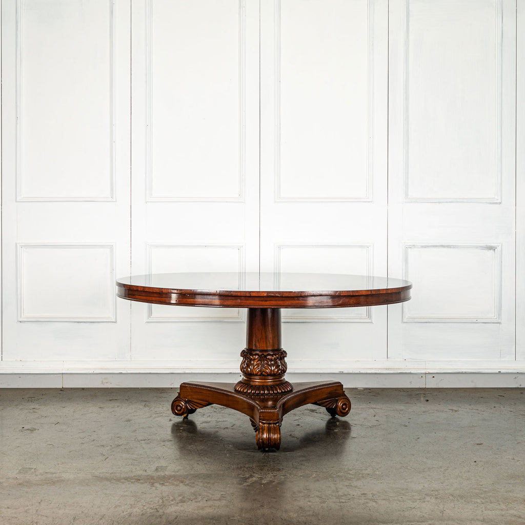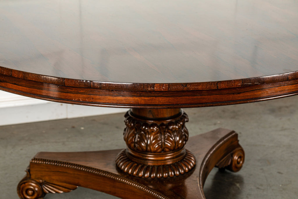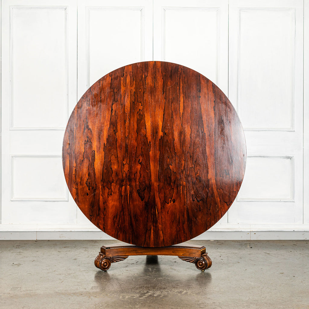 A wonderful Geroge 1V rosewood pedestal table, the circular tilt top to a gun barrel turned and arcanthus leaf carved column, all on a triform base and scroll feet. A wonderful top, a wonderful thing..... to seat up to 8.