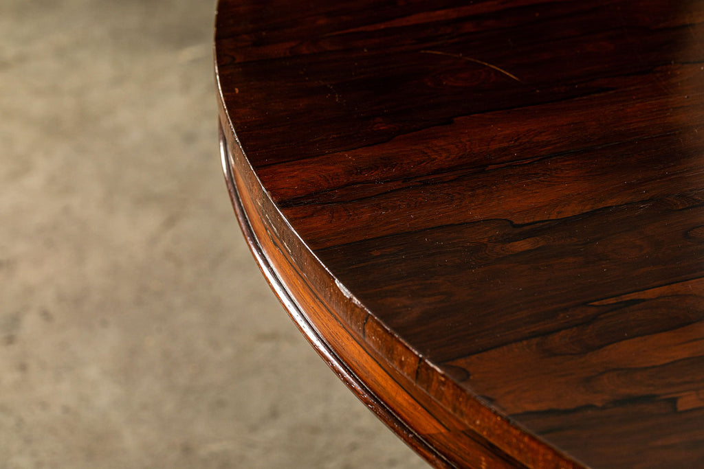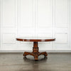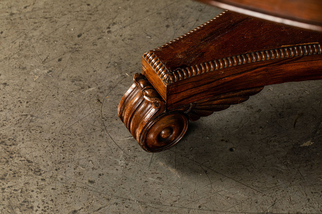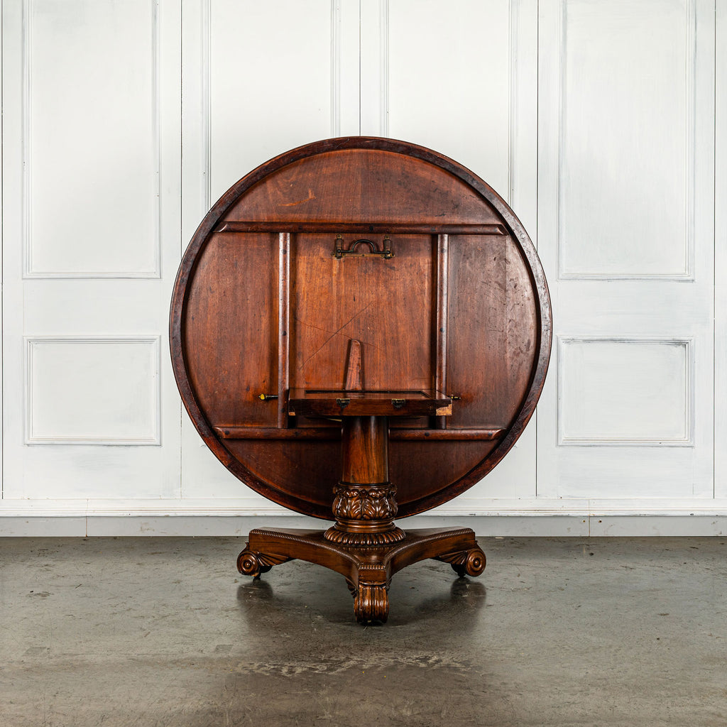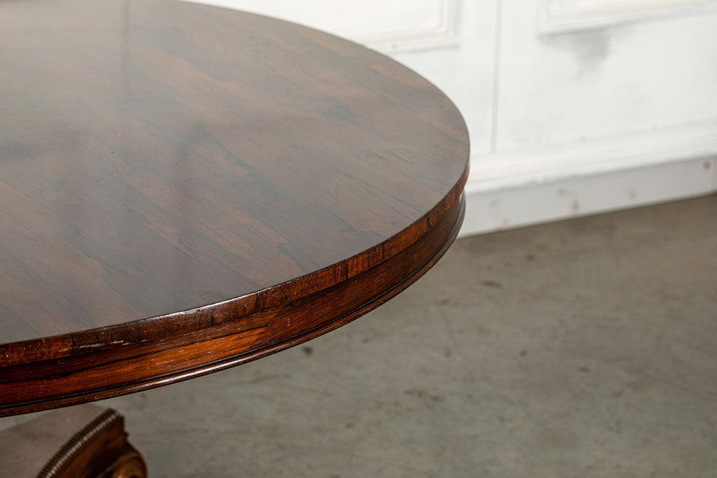 A wonderful Geroge 1V rosewood pedestal table, the circular tilt top to a gun barrel turned and arcanthus leaf carved column, all on a triform base and scroll feet. A wonderful top, a wonderful thing..... to seat up to 8.