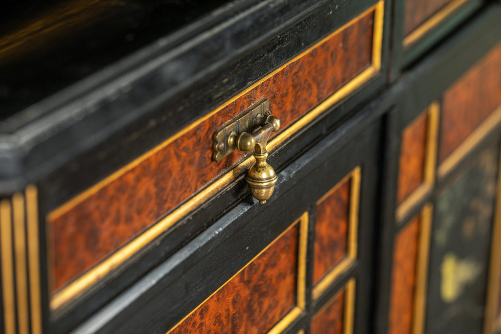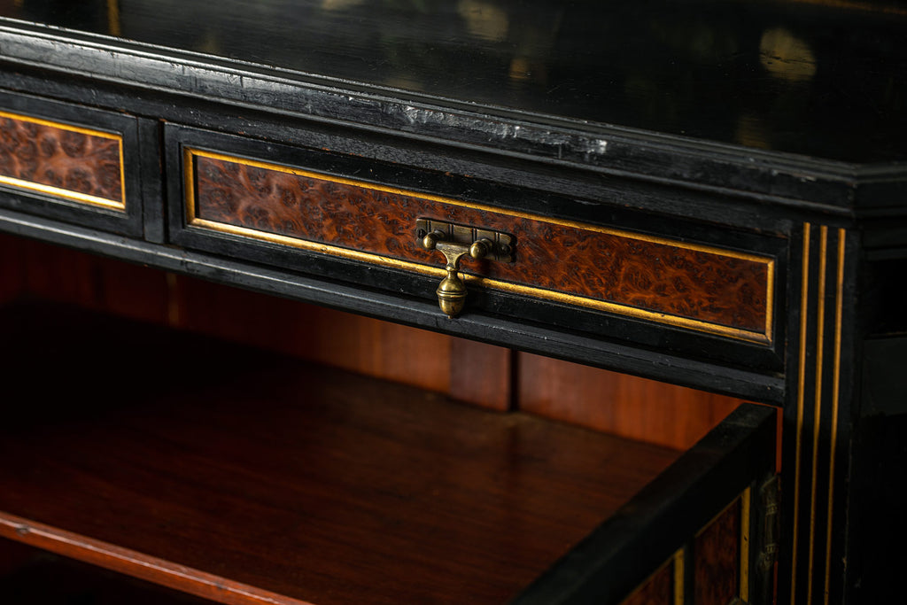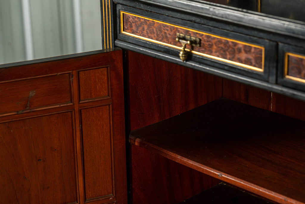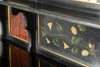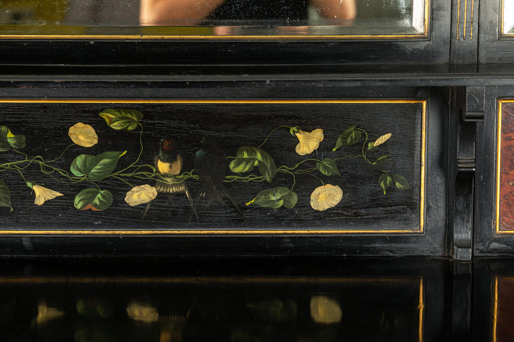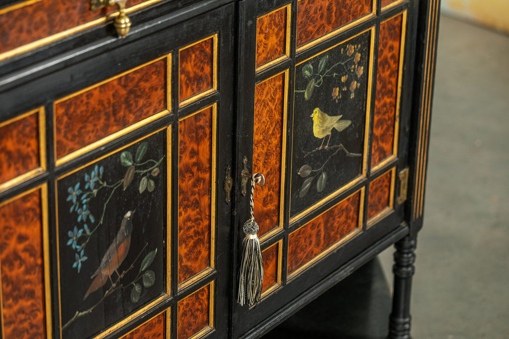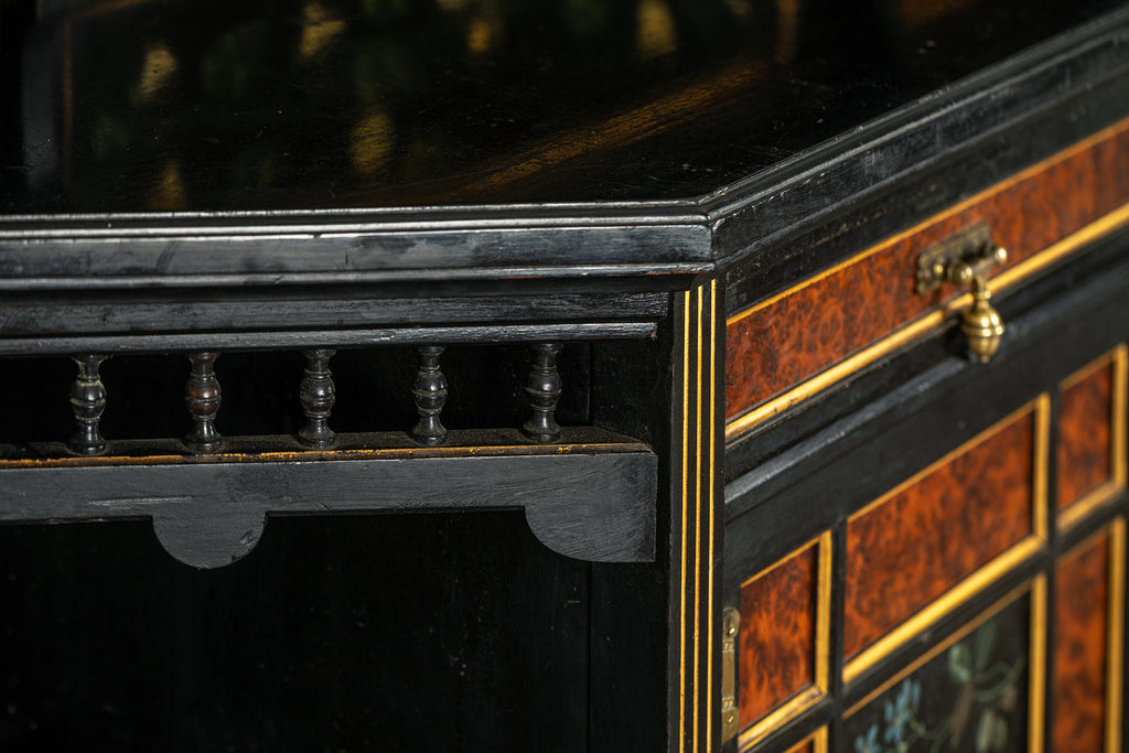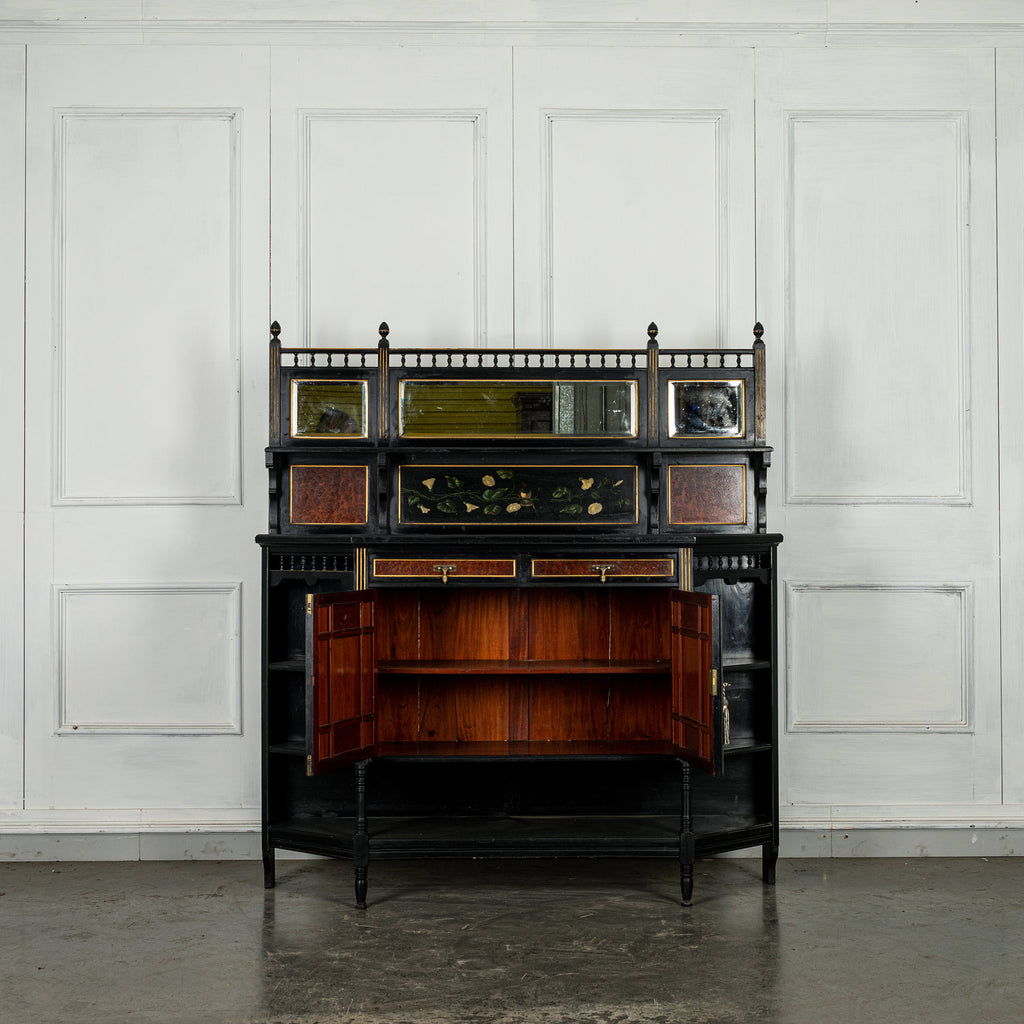 Victorian ebonised amboyna gilded and painted aesthetic movement side cabinet, the mirrored shelf has a panel below painted with a convolvulus type white flower. Below the cabinet gallery are two drawers with brass handles and a pair of panelled doors below painted with a bird on each door enclosing a shelved cupboard and flanked by open shelves above an undertier on turned legs.