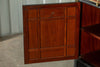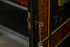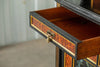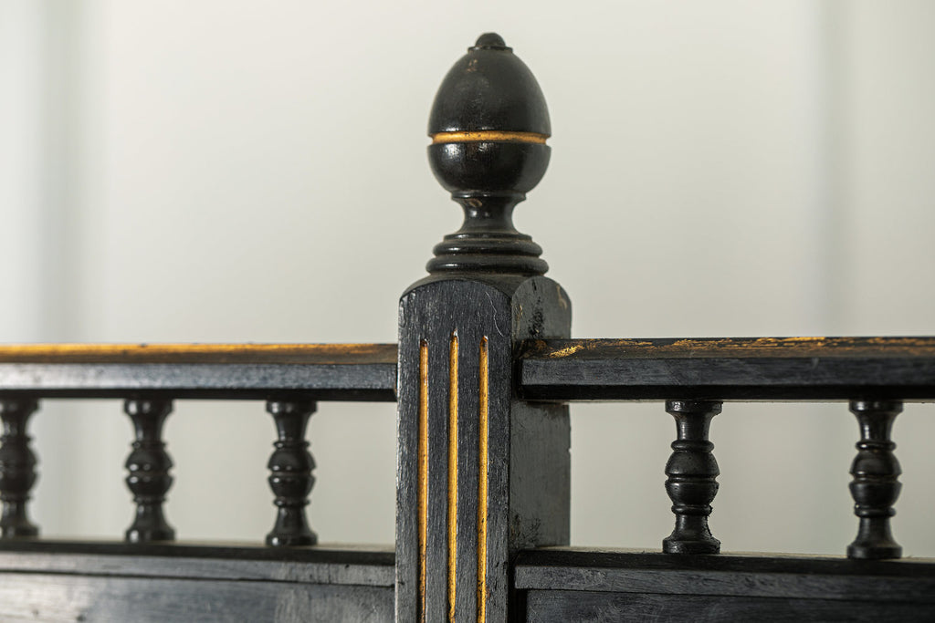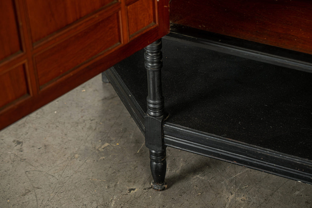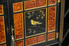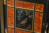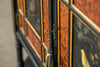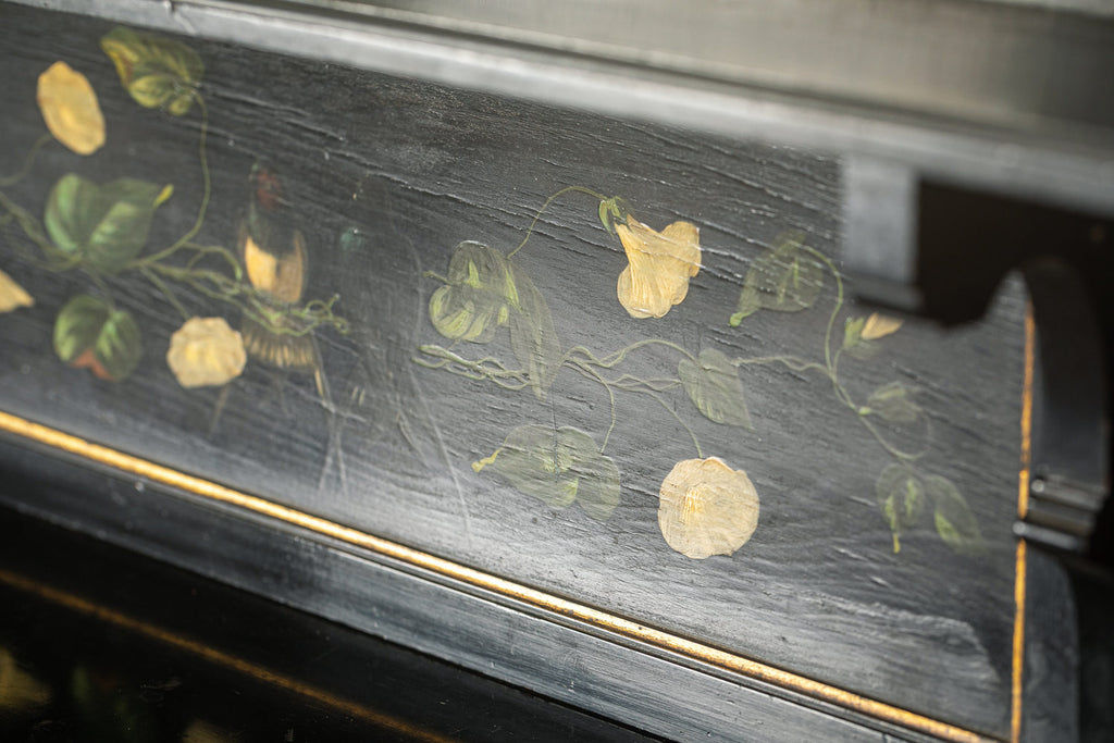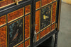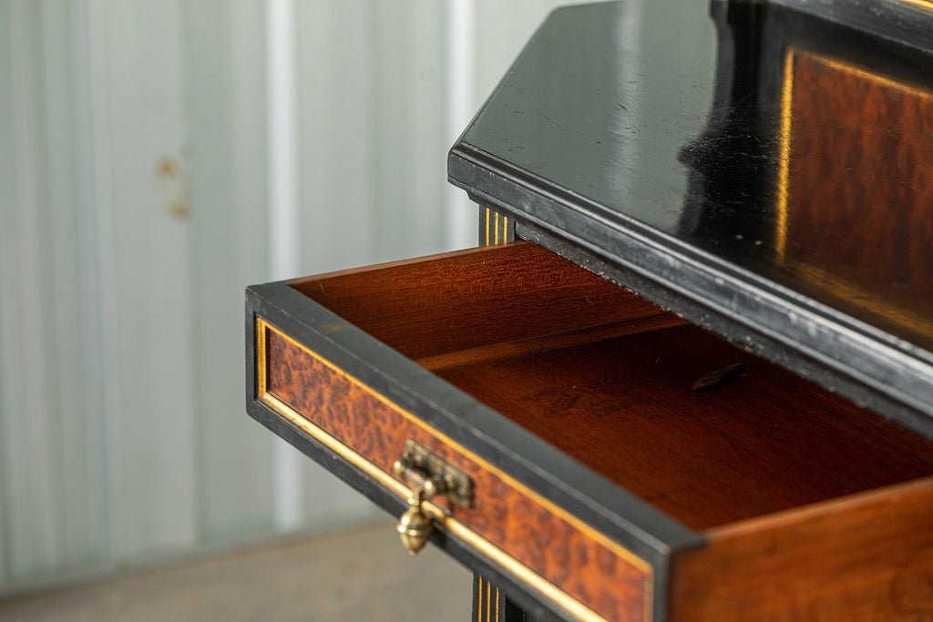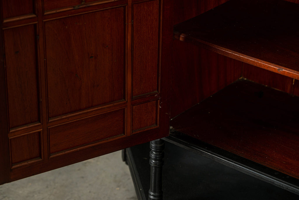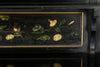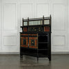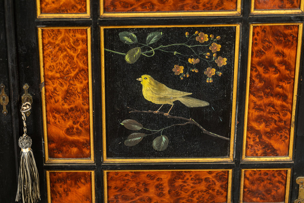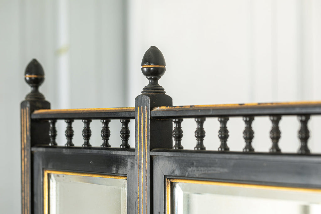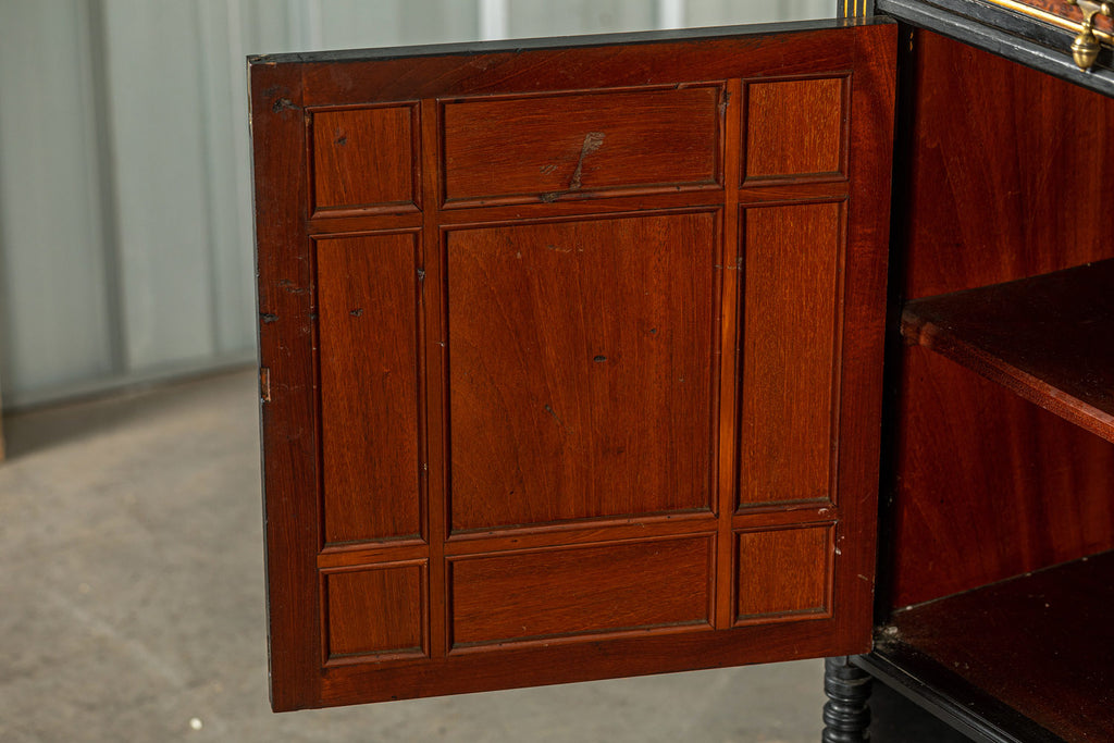 Victorian ebonised amboyna gilded and painted aesthetic movement side cabinet, the mirrored shelf has a panel below painted with a convolvulus type white flower. Below the cabinet gallery are two drawers with brass handles and a pair of panelled doors below painted with a bird on each door enclosing a shelved cupboard and flanked by open shelves above an undertier on turned legs.