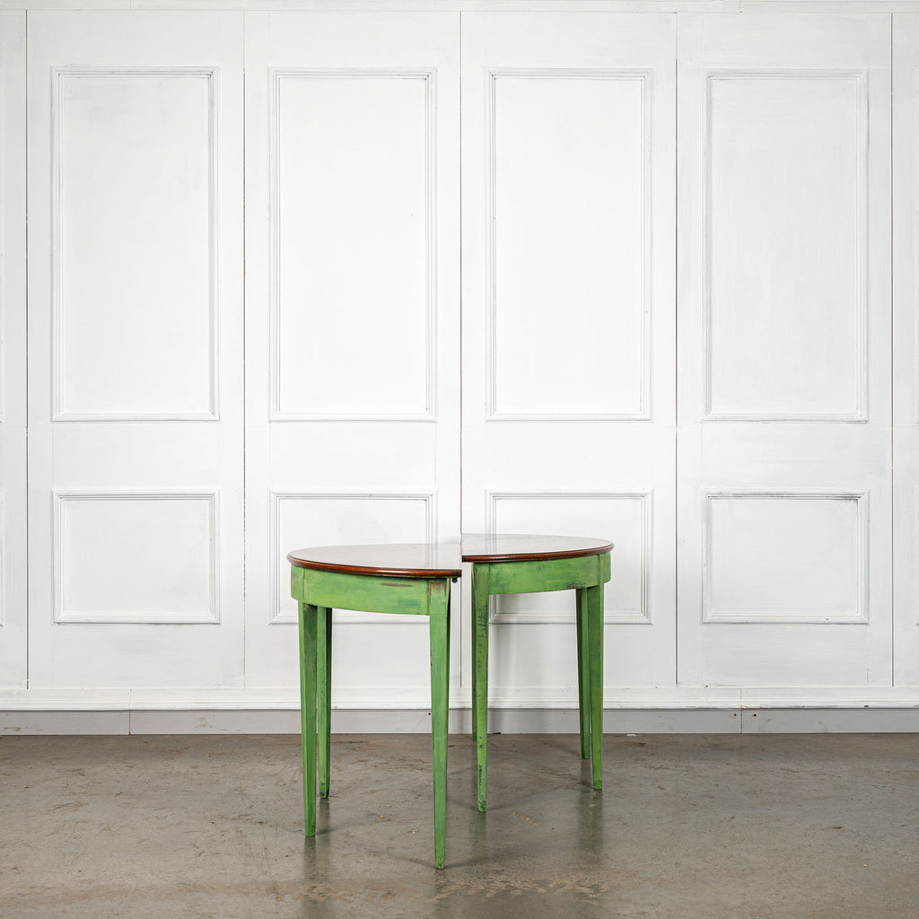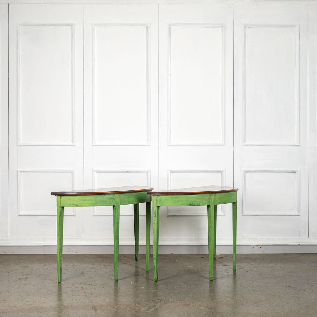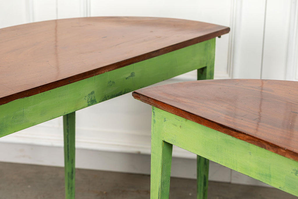 Pair of 19th century mahogany demi-lune side tables with thumb moulded mahogany tops and painted bases with elegant tapering square legs. A beautiful addition to any room. The table also fir together to forma dining or centre table.