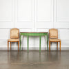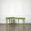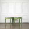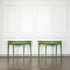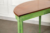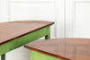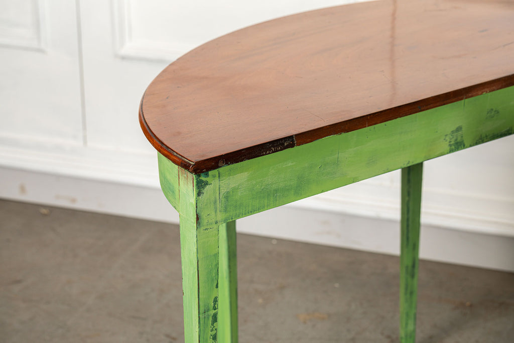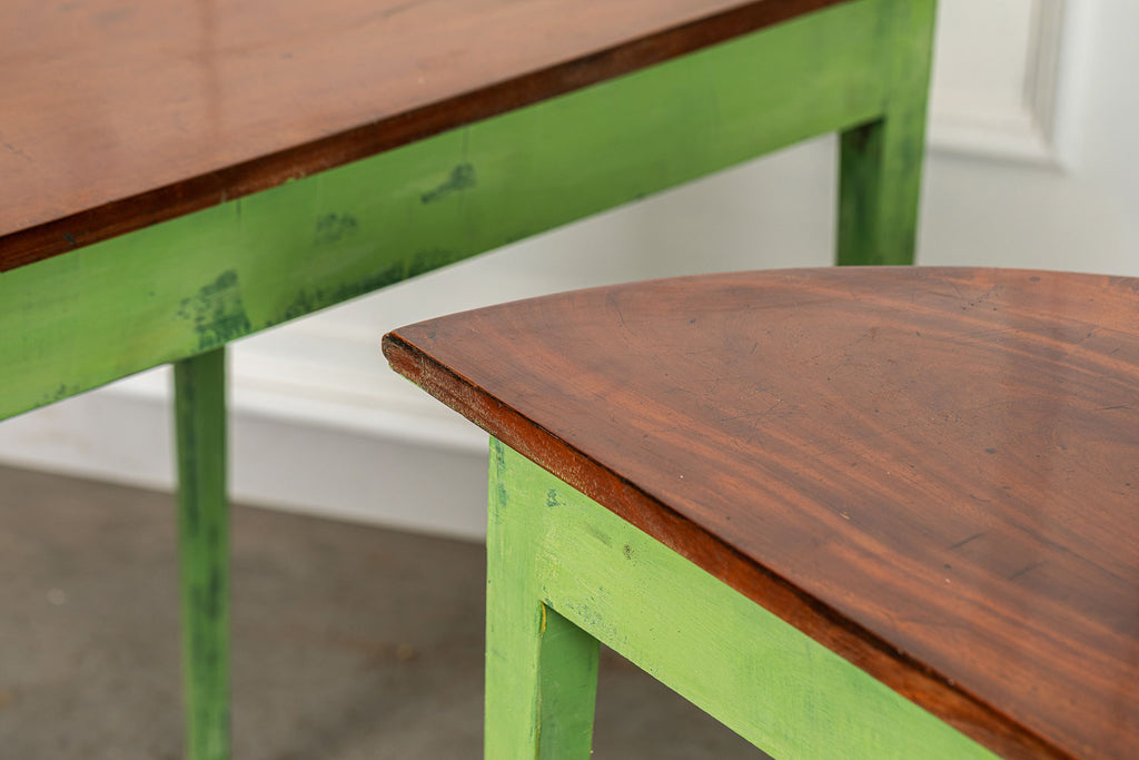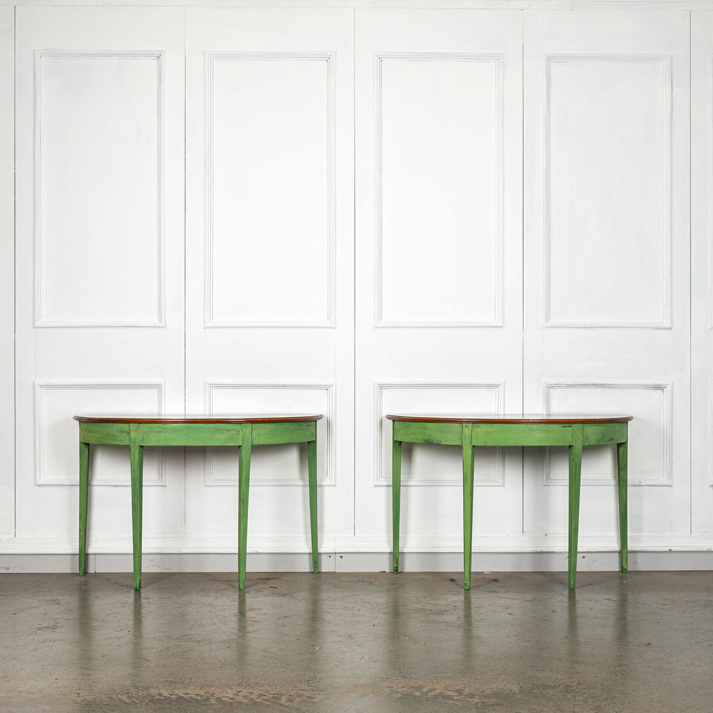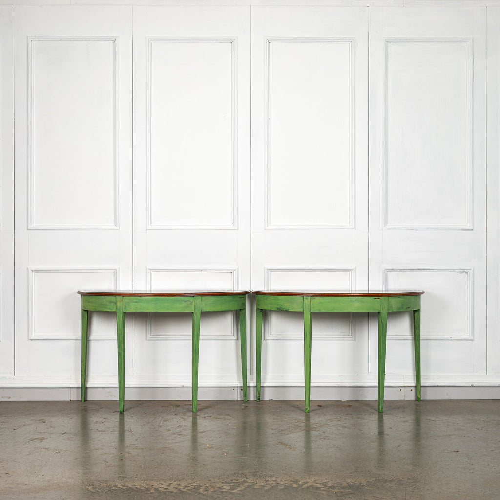 Pair of 19th century mahogany demi-lune side tables with thumb moulded mahogany tops and painted bases with elegant tapering square legs. A beautiful addition to any room. The table also fir together to forma dining or centre table.