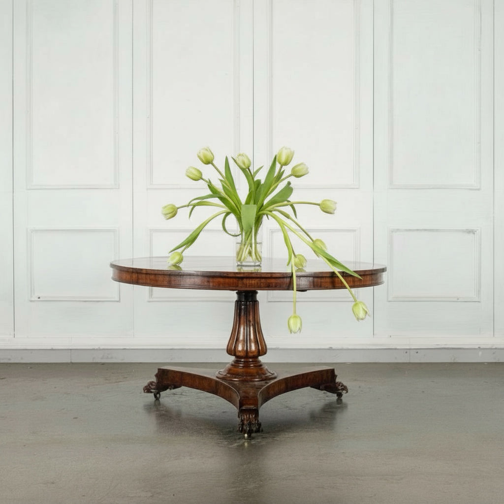 Wonderful William 1V rosewood tilt top breakfast table centre table circa 1830 with stunning grain to the top above shallow frieze raised on vase shaped fluted column terminating in a trefoil base and finely carved lion paw feet. This table will sit six comfortably and is of a firm stable structure.