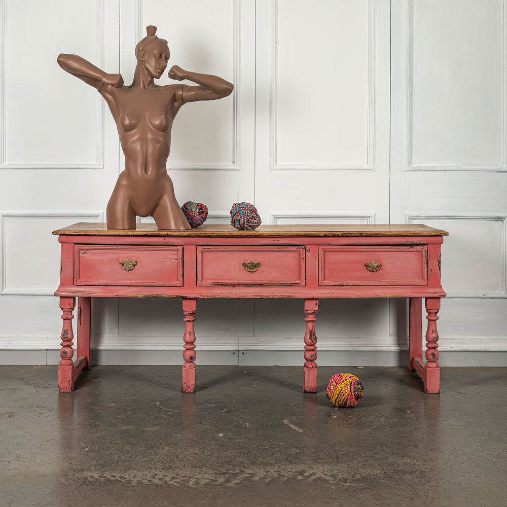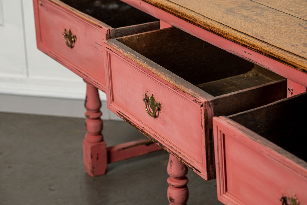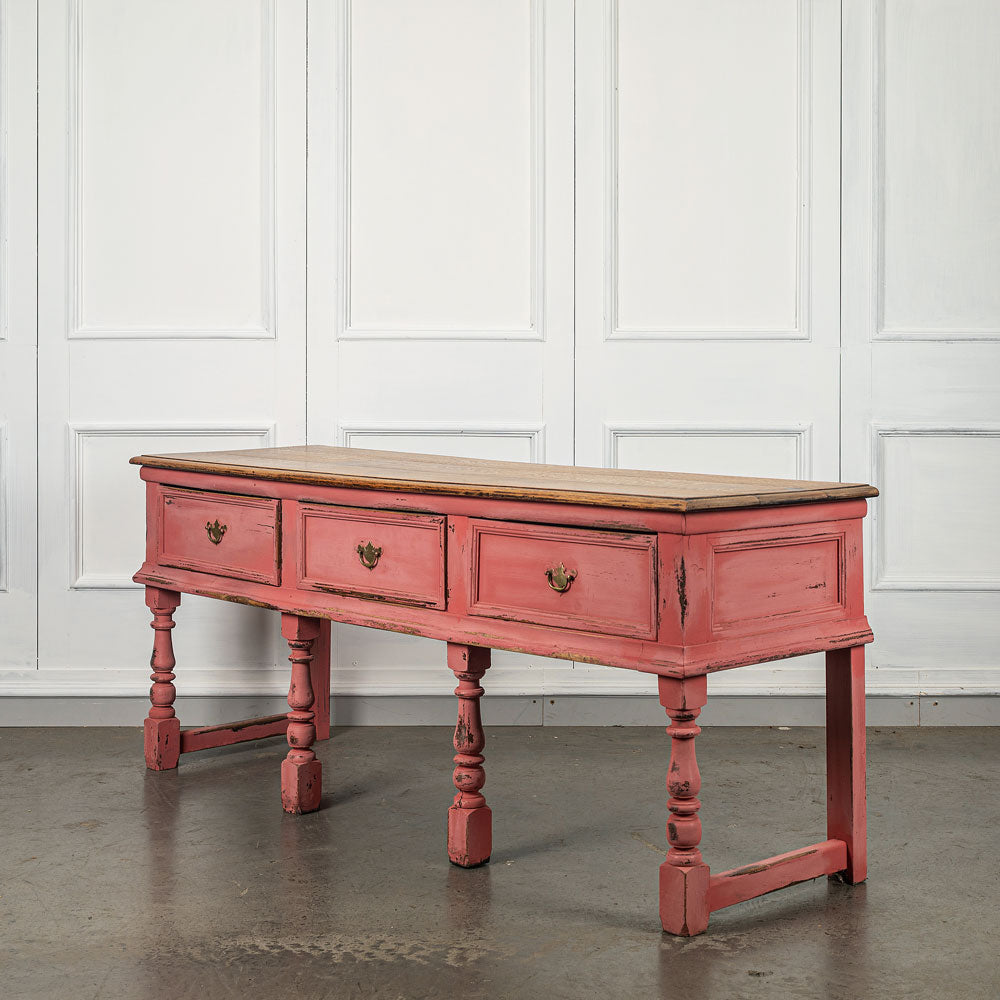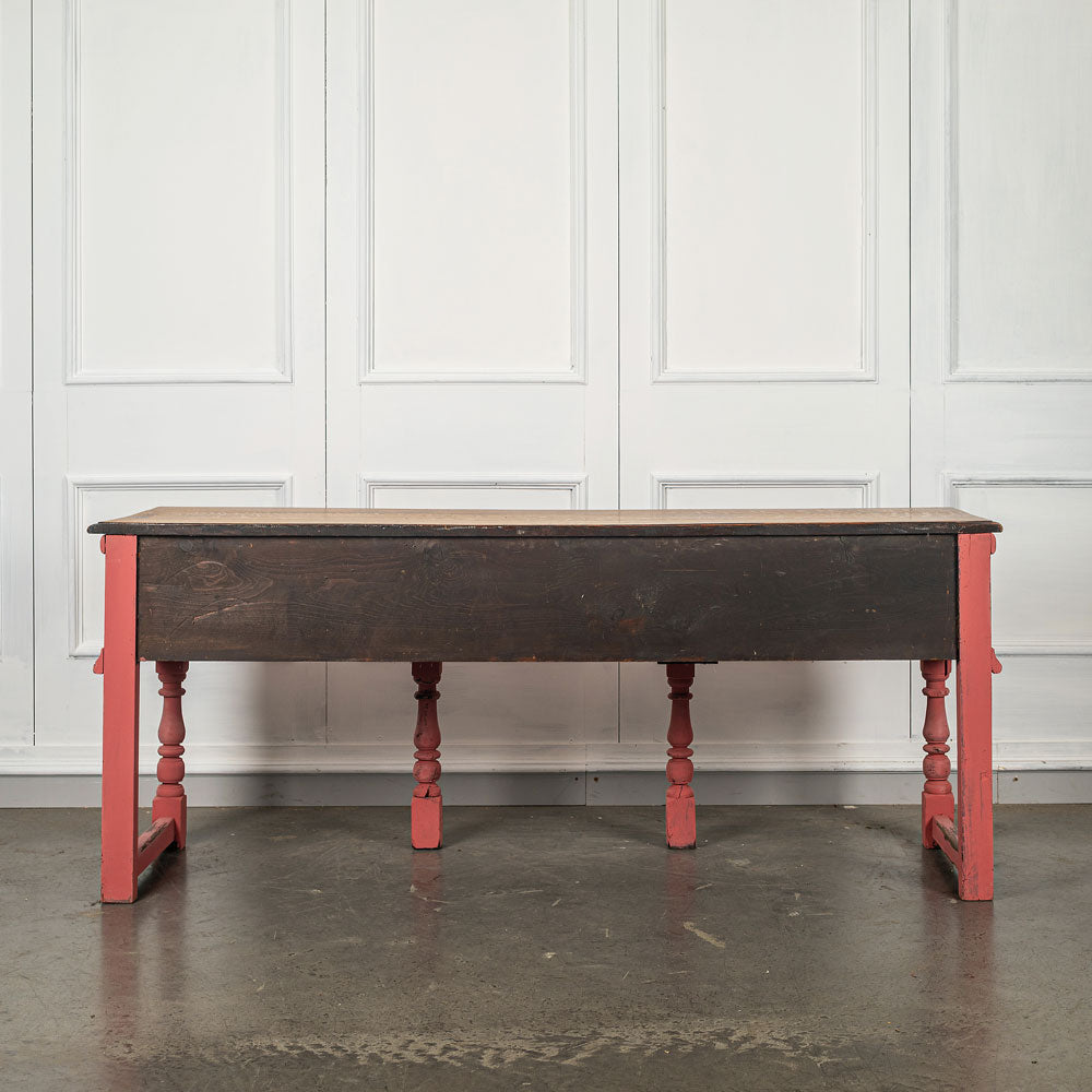 An 18th / 19th Century oak painted dresser base with three frieze drawers on turned legs. A well proportioned and strong piece of furniture offering a great work surface, manageable drawers and a beautiful presence. Good to look at, good to live with.