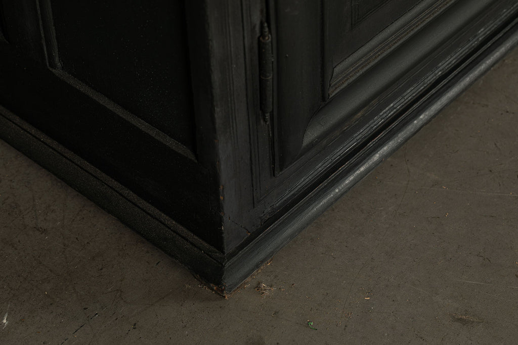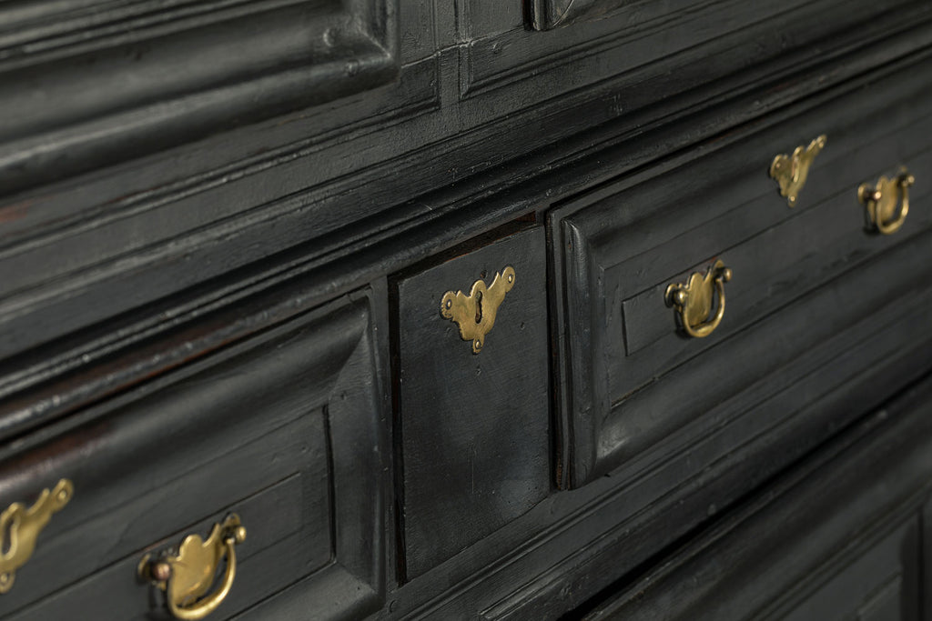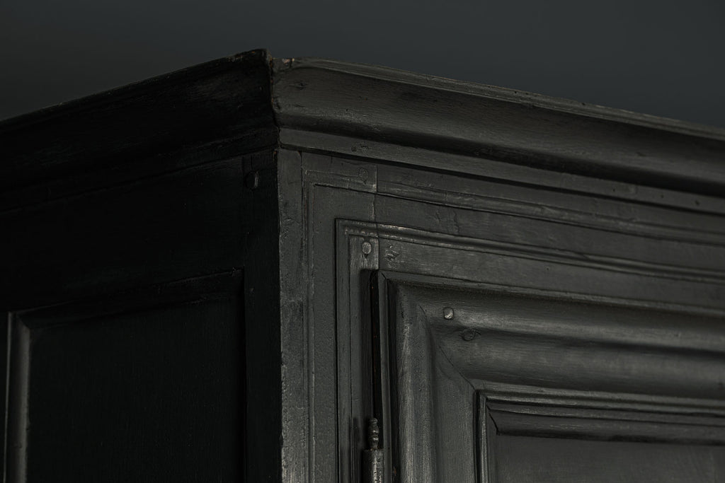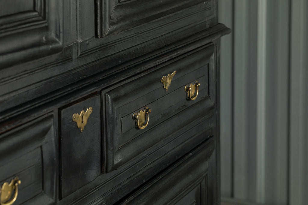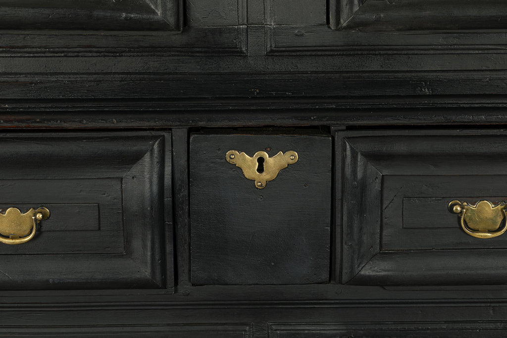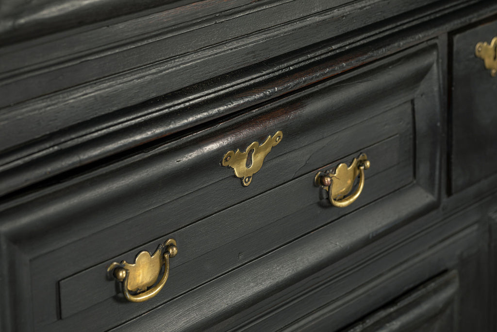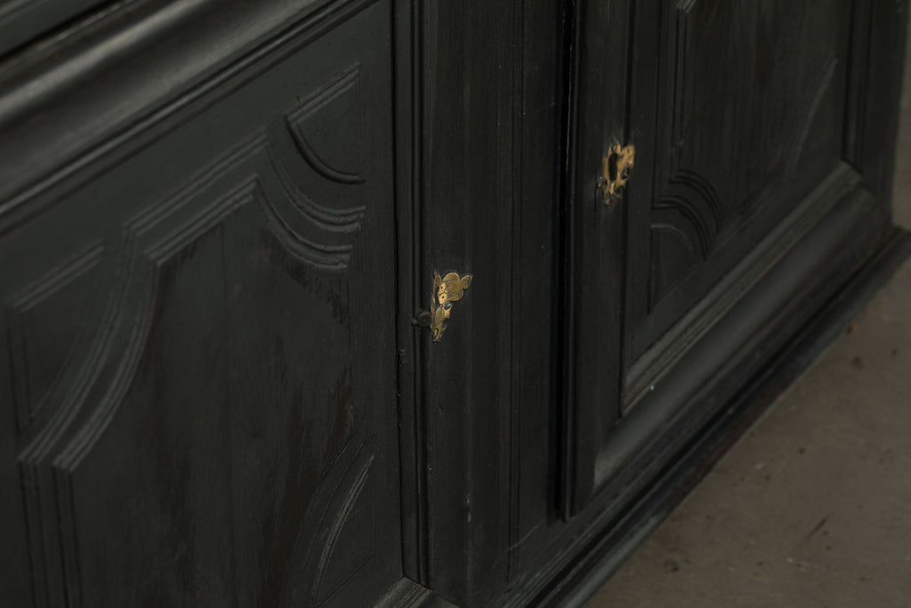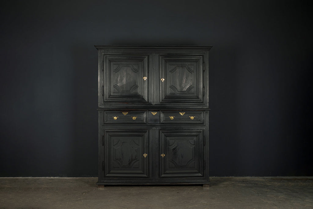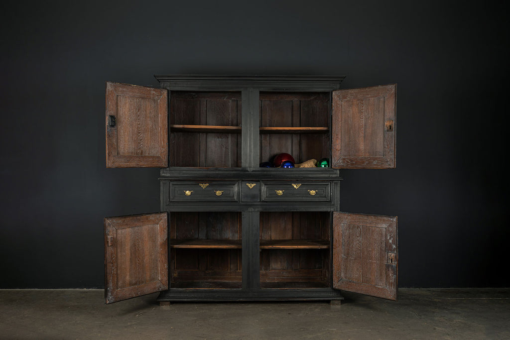 A substantial 18th Century continental ebonised oak house keeper’s cupboard enclosed by two pairs of panelled doors and three frieze drawers, with moulded outline, steel hinges, and brass handles and escutcheons. Drawers and cupboards with working locks and keys. In wonderful structural condition and the well proportioned deep original pine shelves offer a very accessible storage arrangement and the safest place to keep your witches balls. Comes in two parts for ease of transportation.