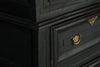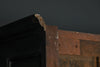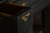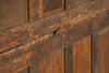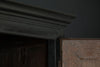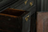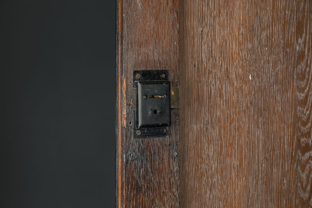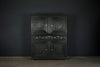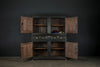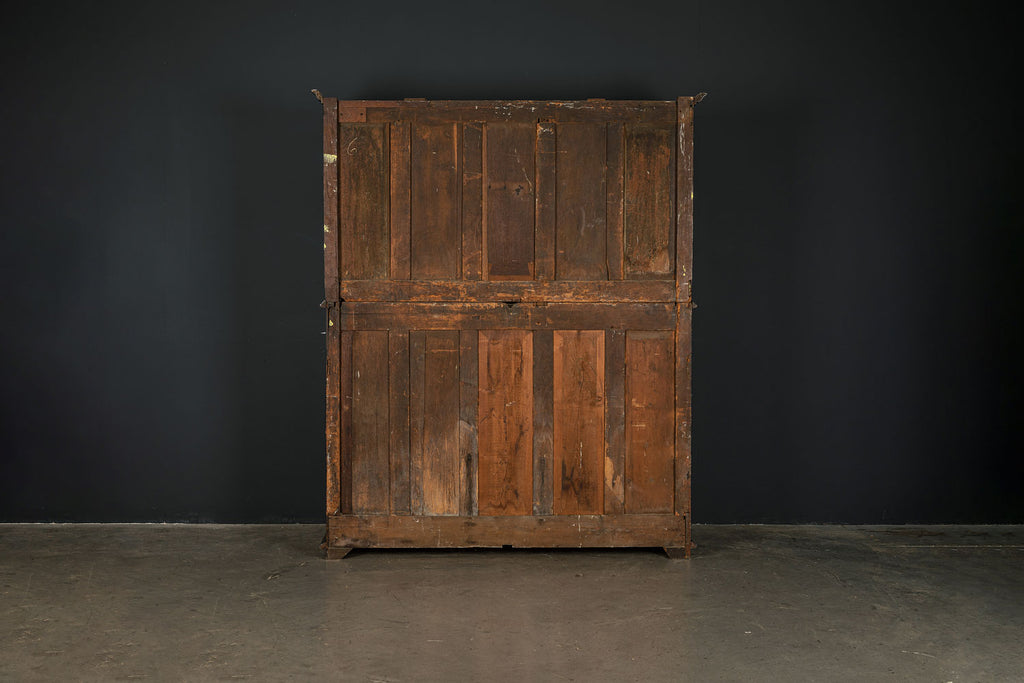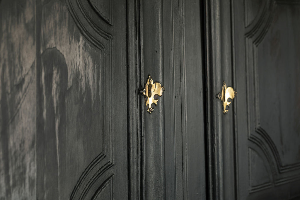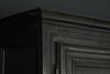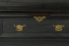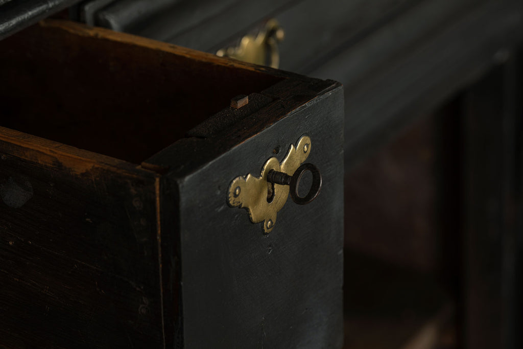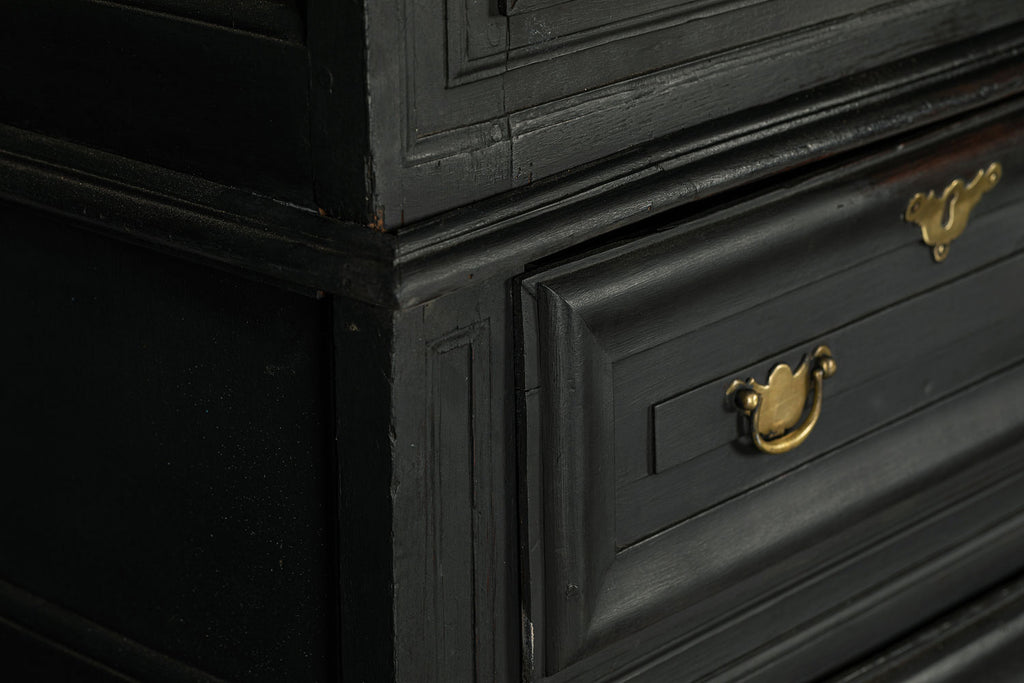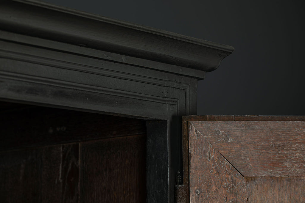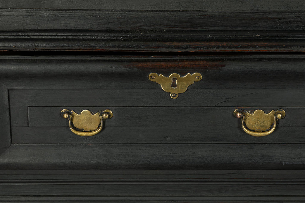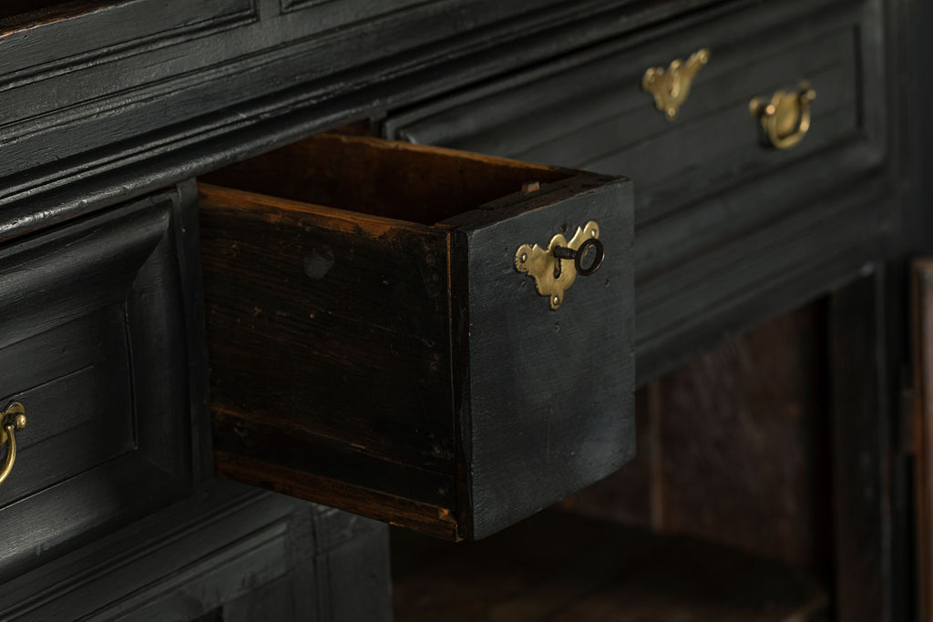 A substantial 18th Century continental ebonised oak house keeper’s cupboard enclosed by two pairs of panelled doors and three frieze drawers, with moulded outline, steel hinges, and brass handles and escutcheons. Drawers and cupboards with working locks and keys. In wonderful structural condition and the well proportioned deep original pine shelves offer a very accessible storage arrangement and the safest place to keep your witches balls. Comes in two parts for ease of transportation.