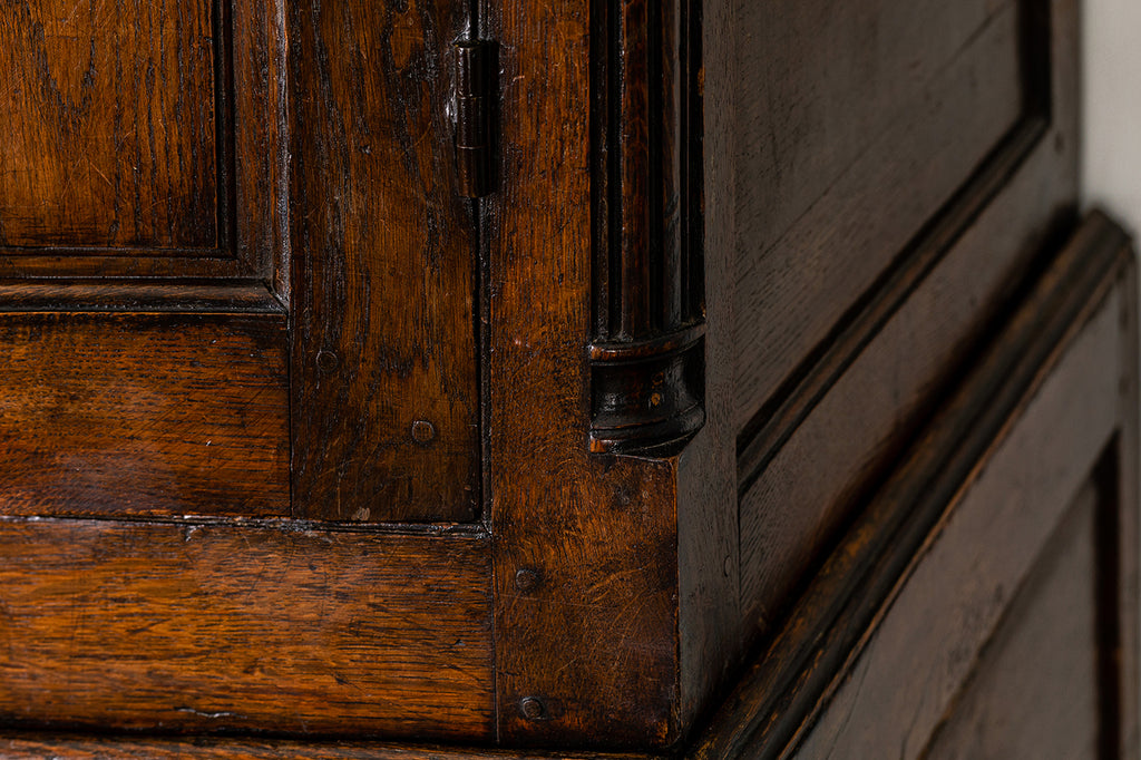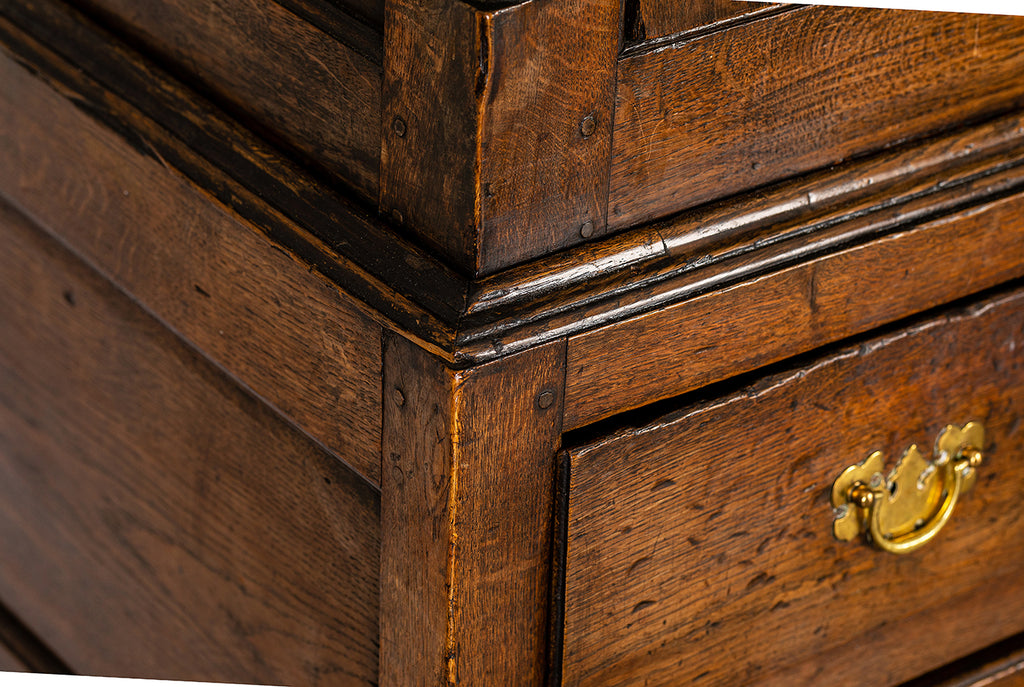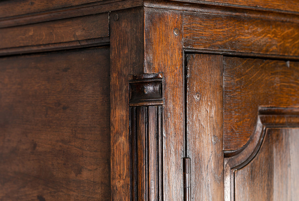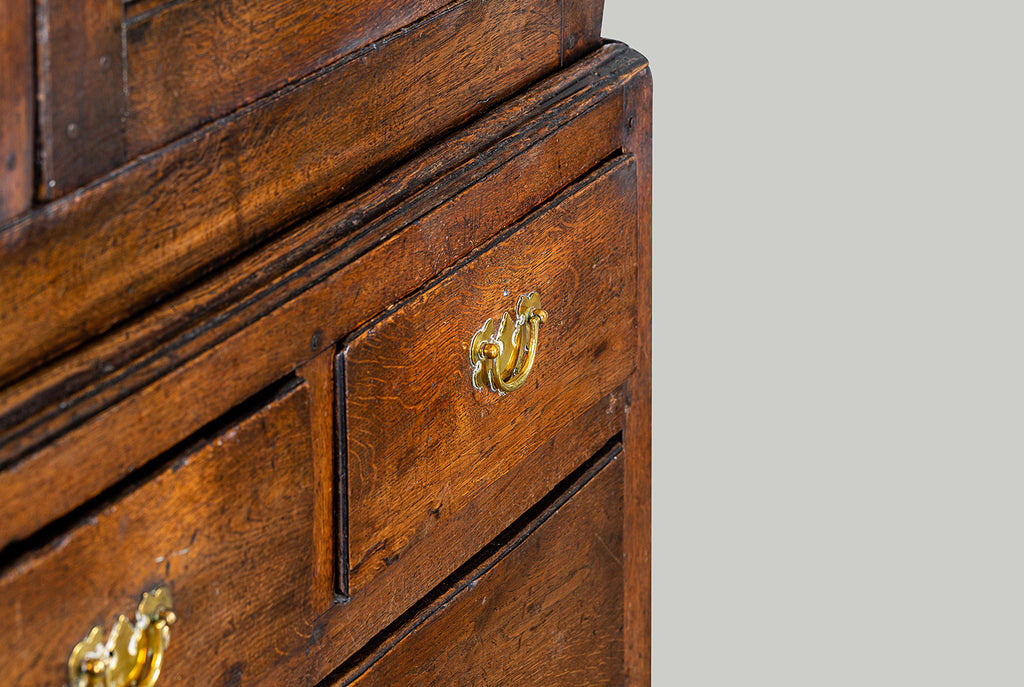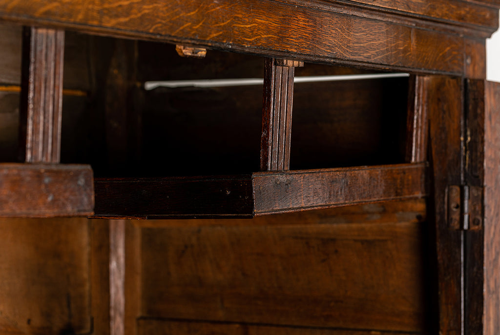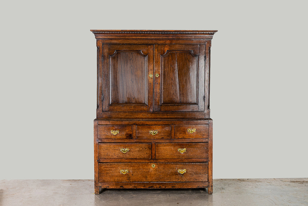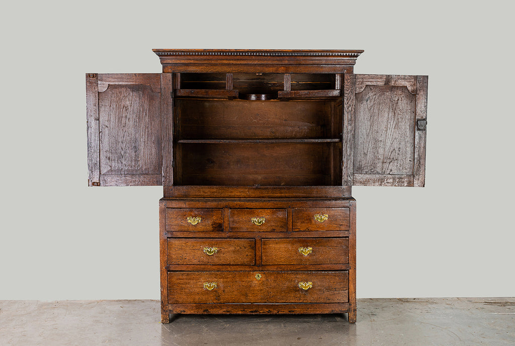 18th Welsh oak linen press cupboard. With moulded cornice above a pair of panelled cupboard doors. The base with three drawers over one long drawer on stile feet. Another excellent example of Welsh Oak.