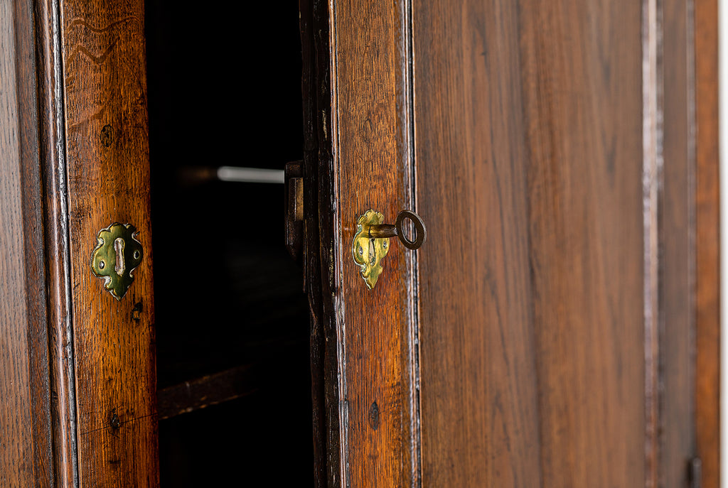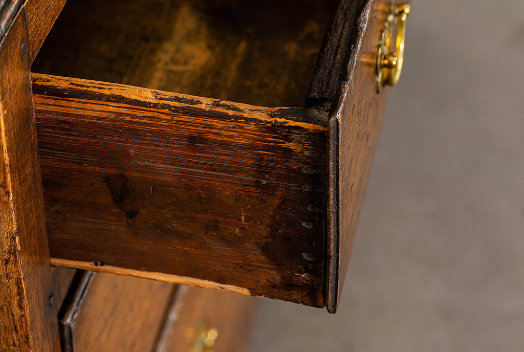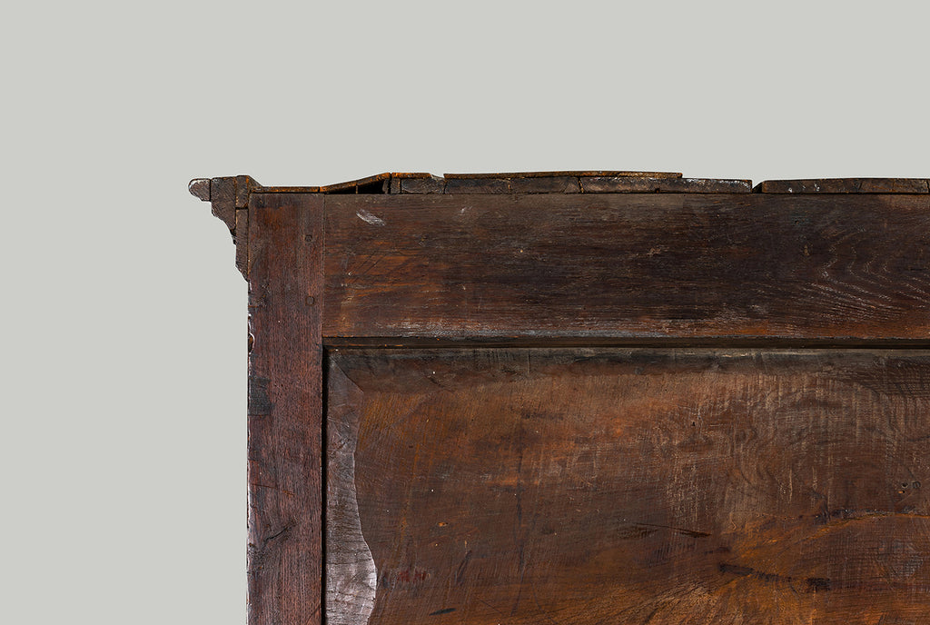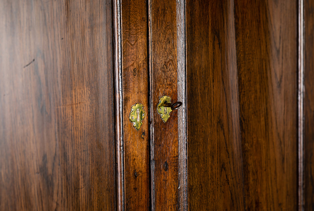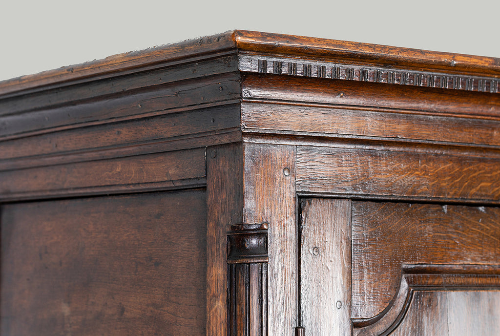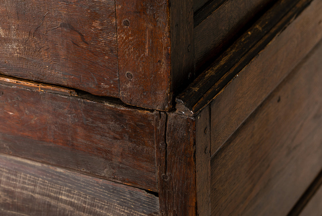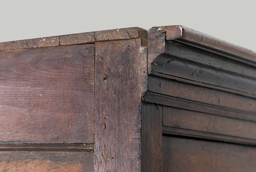 18th Welsh oak linen press cupboard. With moulded cornice above a pair of panelled cupboard doors. The base with three drawers over one long drawer on stile feet. Another excellent example of Welsh Oak.