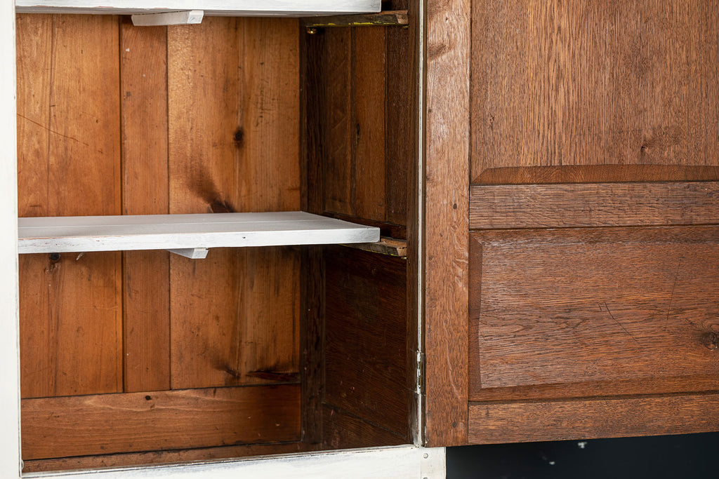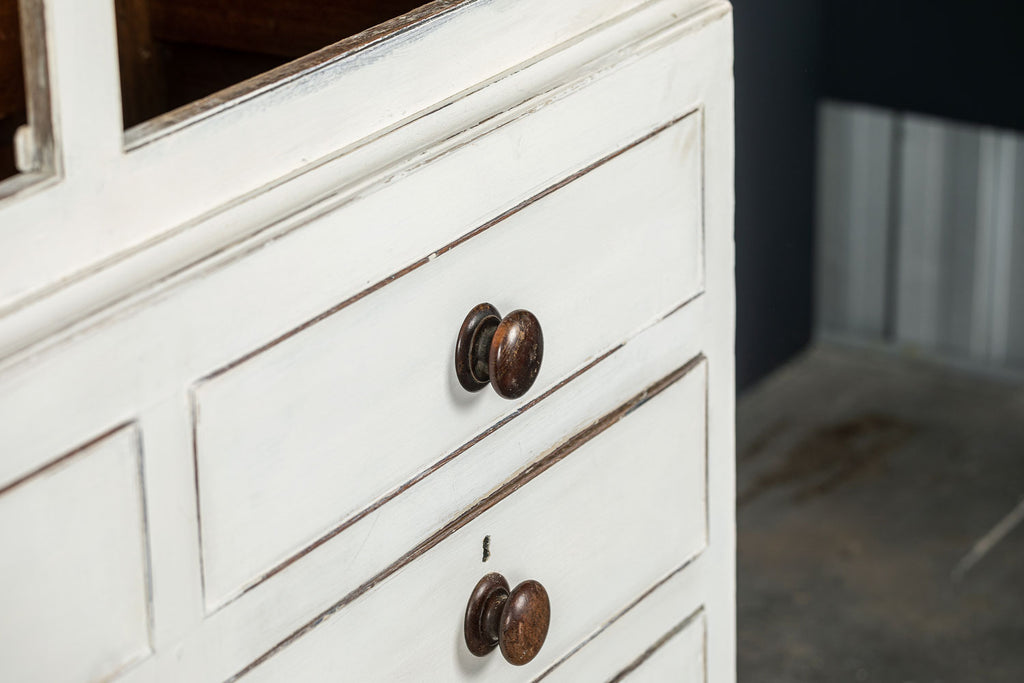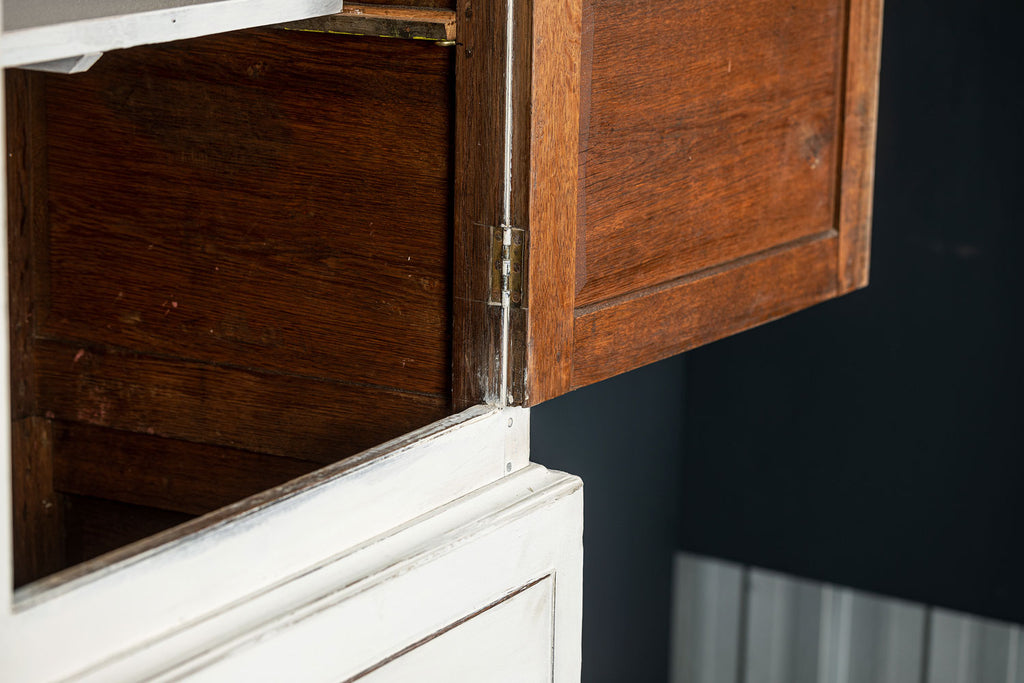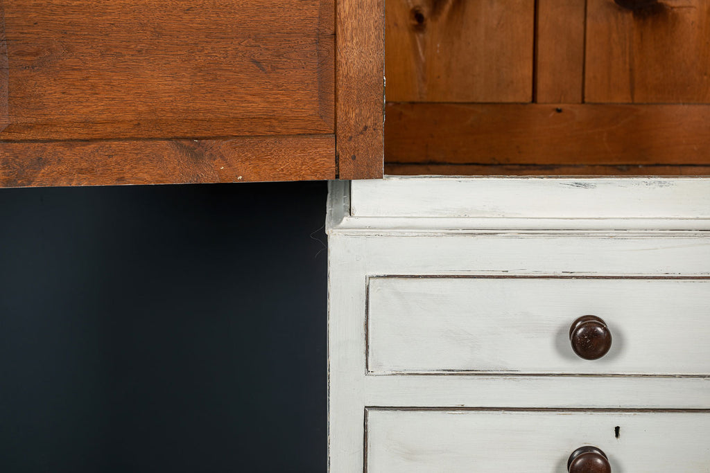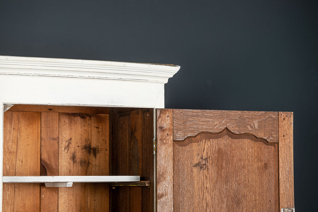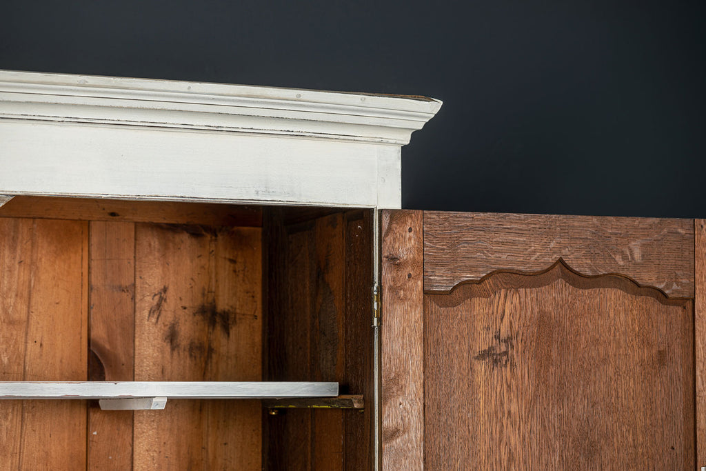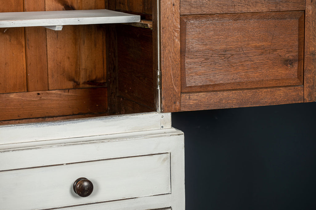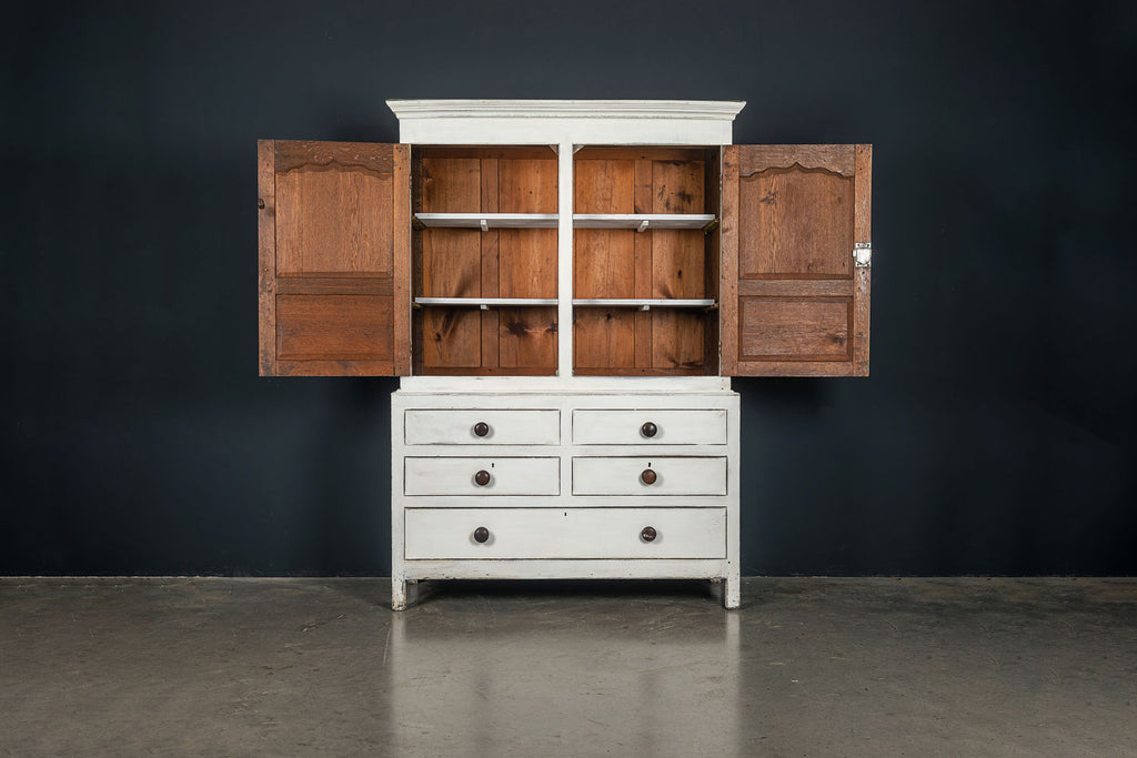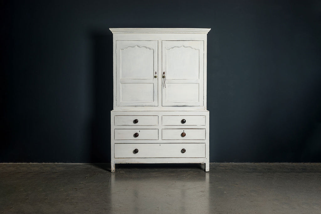 An 18th Century painted Welsh oak linen press or house keepers cupboard. With recent addition of oak shelves (removable) and with original hooks present for hanging space. Two blind drawers and two long drawers below. A classic kitchen cupboard in a beautifiul chalky white finish with contrasting wooden knobs. A great kitchen piece that will even store your Henry and till look beautiful in a traditional or contemporary setting.