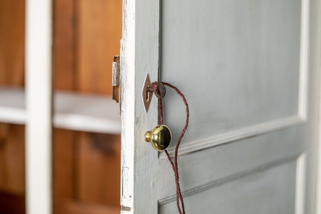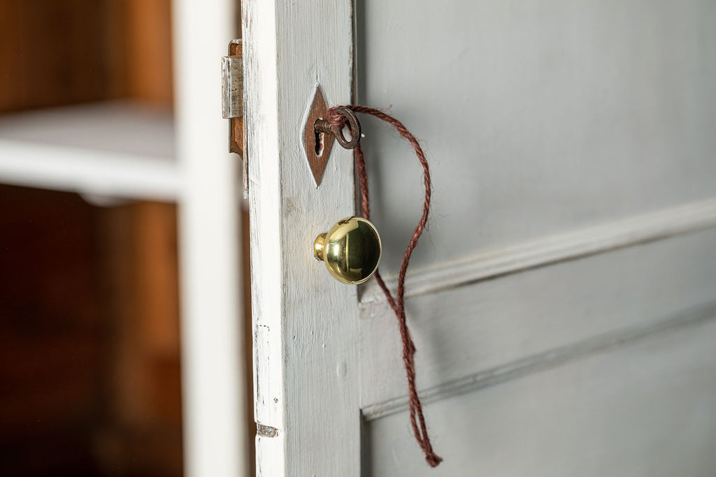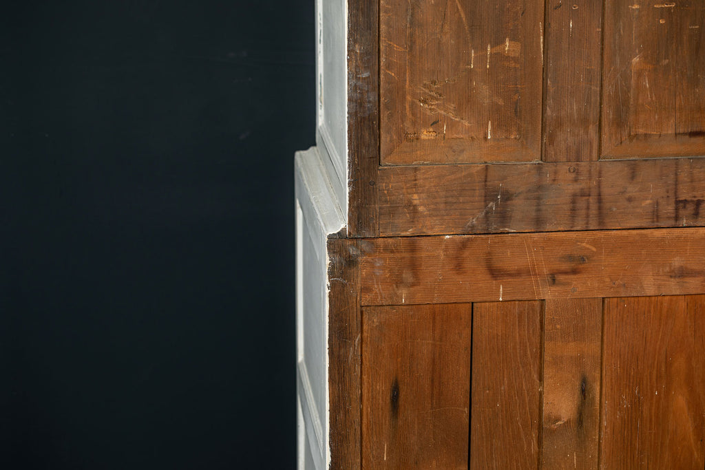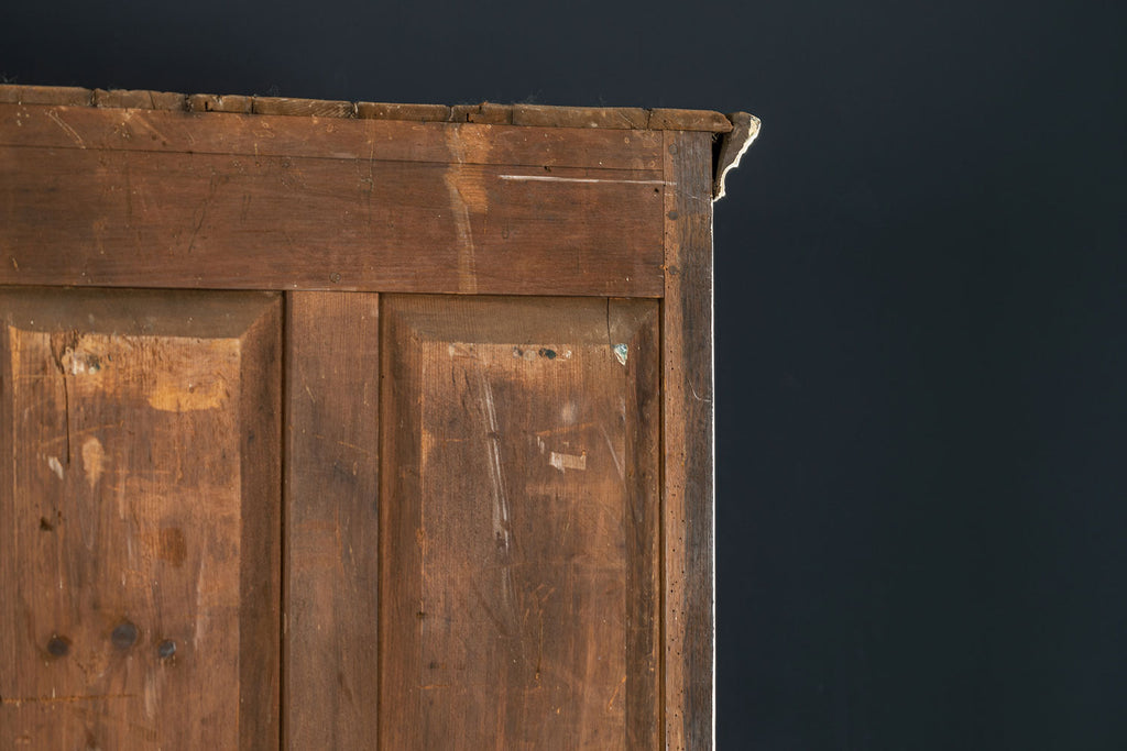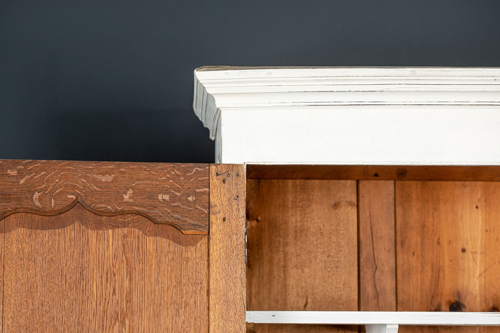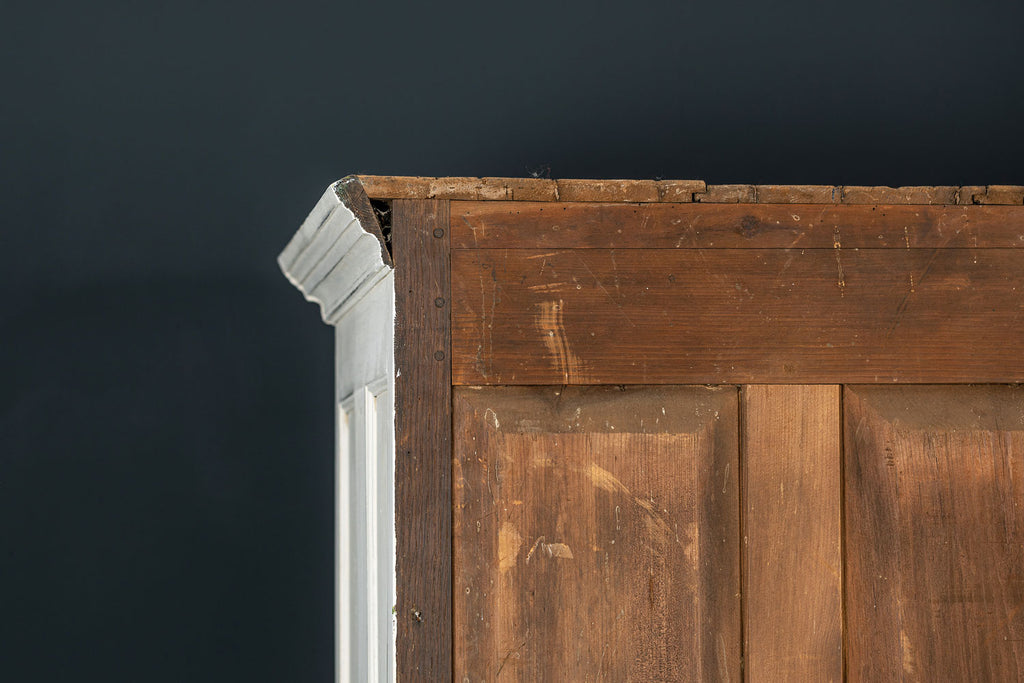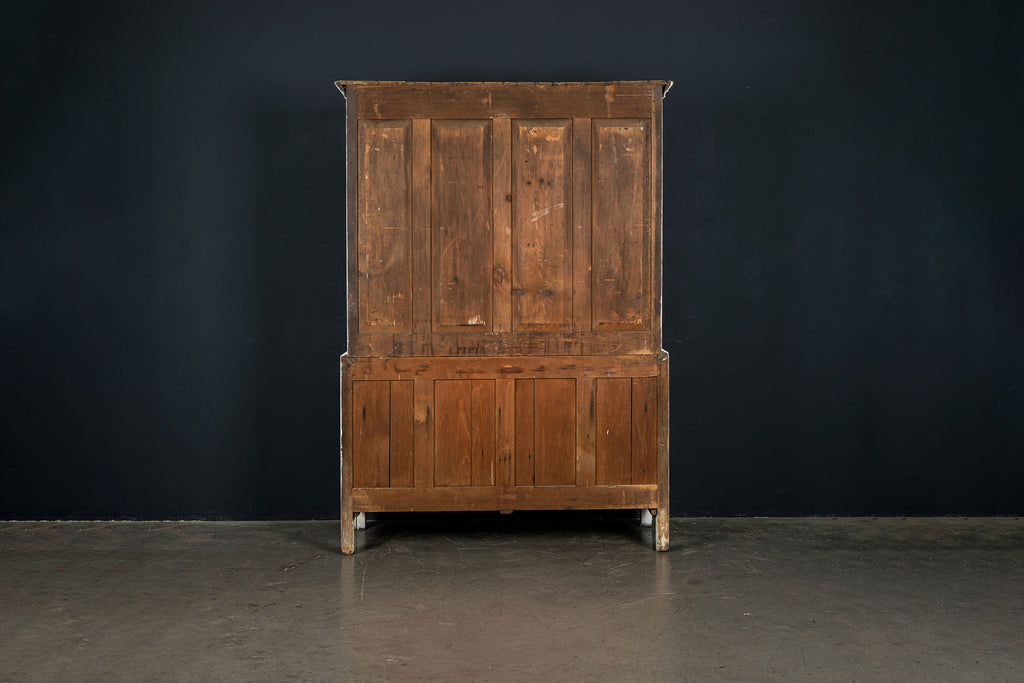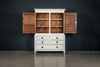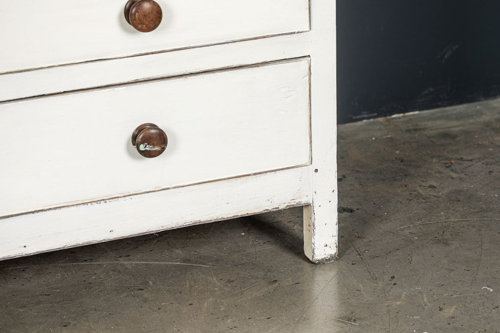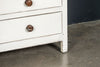 An 18th Century painted Welsh oak linen press or house keepers cupboard. With recent addition of oak shelves (removable) and with original hooks present for hanging space. Two blind drawers and two long drawers below. A classic kitchen cupboard in a beautifiul chalky white finish with contrasting wooden knobs. A great kitchen piece that will even store your Henry and till look beautiful in a traditional or contemporary setting.