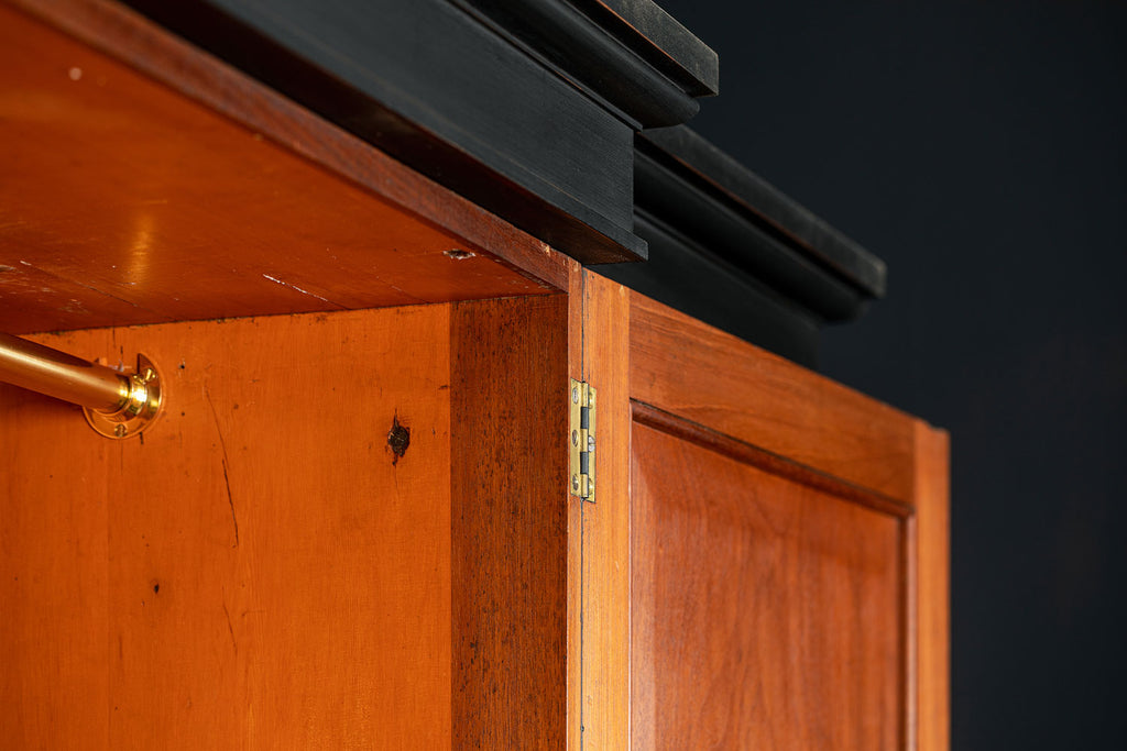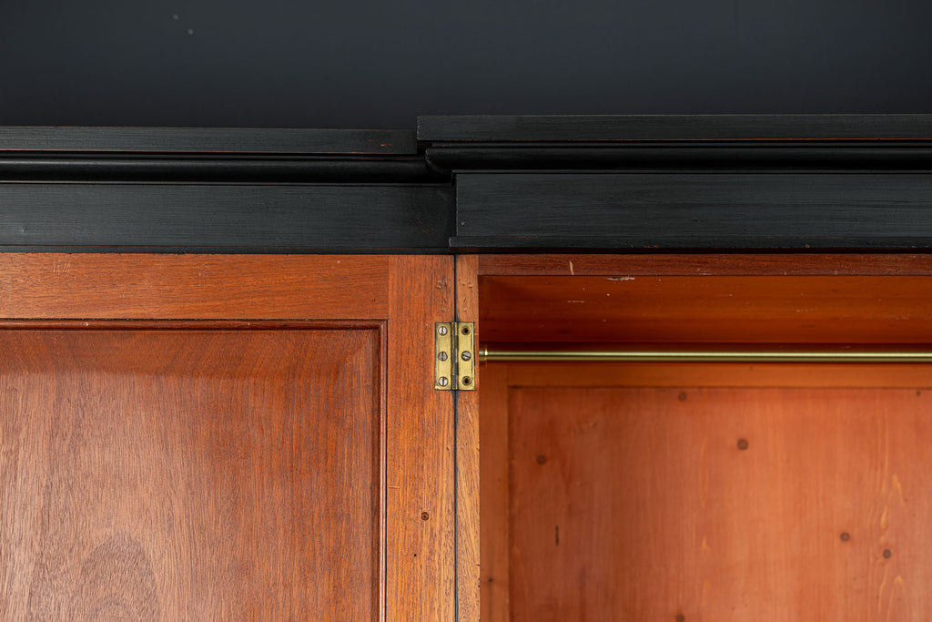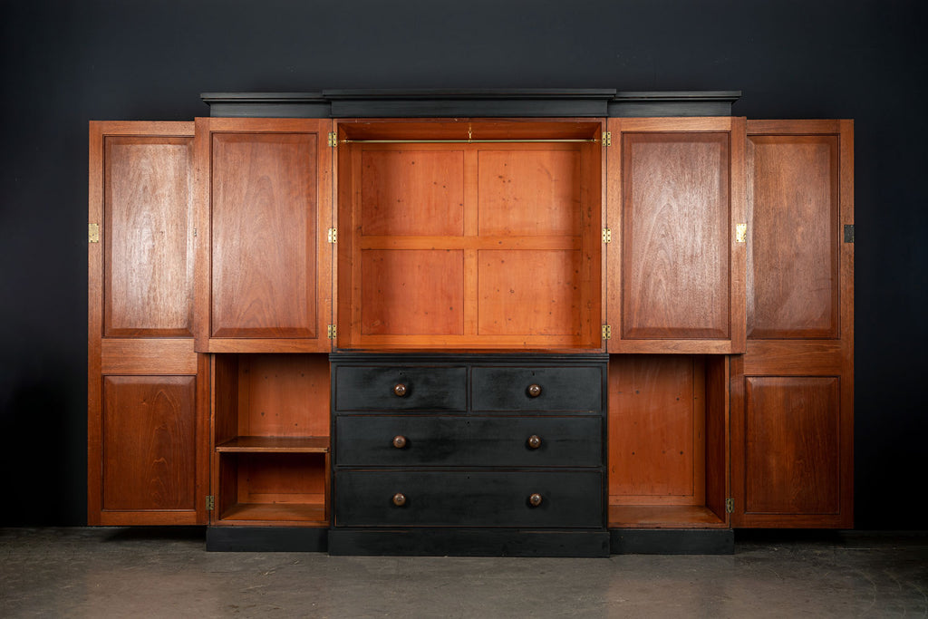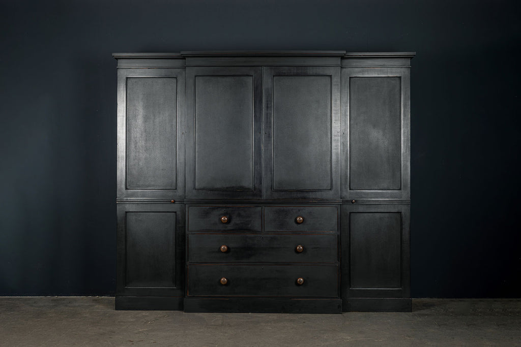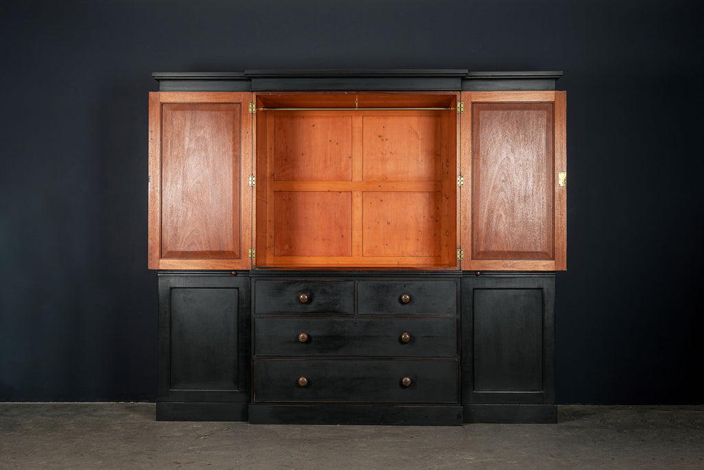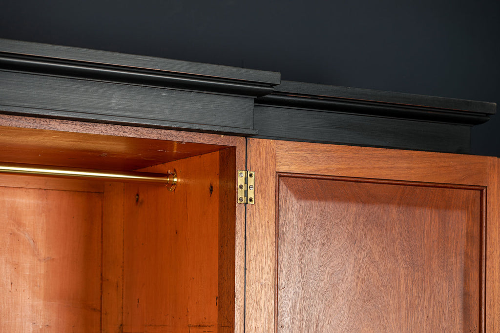 19th Century ebonised mahogany break front compact wardrobe. In four parts.the central section with hanging space above two short and two long drawers with original mahogany knobs. The two outer sections reveal fully length hanging spaces. A stunning piece of furniture in fabulous condition with original keys, locks and latches.