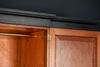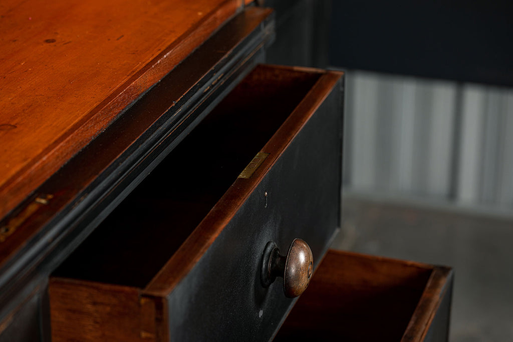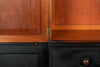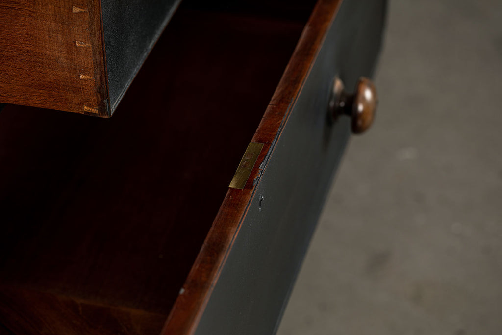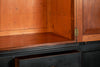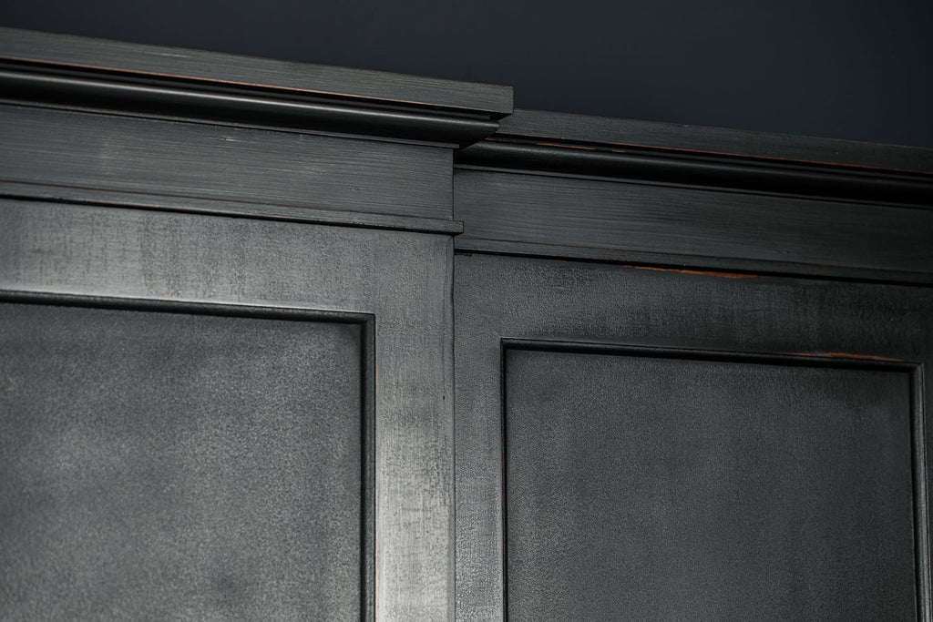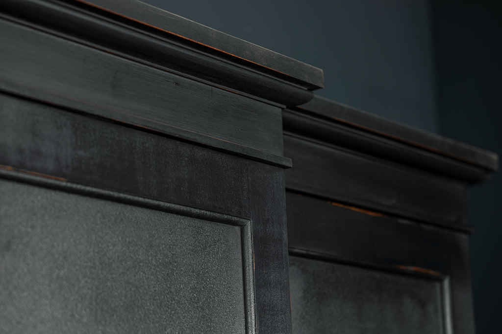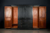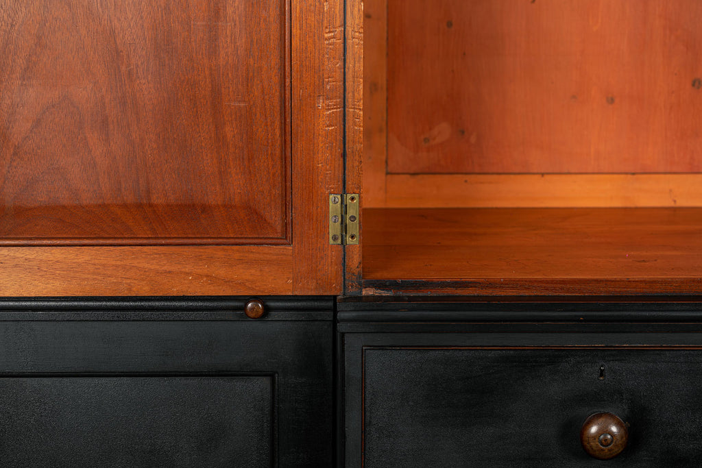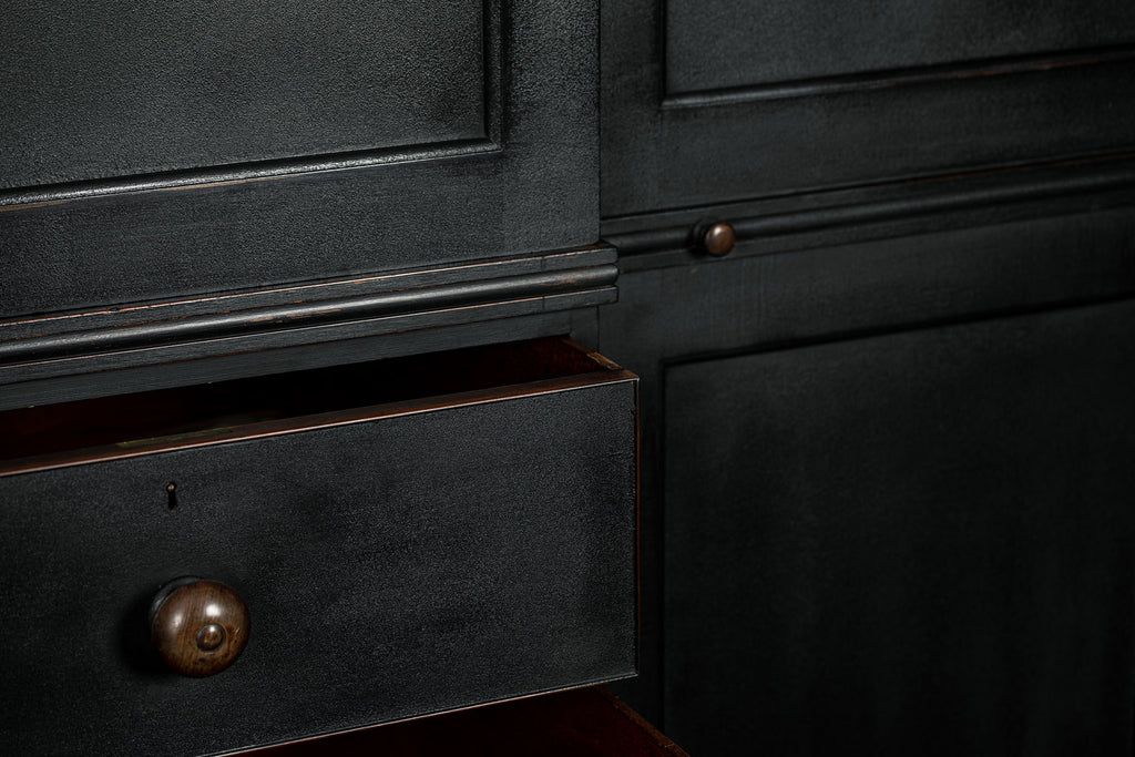 19th Century ebonised mahogany break front compact wardrobe. In four parts.the central section with hanging space above two short and two long drawers with original mahogany knobs. The two outer sections reveal fully length hanging spaces. A stunning piece of furniture in fabulous condition with original keys, locks and latches.