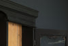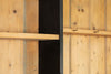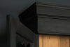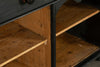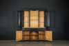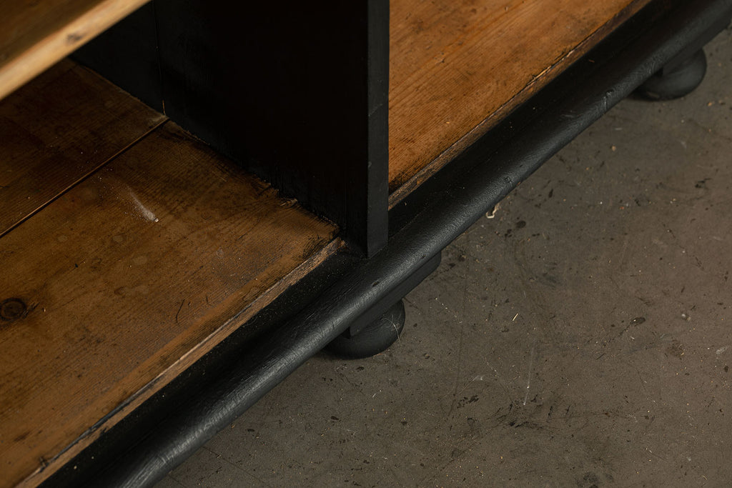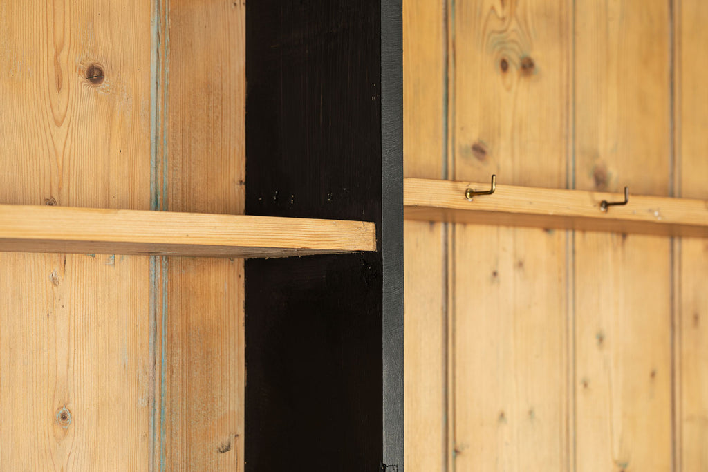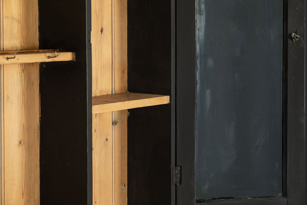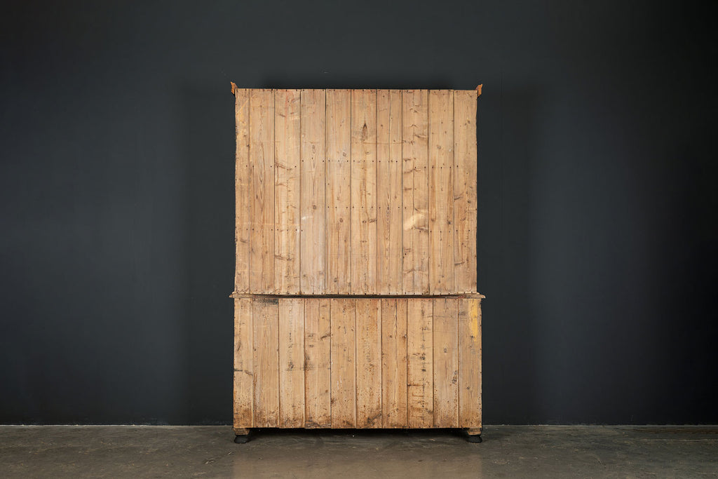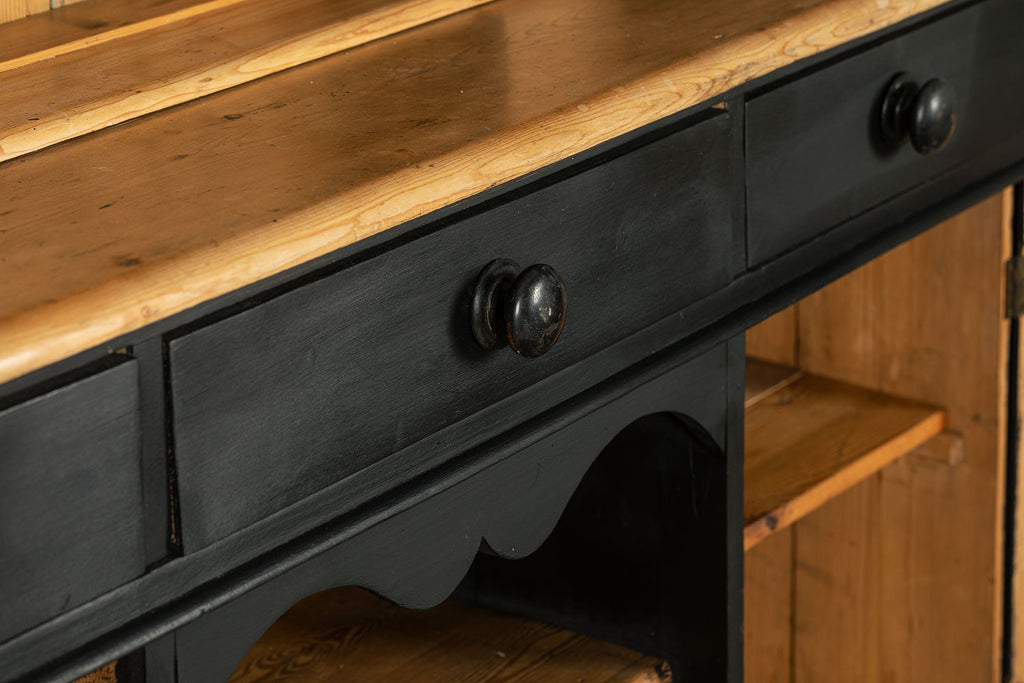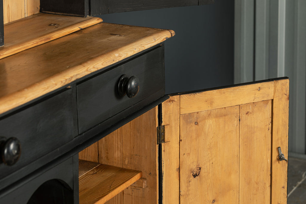 19th century ebonised Welsh dresser with shaped cornice above two glazed panelled doors and central recess. The base is fitted with three frieze drawers with wooden knobs and a pair of panelled doors below flanking a dog kennel space with single half shelf all on bun feet. A very good example of this style of furniture, which also may be used as a bookcase, display cabinet and storage. A good looking piece of furniture.