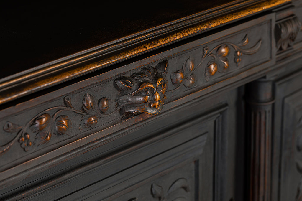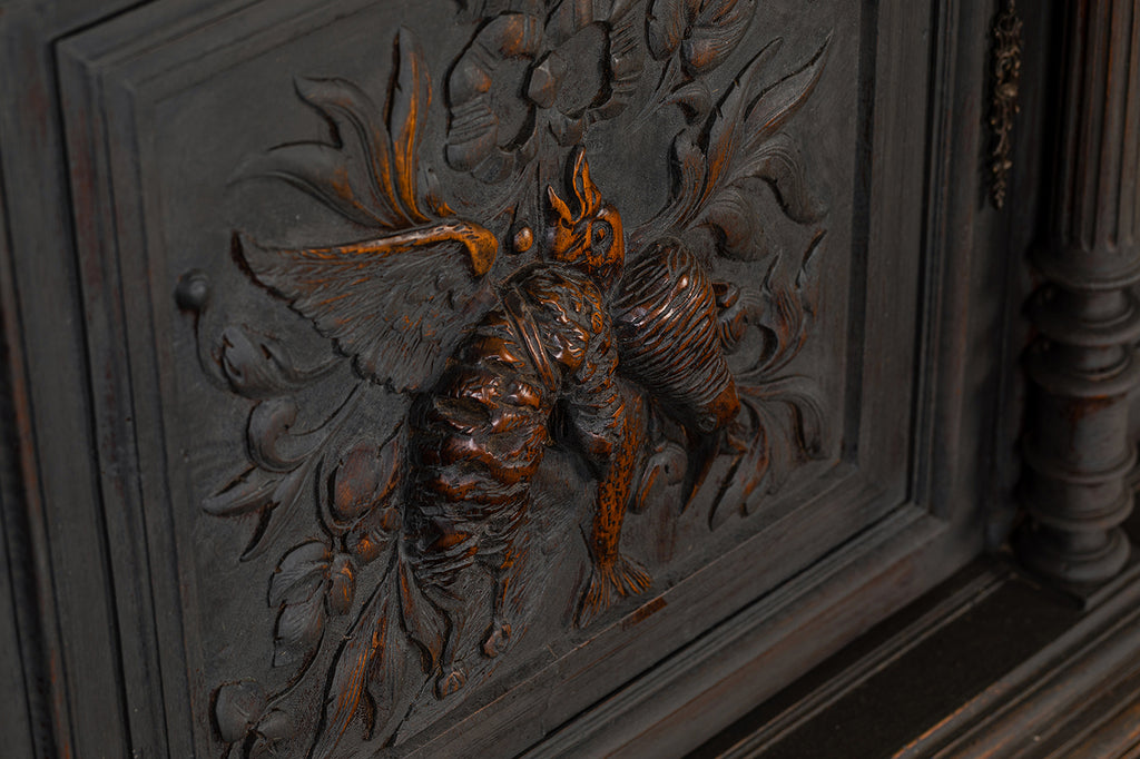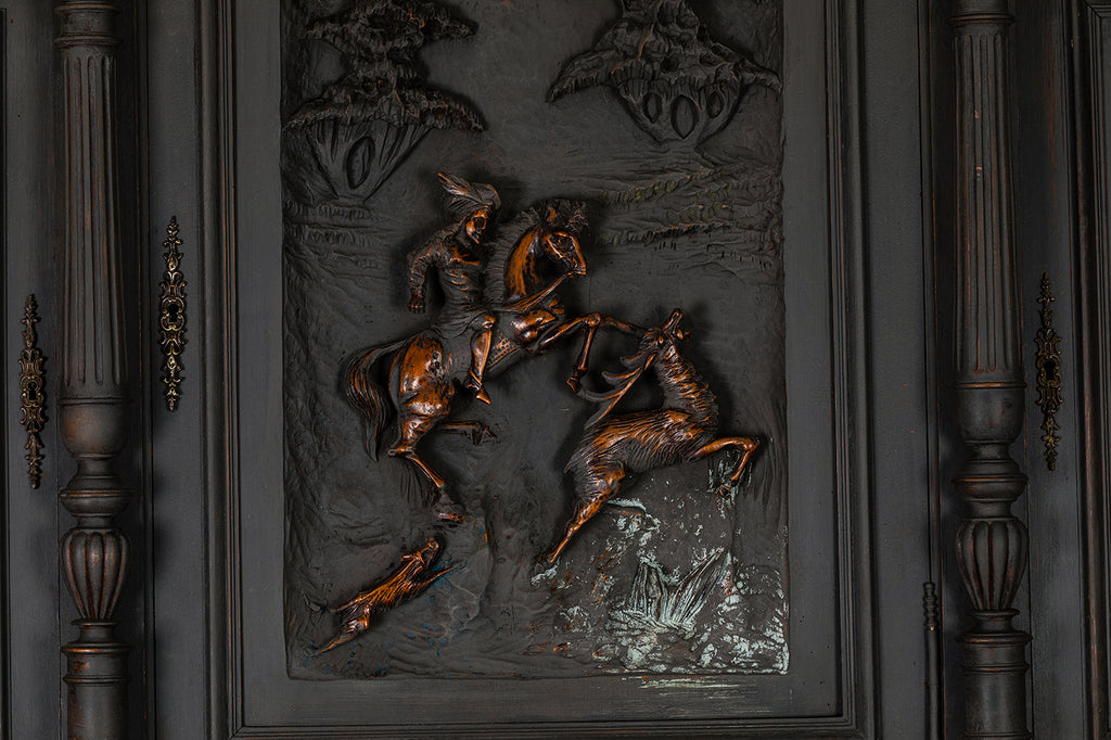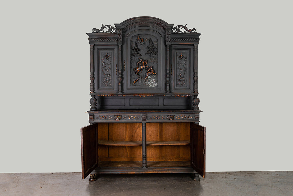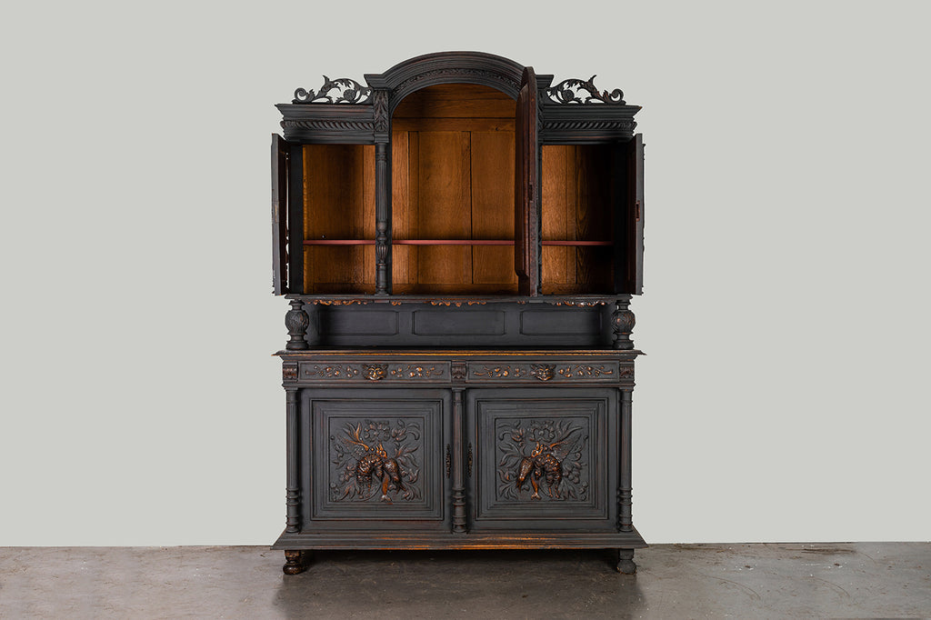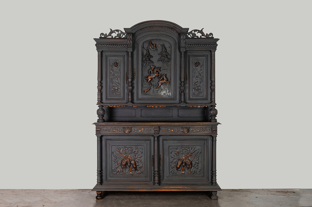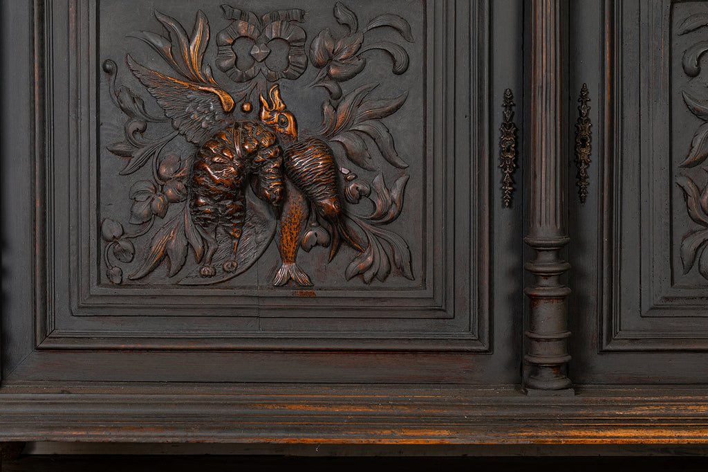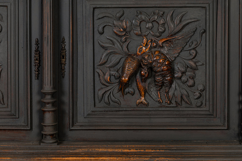Impressive 19th Century French painted walnut hunt cupboard. Arched top with carved doors divided by fluted pillars on a base fitted to frieze drawers and cupboards underneath. The panelled doors carved in high and low relief of traditional French hunting scene together with flowers, fish and game birds. A talking point….