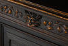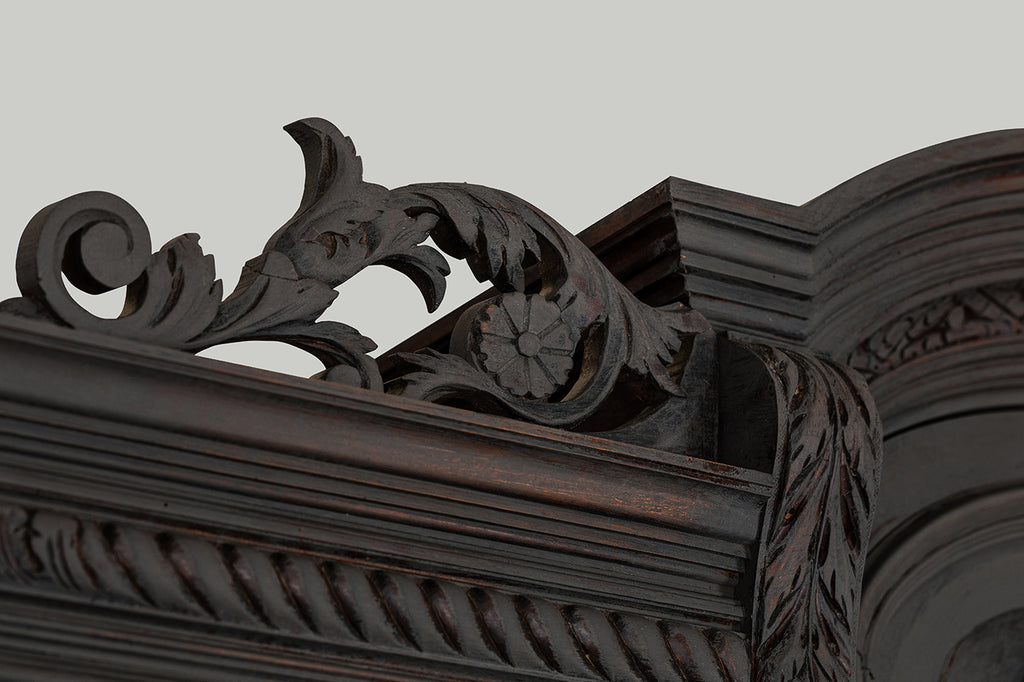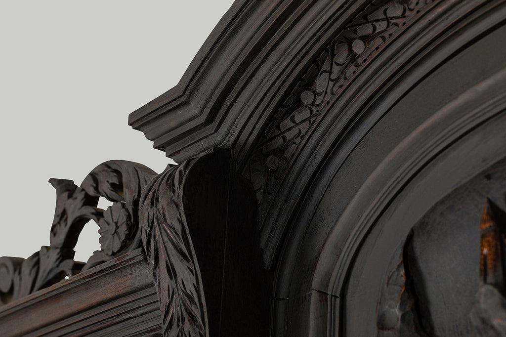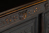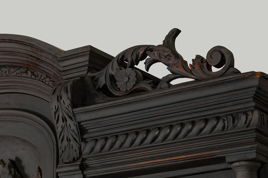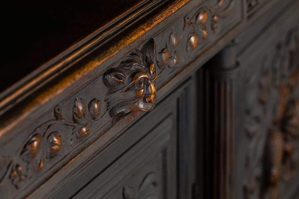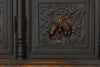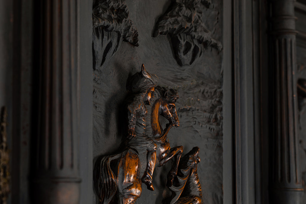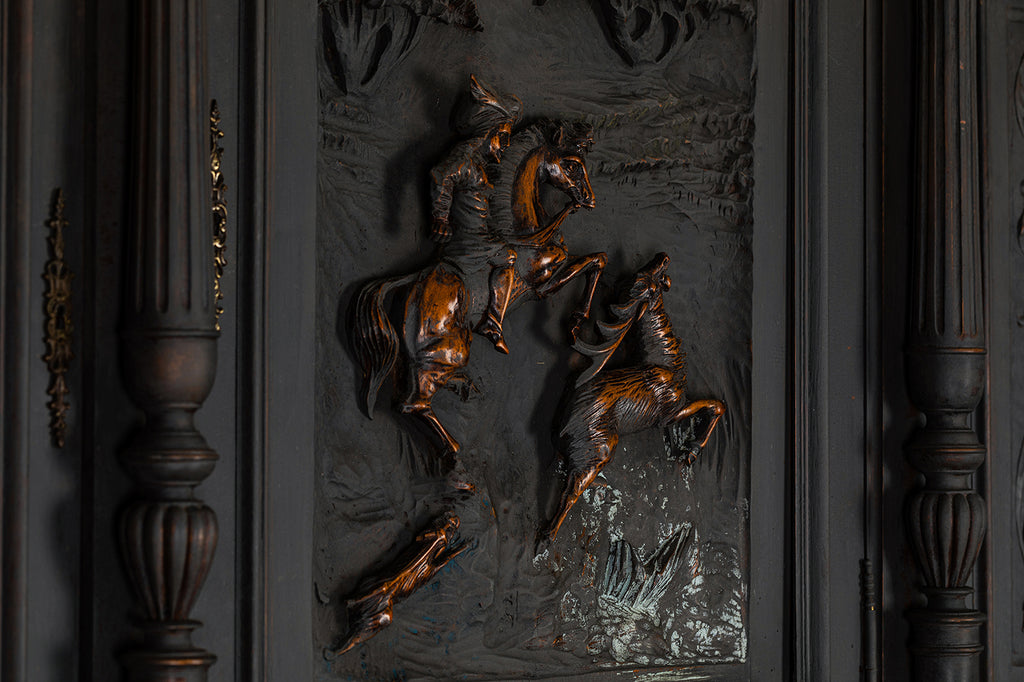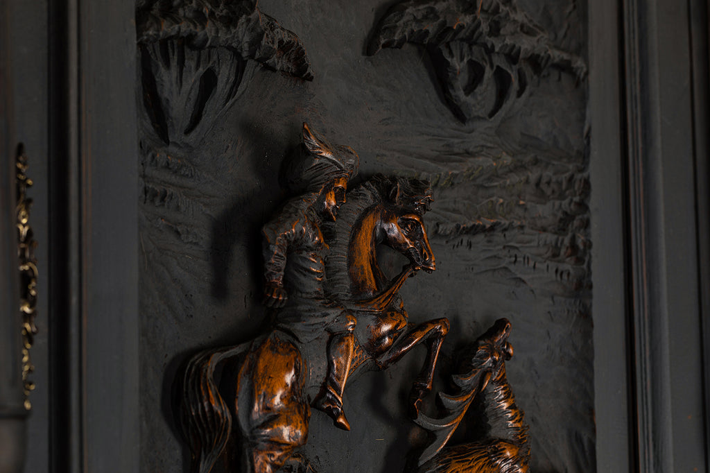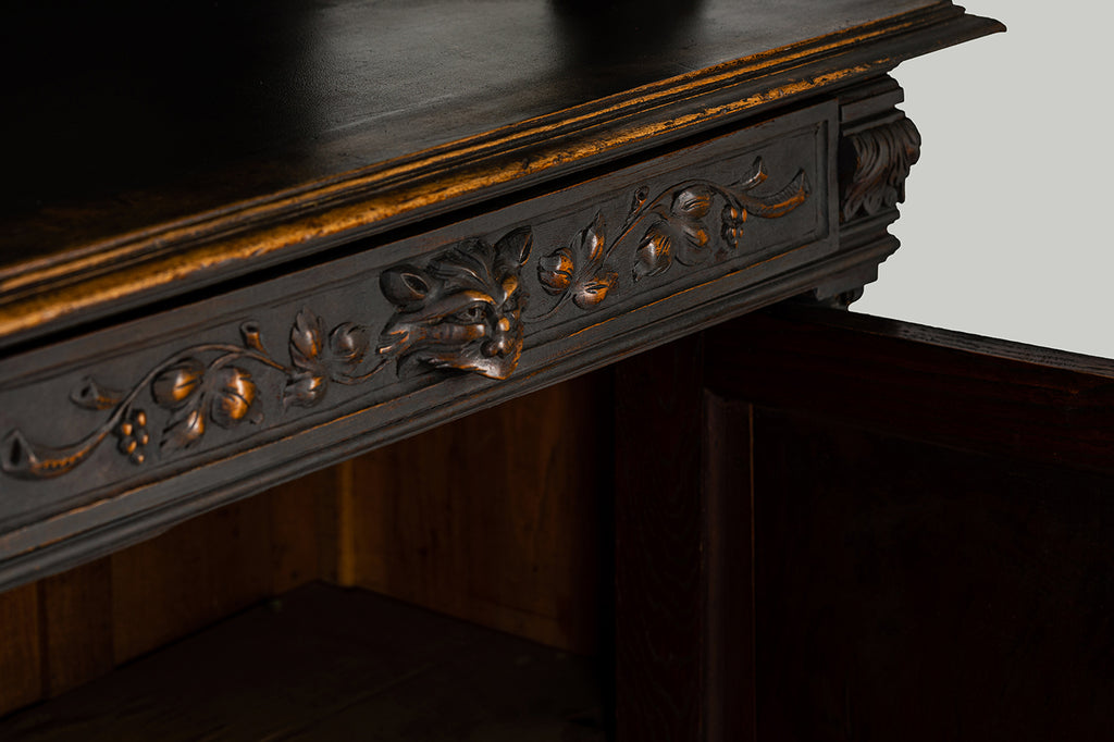 Impressive 19th Century French painted walnut hunt cupboard. Arched top with carved doors divided by fluted pillars on a base fitted to frieze drawers and cupboards underneath. The panelled doors carved in high and low relief of traditional French hunting scene together with flowers, fish and game birds. A talking point….