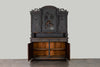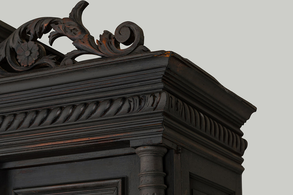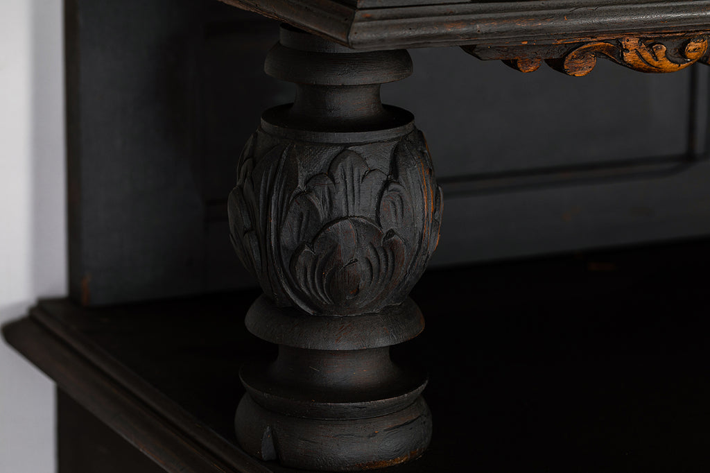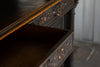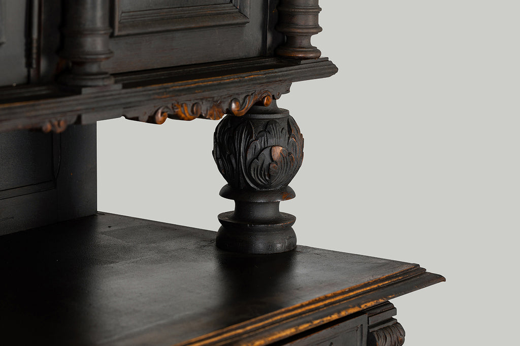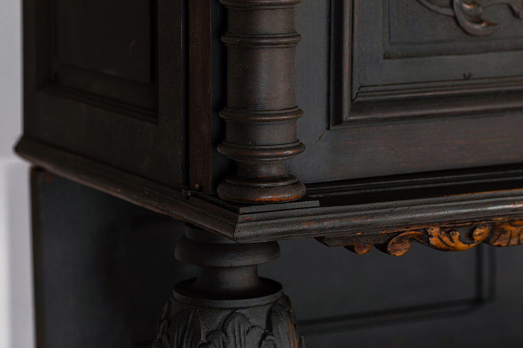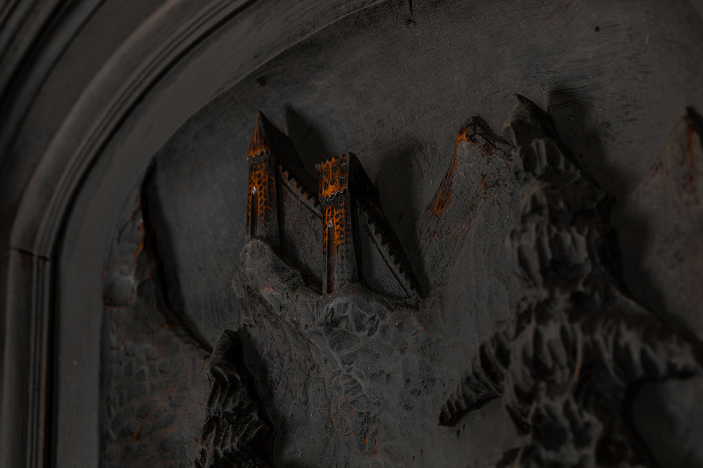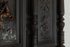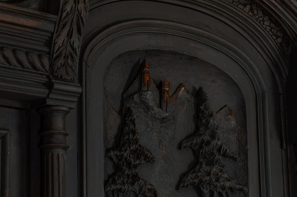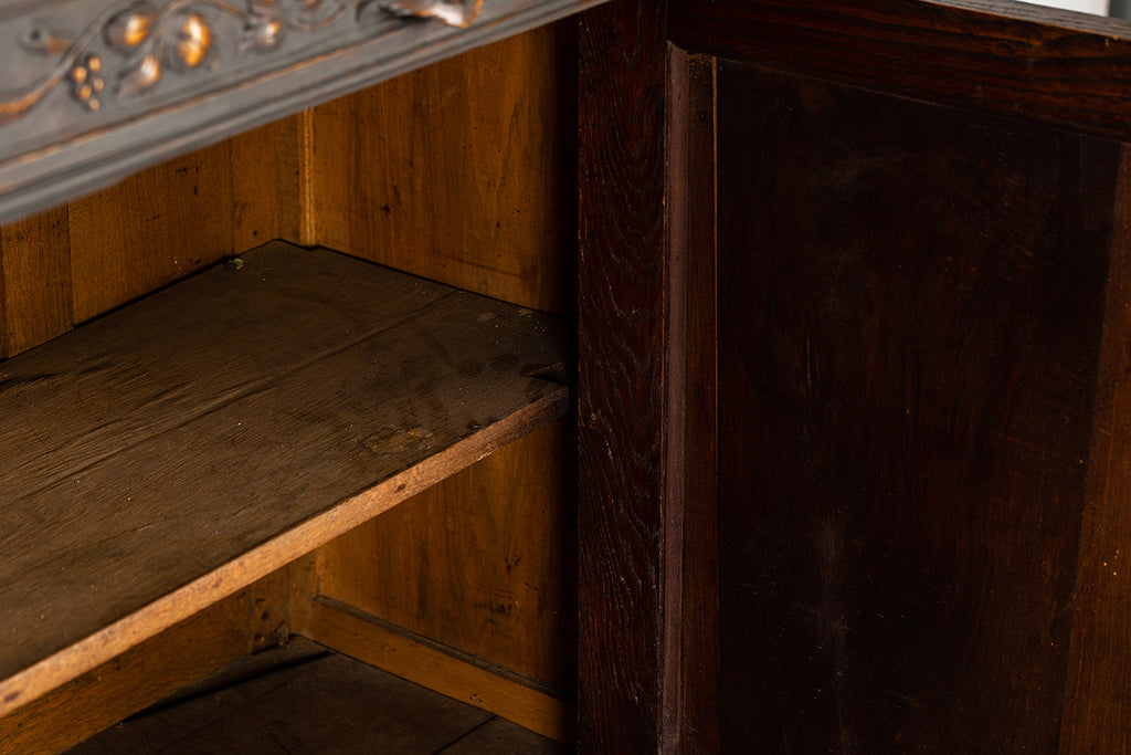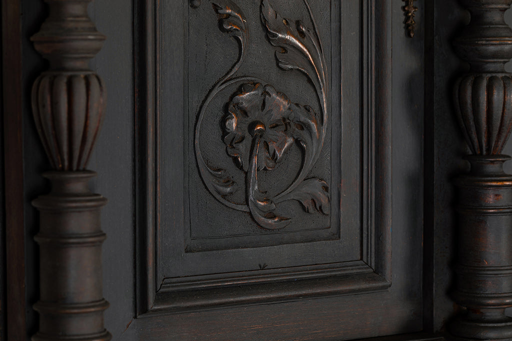 Impressive 19th Century French painted walnut hunt cupboard. Arched top with carved doors divided by fluted pillars on a base fitted to frieze drawers and cupboards underneath. The panelled doors carved in high and low relief of traditional French hunting scene together with flowers, fish and game birds. A talking point….
